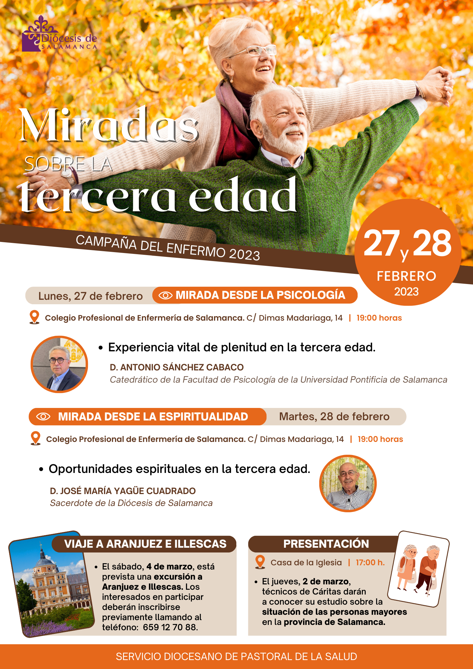 Y, como broche a estas jornadas, el Servicio de Pastoral de la Salud organiza una visita cultural a las localidades de Aranjuez e Illescas, el sábado 4 de marzo. Las personas interesadas en participar deben inscribirse previamente llamando al teléfono: 659 12 70 88.