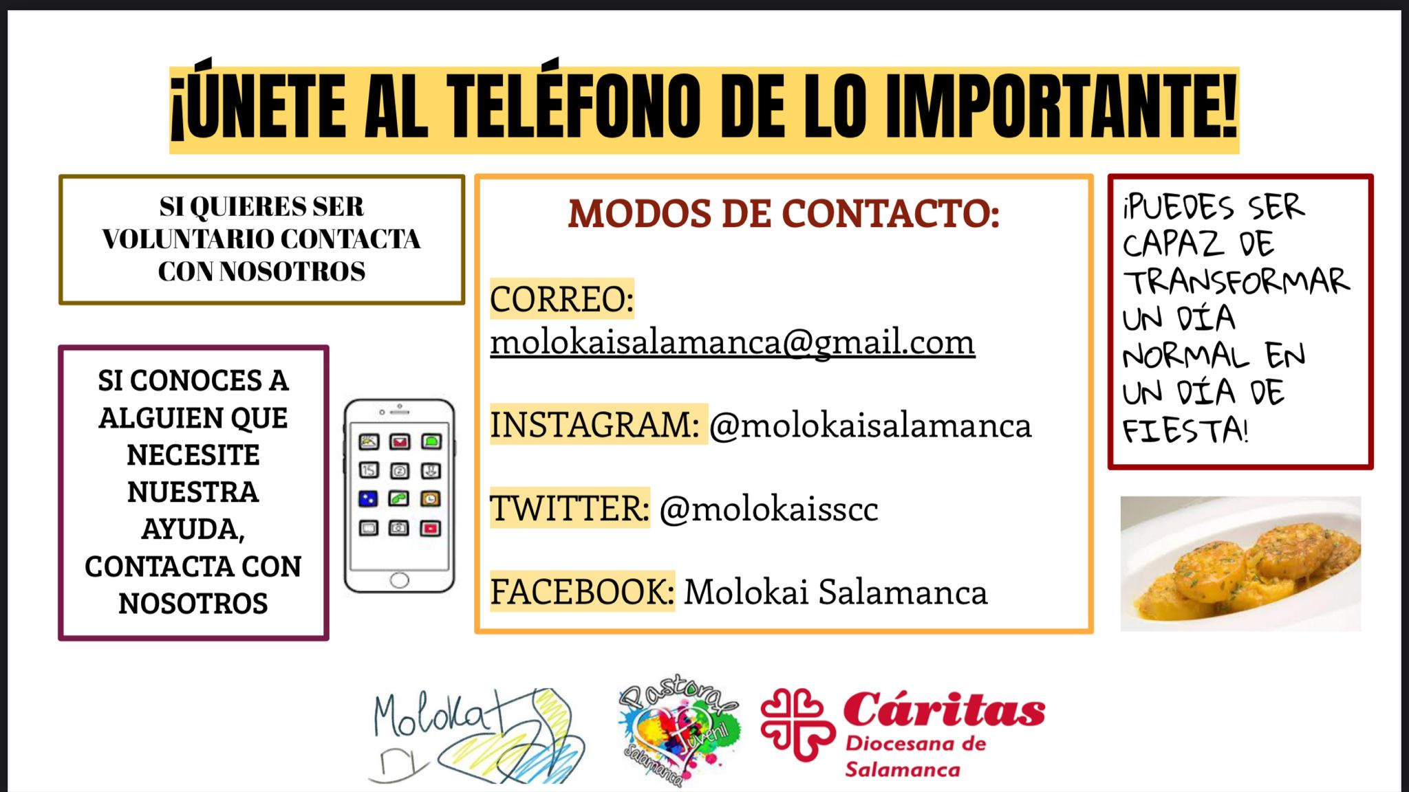 Asimismo, se plantean dos objetivos. Por un lado, “que todos aquellos que quieran hacerse voluntarios puedan ponerse en contacto con nosotros a través de las redes sociales o por el correo electrónico: molokaisalamanca@gmail.com. Y por otro, los que quieran ser llamados, “que pueden ponerse en contacto por los mismos canales o a través de Cáritas”. El “Teléfono amarillo” está destinado a la población en general que se sienta sola, sean jóvenes, adultos o personas mayores, como subrayan desde Molokai. Una vez tengan el listado de personas a las que se llamará, “marcarán una franja horaria para contactar con ellos”, determina esta responsable.
