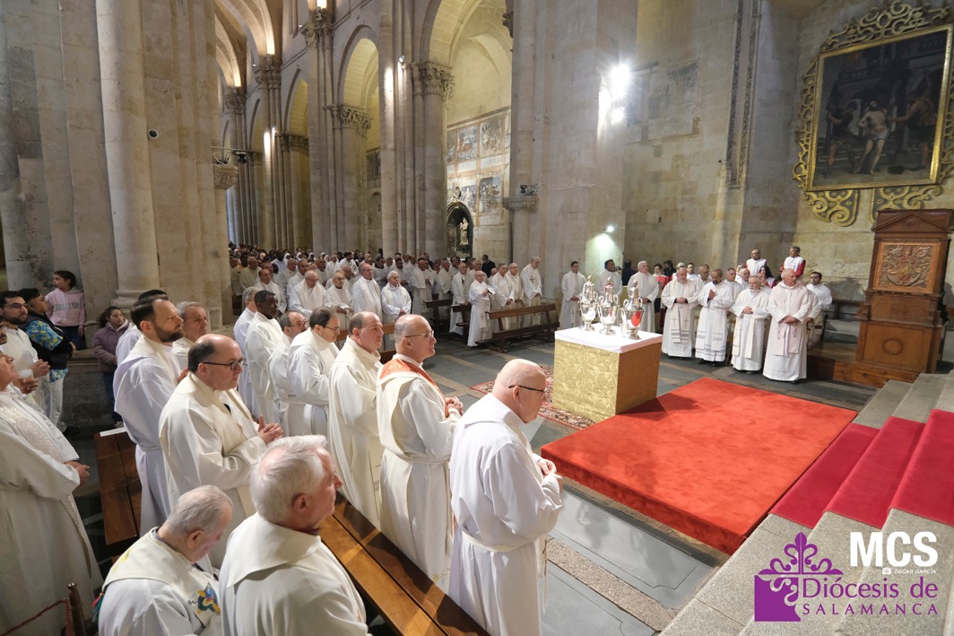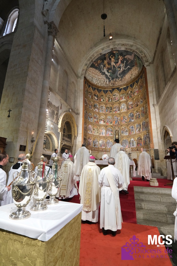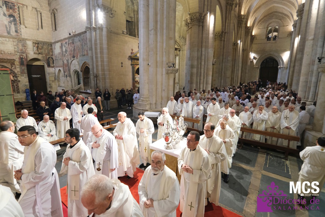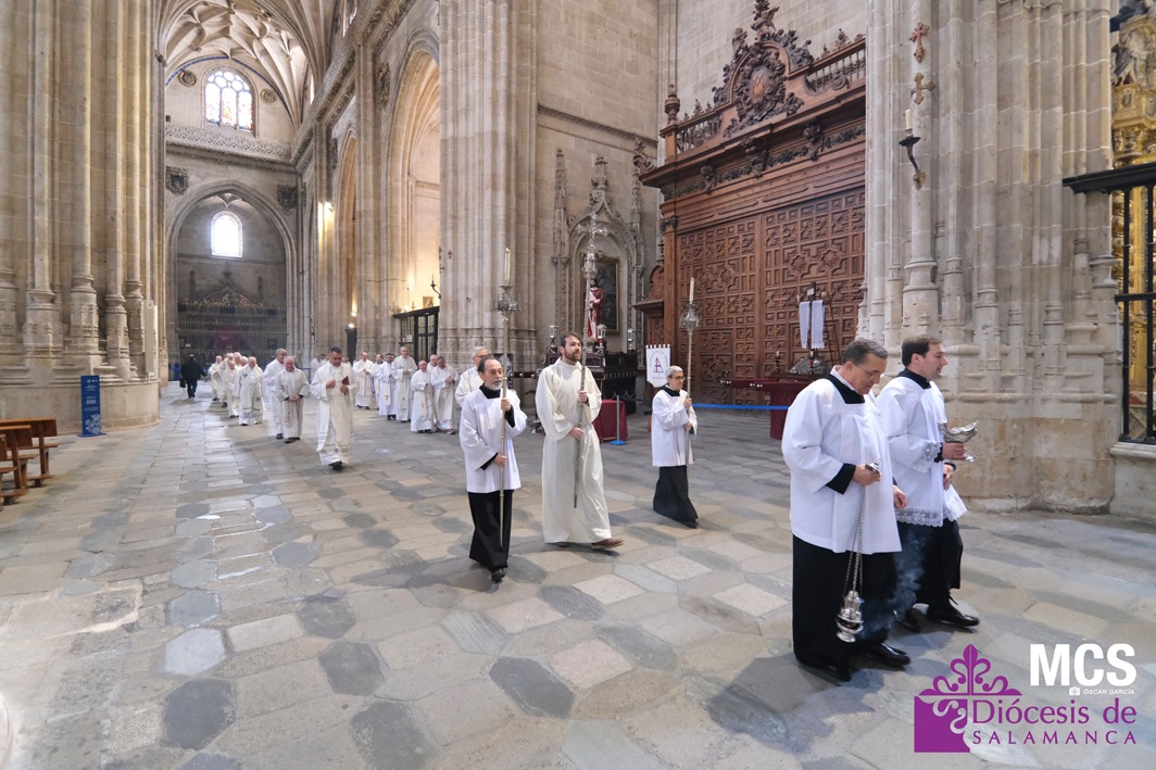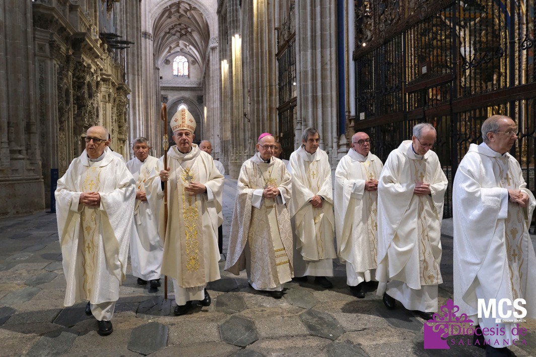 El presbiterio de la Diócesis de Salamanca hizo su entrada a la Catedral Vieja con el canto del Pueblo de Reyes minutos antes de comenzar la Misa Crismal que se celebra cada Miércoles Santo. Junto a ellos, el obispo, Mons. José Luis Retana, que presidió la eucaristía, concelebrada por numerosos sacerdotes diocesanos y religiosos pertenecientes a diversas órdenes. En esta ocasión, también estaba presente el obispo auxiliar emérito de San Bernardino (California), Mons. Rutilio del Riego Jáñez.