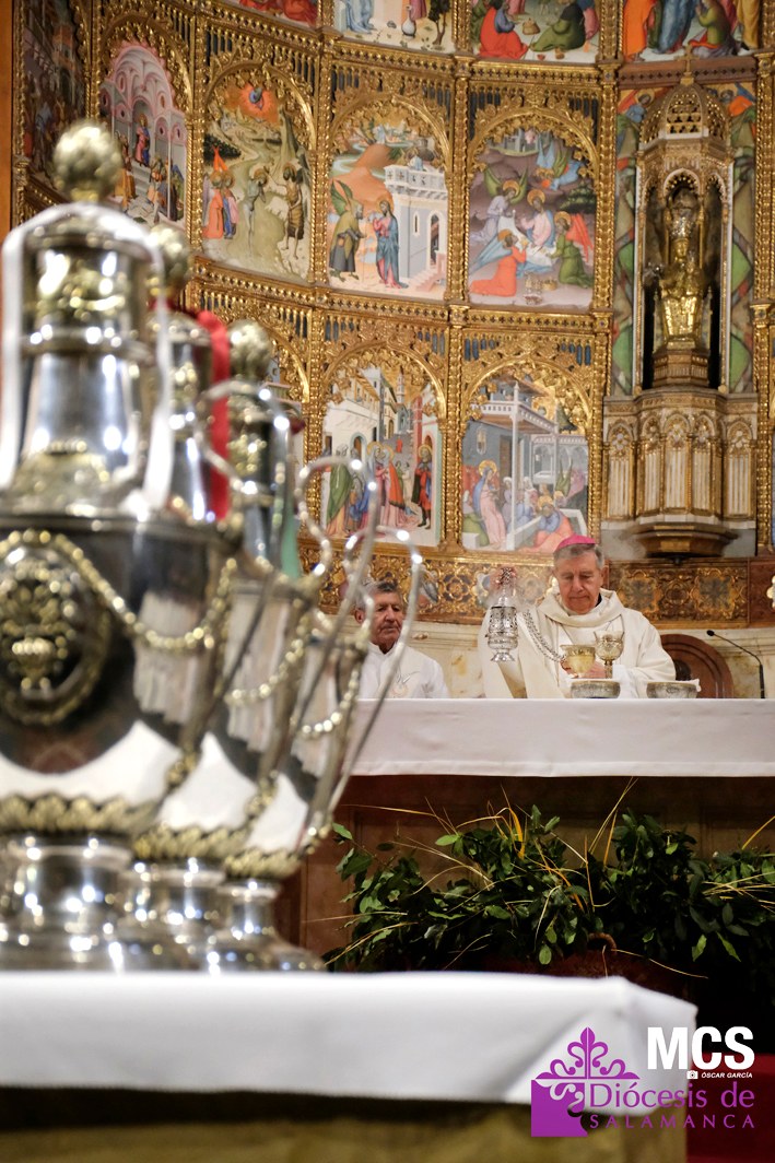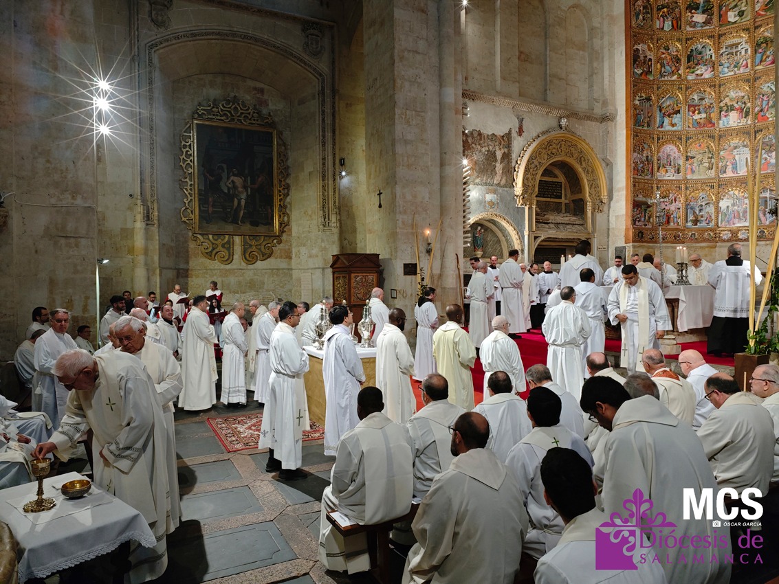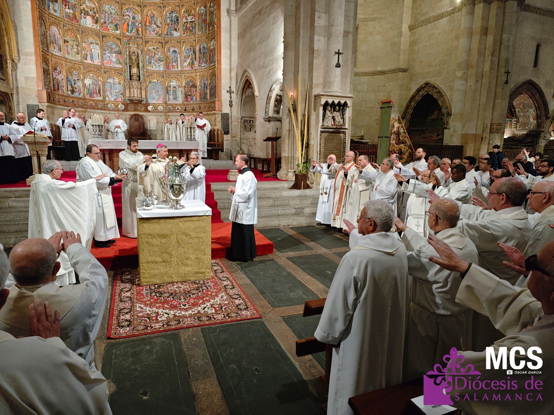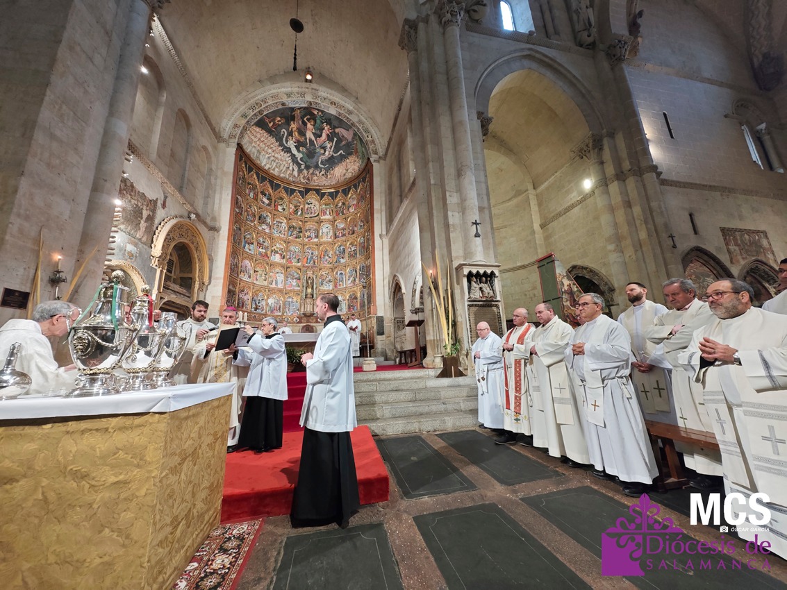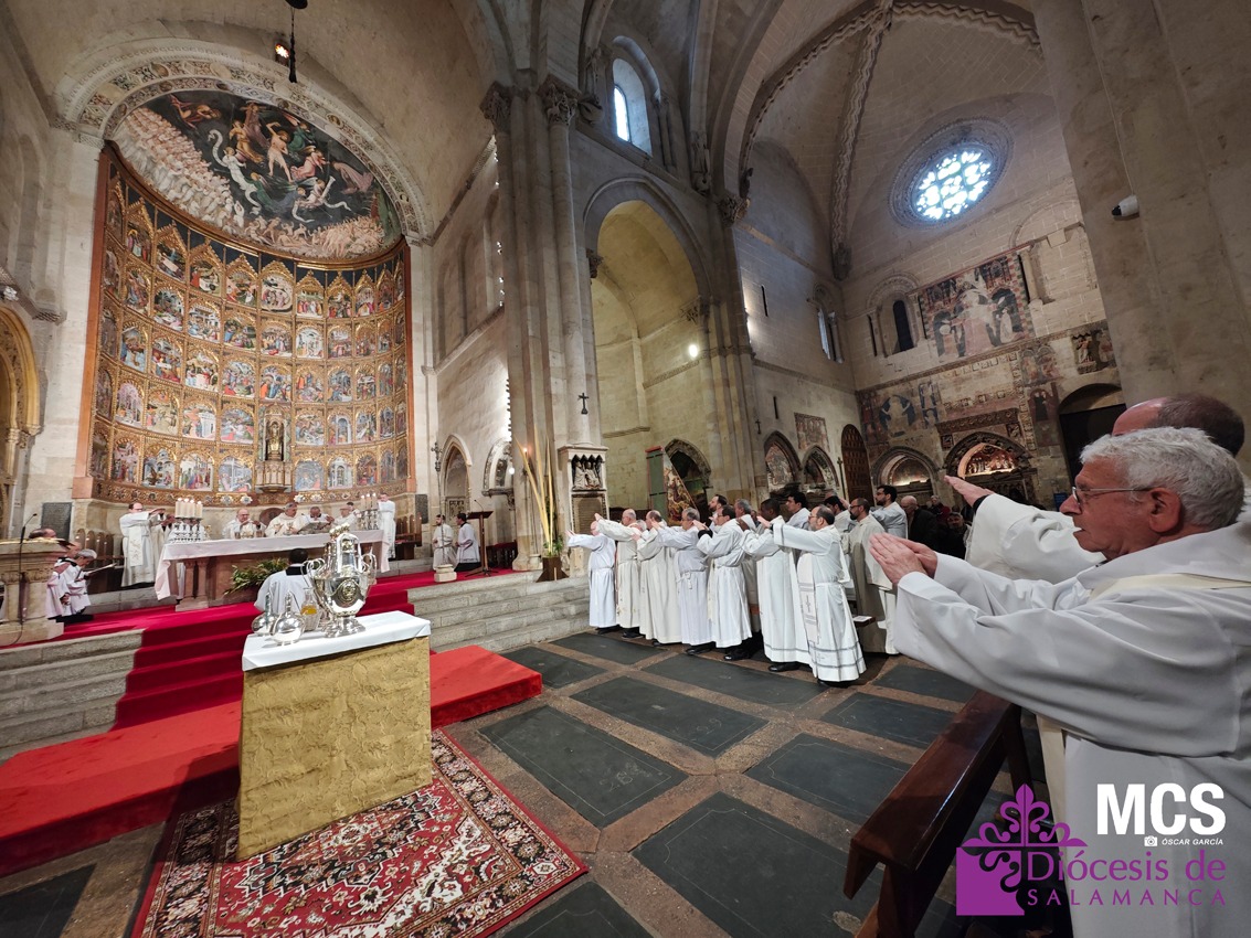 El presbiterio de la Diócesis de Salamanca hizo su entrada a la Catedral Vieja con el canto del Pueblo de Reyes minutos antes de comenzar la Misa Crismal que se celebra cada Miércoles Santo. Junto a ellos, el obispo, Mons. José Luis Retana, que presidió la eucaristía, concelebrada por numerosos sacerdotes diocesanos y religiosos pertenecientes a diversas órdenes. En esta ocasión, también estaba presente el obispo auxiliar emérito de San Bernardino (California), Mons. Rutilio del Riego Jáñez.