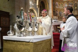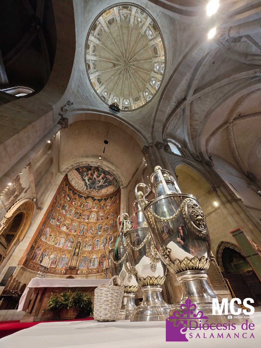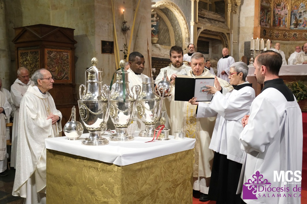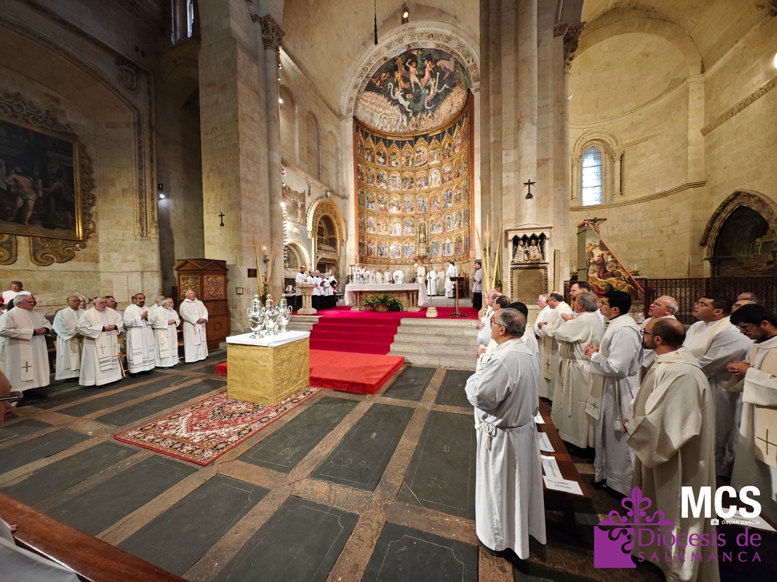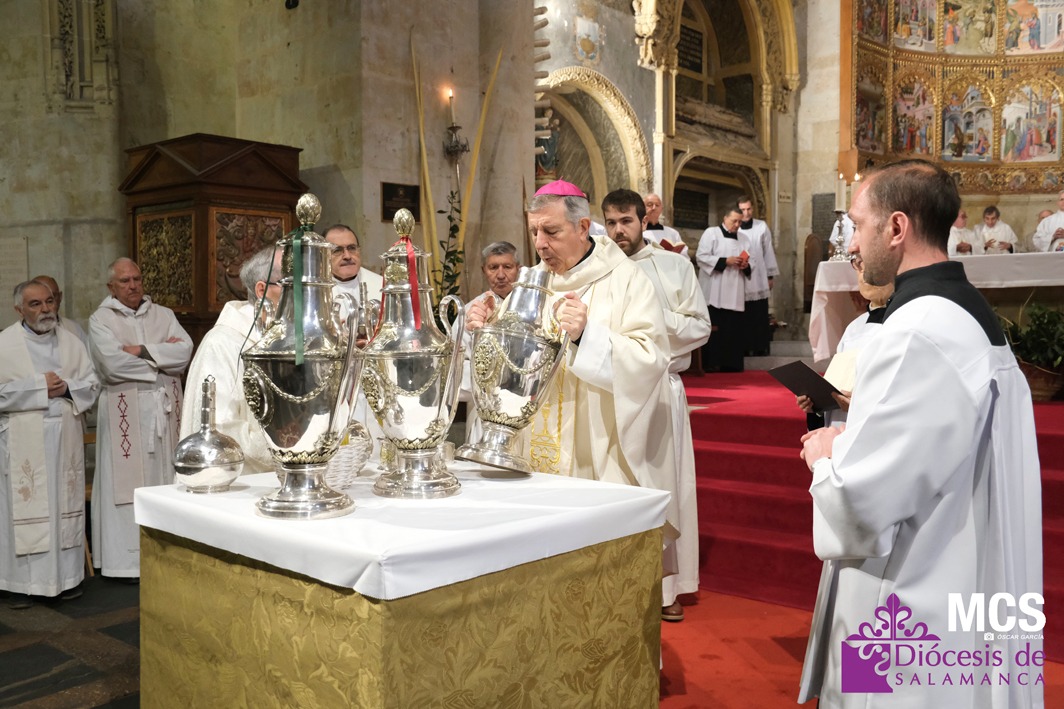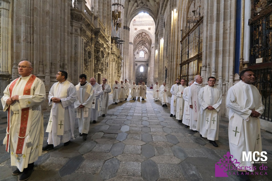 El presbiterio de la Diócesis de Salamanca hizo su entrada a la Catedral Vieja con el canto del Pueblo de Reyes minutos antes de comenzar la Misa Crismal que se celebra cada Miércoles Santo. Junto a ellos, el obispo, Mons. José Luis Retana, que presidió la eucaristía, concelebrada por numerosos sacerdotes diocesanos y religiosos pertenecientes a diversas órdenes. En esta ocasión, también estaba presente el obispo auxiliar emérito de San Bernardino (California), Mons. Rutilio del Riego Jáñez.