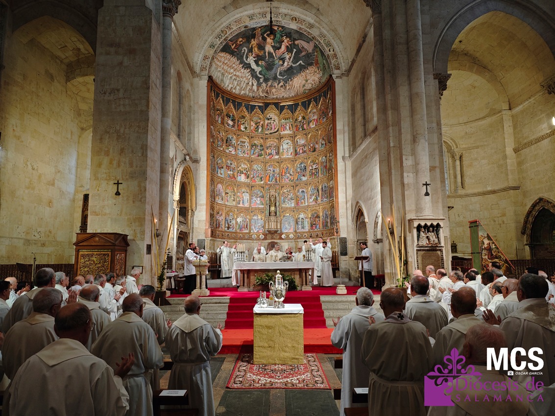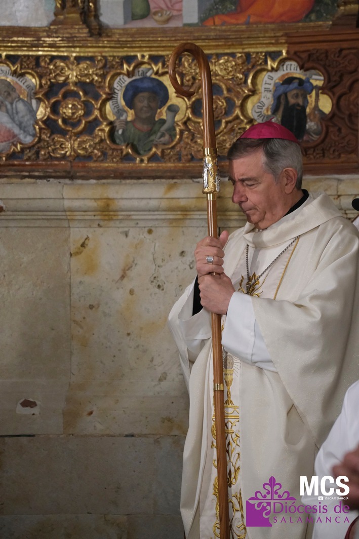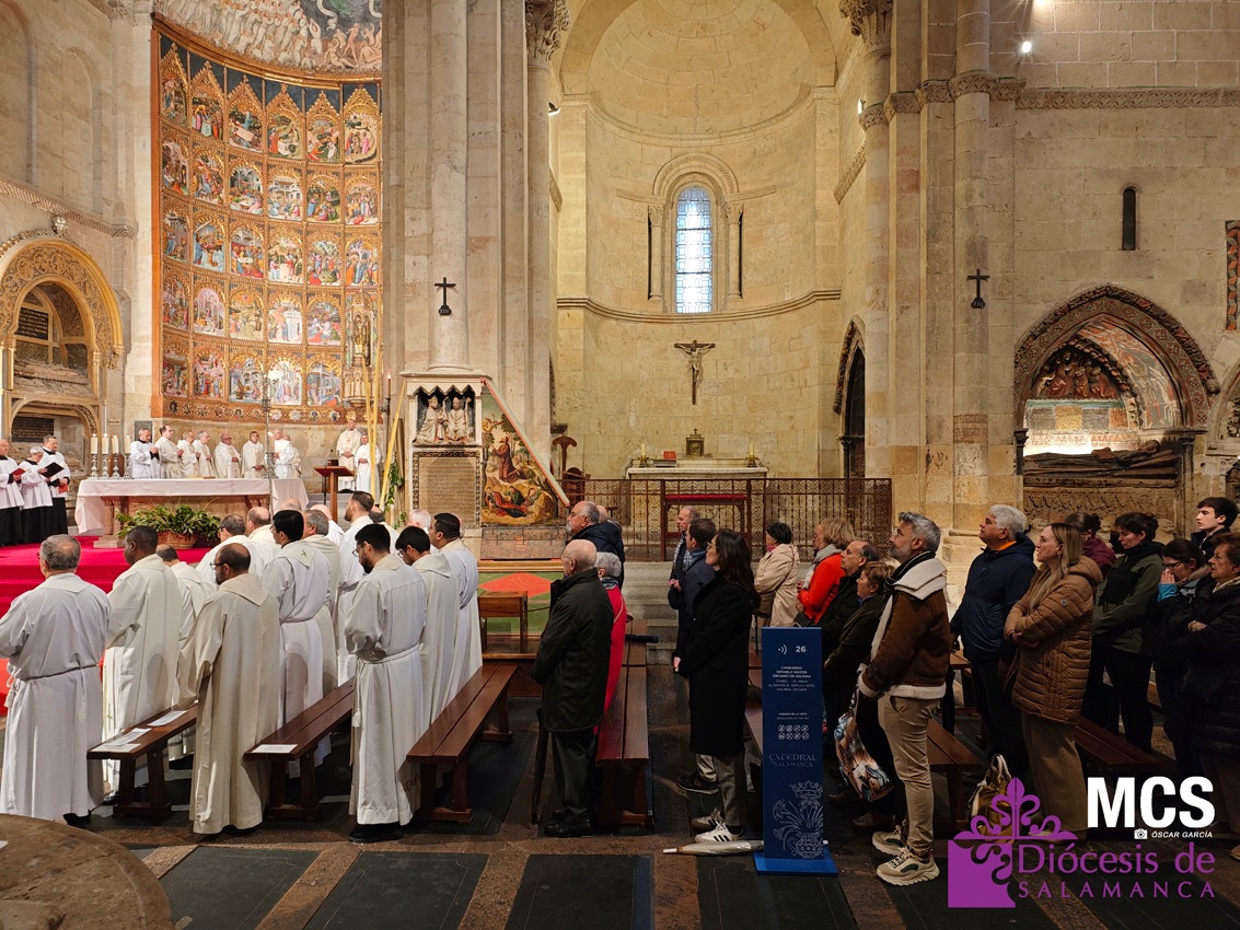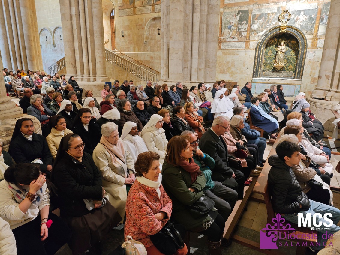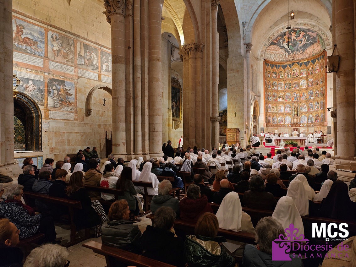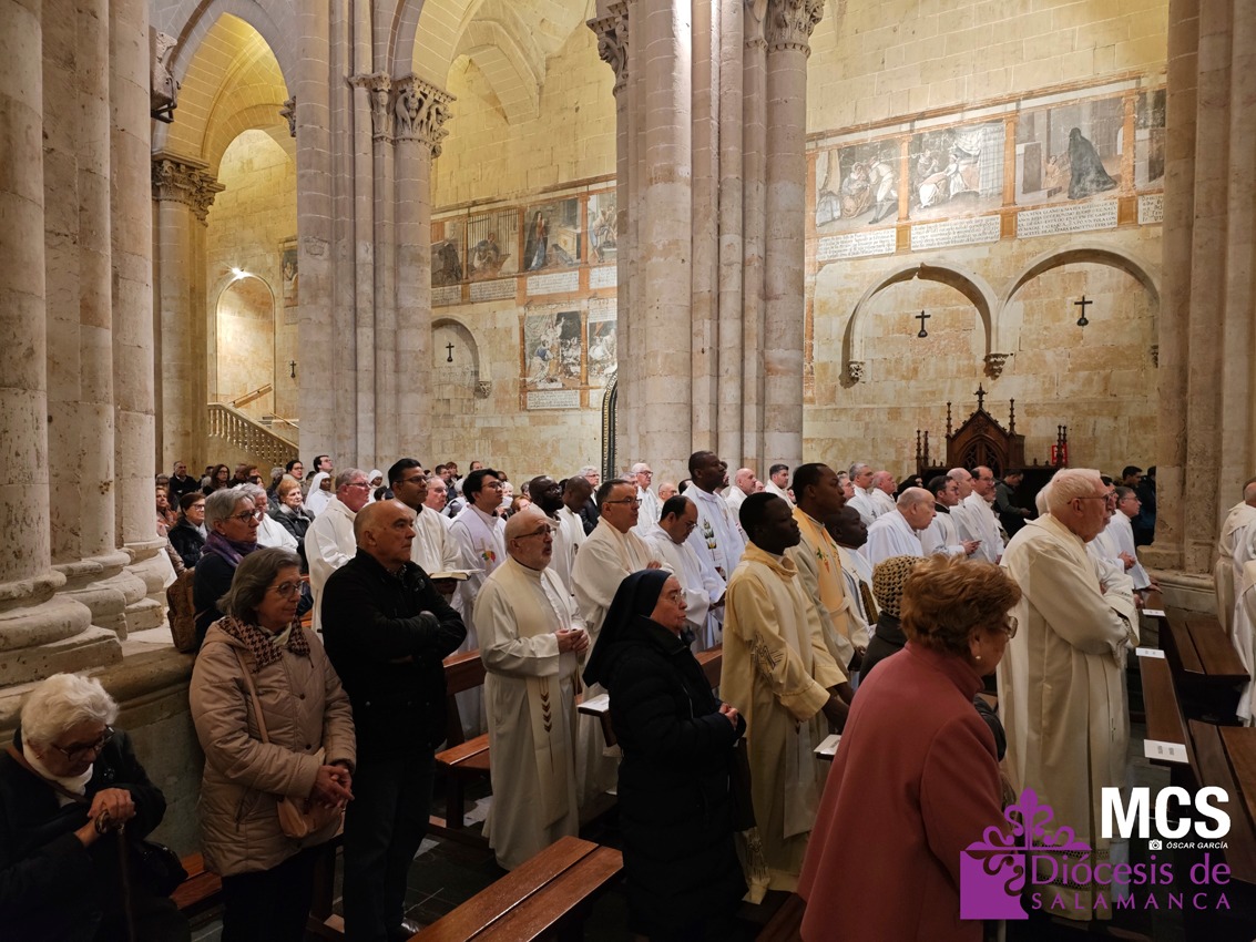 El obispo se ha dirigido a los presbíteros, diáconos, consagrados y laicos con un saludo lleno de “gratitud y afecto”, celebrando la riqueza de vocaciones que configuran la Iglesia que peregrina en Salamanca: “Es una preciosa expresión de lo que significa la Iglesia… verdadera comunión de vocaciones distintas y complementarias en toda su riqueza”.
