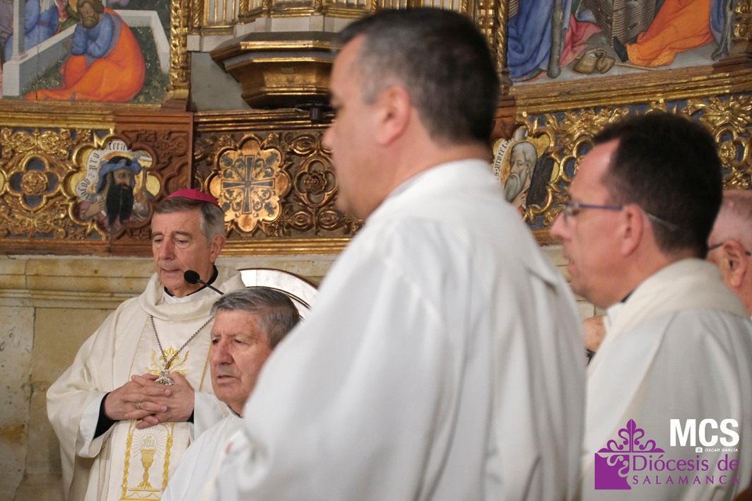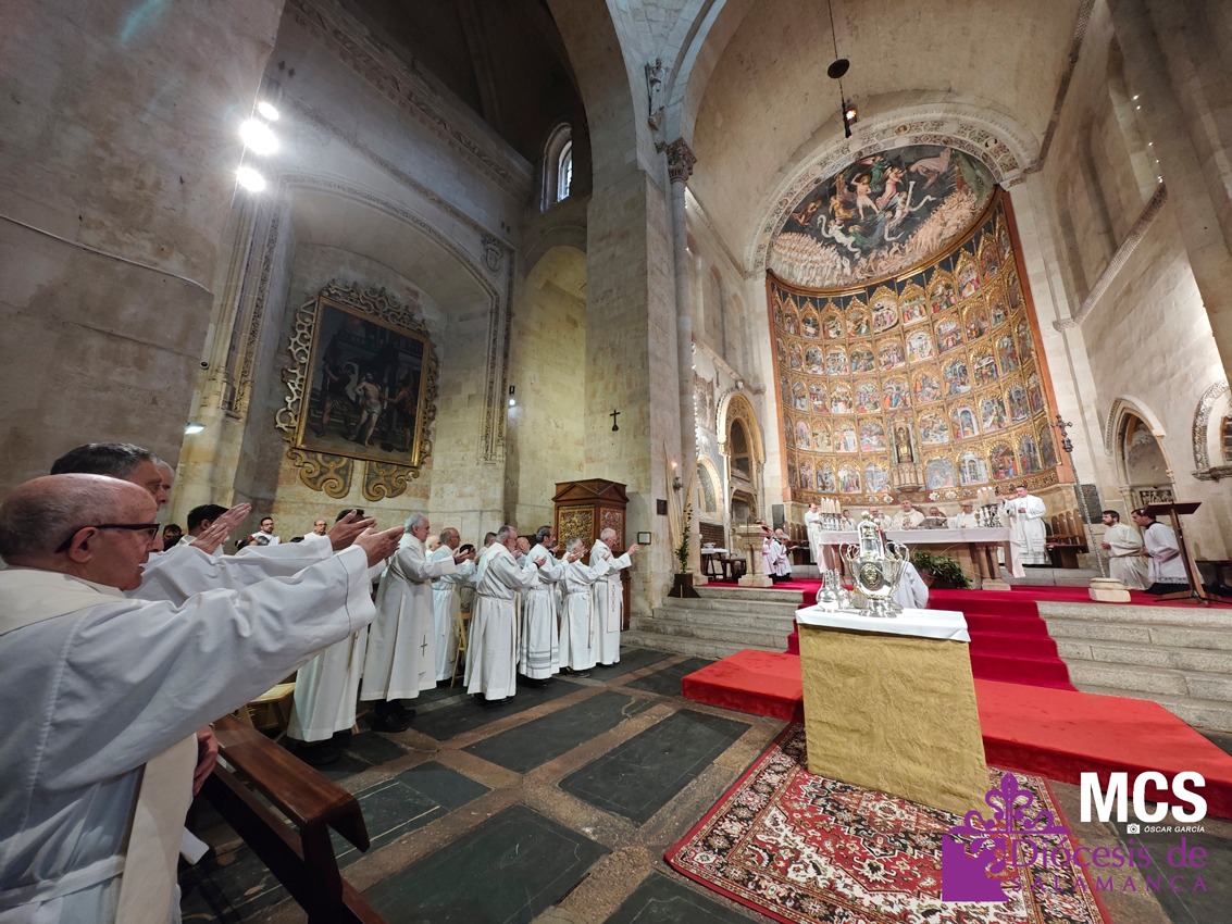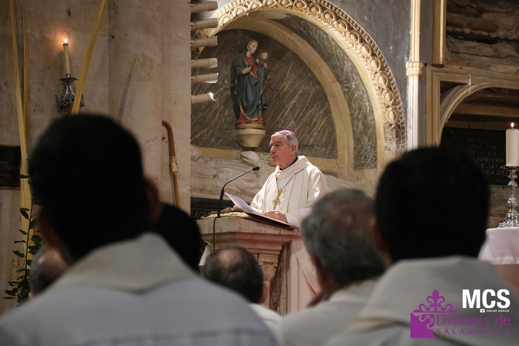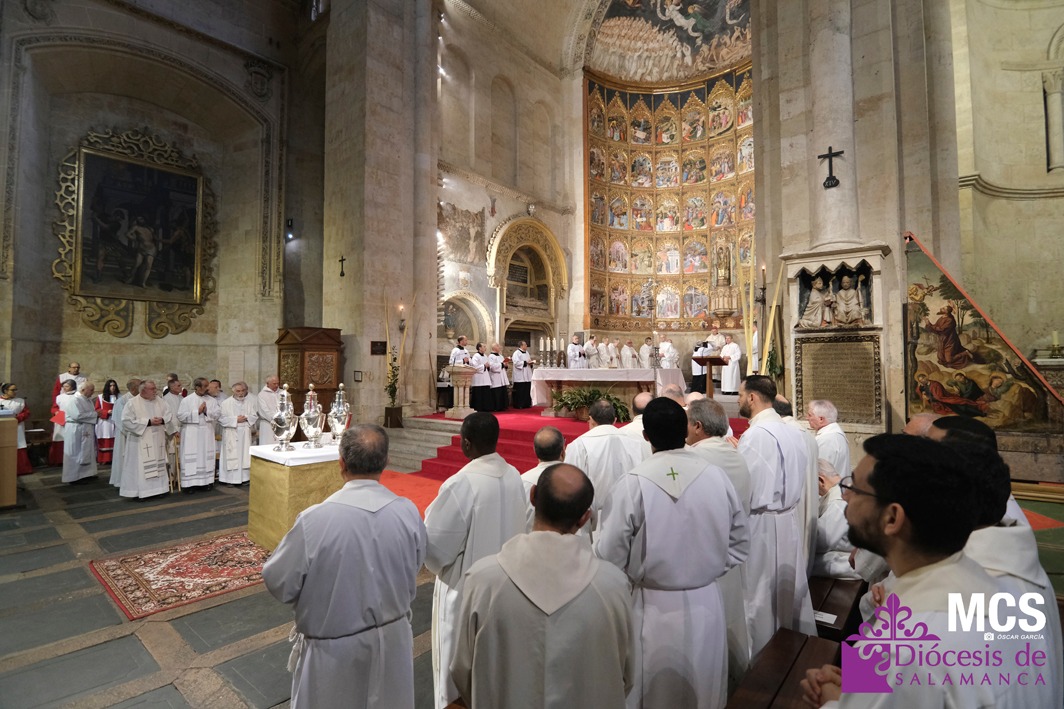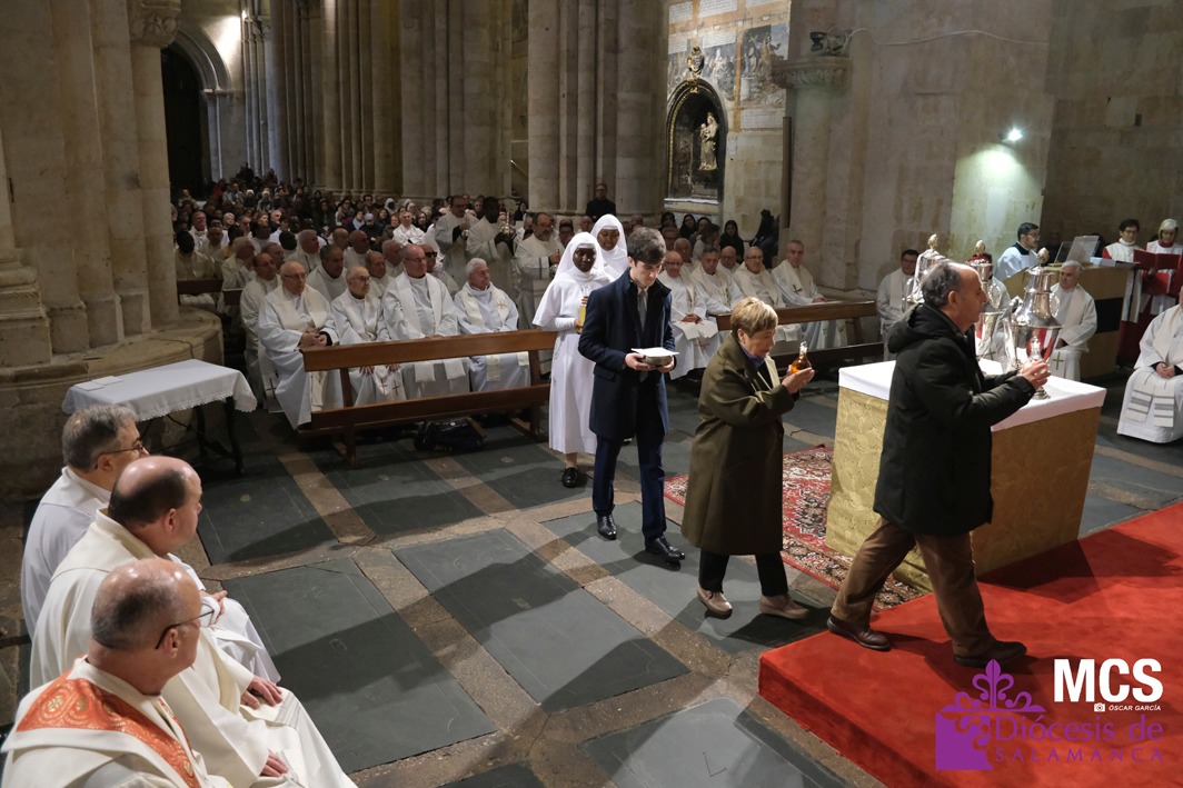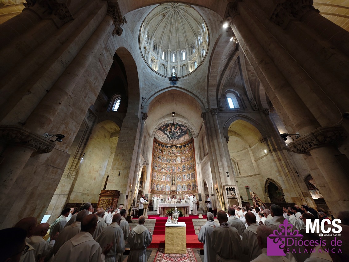 El obispo se ha dirigido a los presbíteros, diáconos, consagrados y laicos con un saludo lleno de “gratitud y afecto”, celebrando la riqueza de vocaciones que configuran la Iglesia que peregrina en Salamanca: “Es una preciosa expresión de lo que significa la Iglesia… verdadera comunión de vocaciones distintas y complementarias en toda su riqueza”.