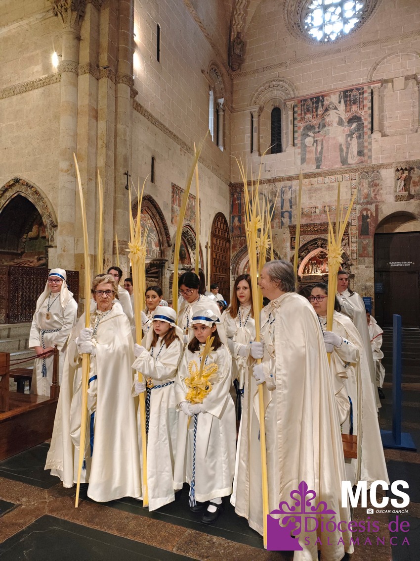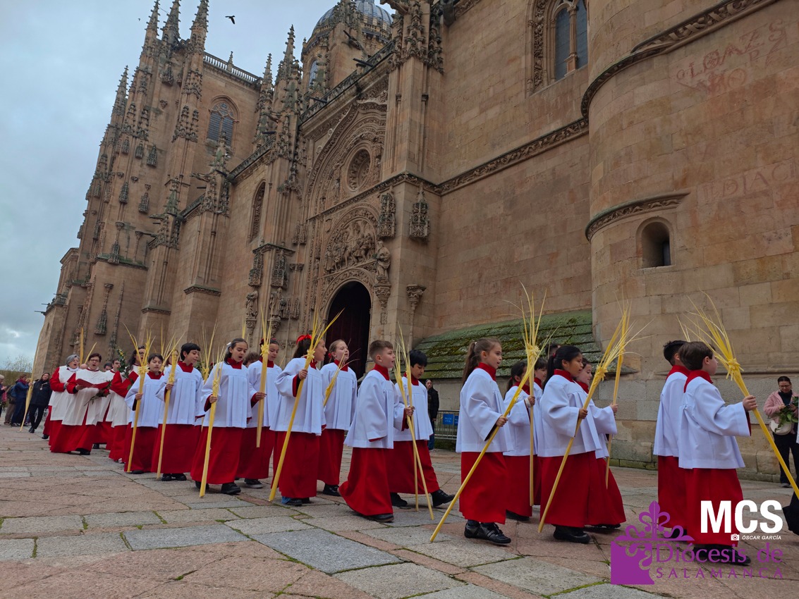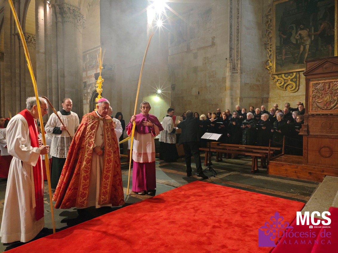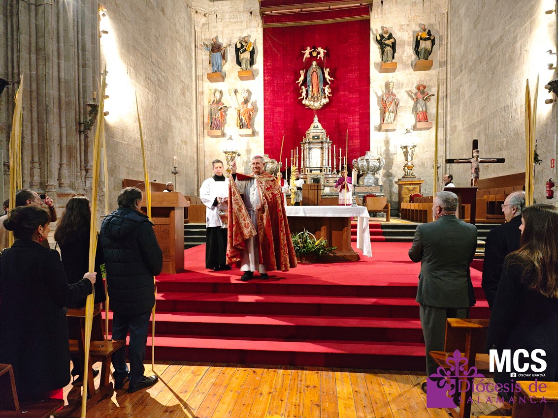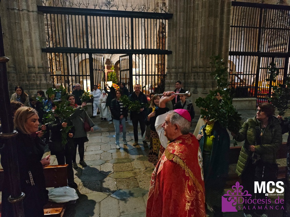 La celebración del Domingo de Ramos comenzó en la Catedral Nueva de Salamanca con la bendición de las palmas por parte del obispo, Mons. José Luis Retana, y tras una sencilla procesión hasta la Catedral Vieja, comenzó la eucaristía.