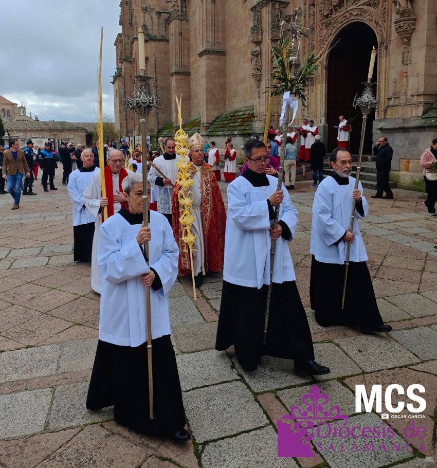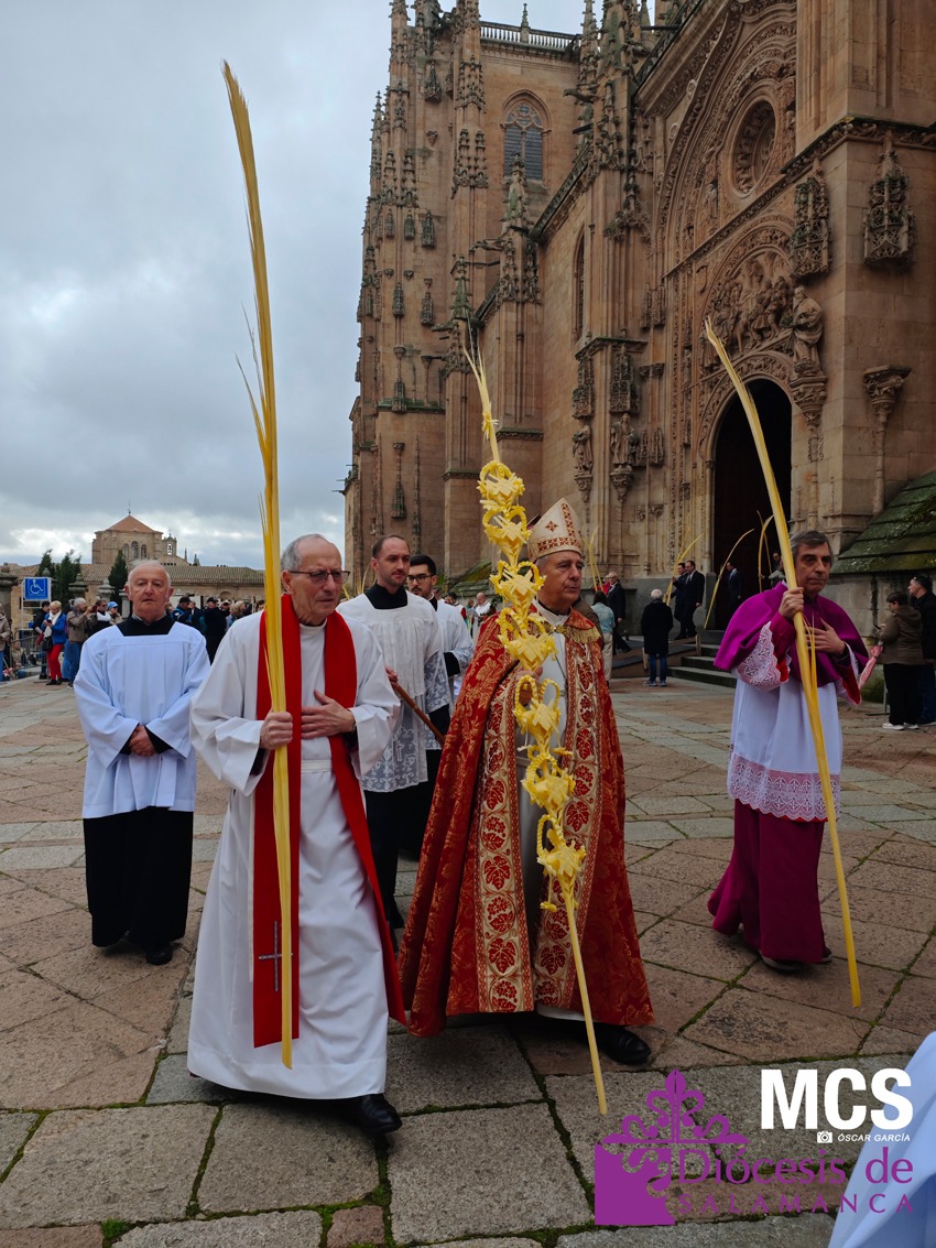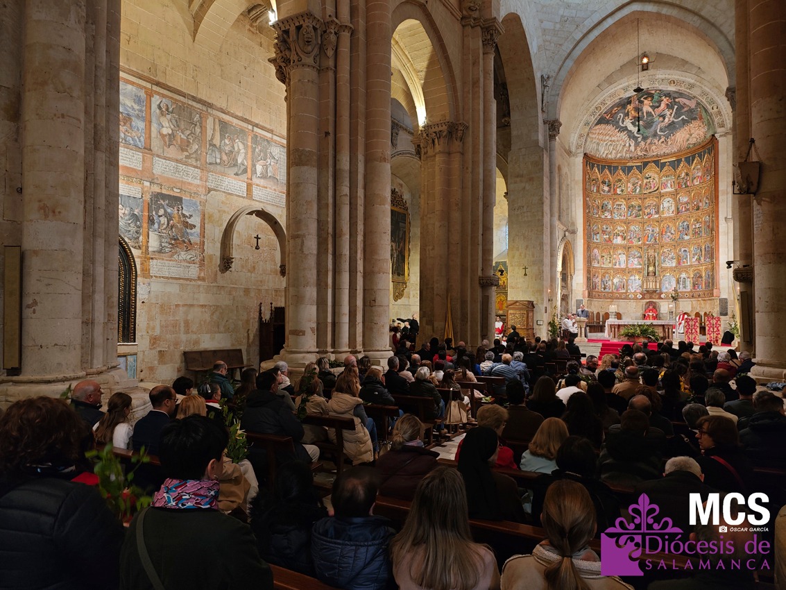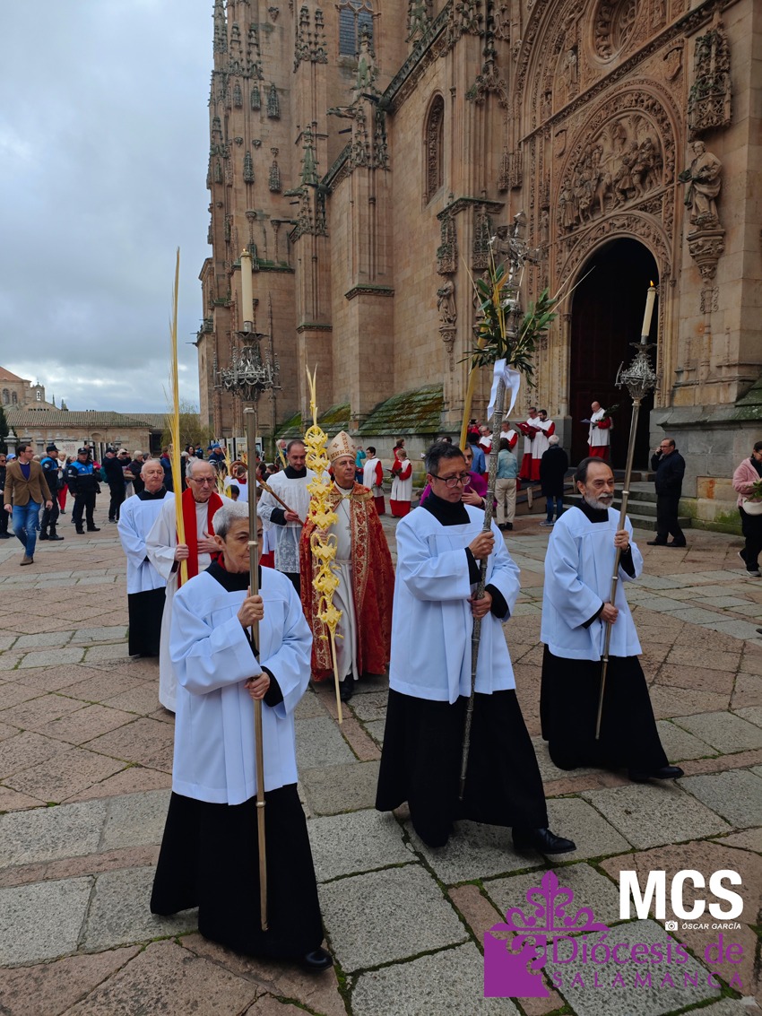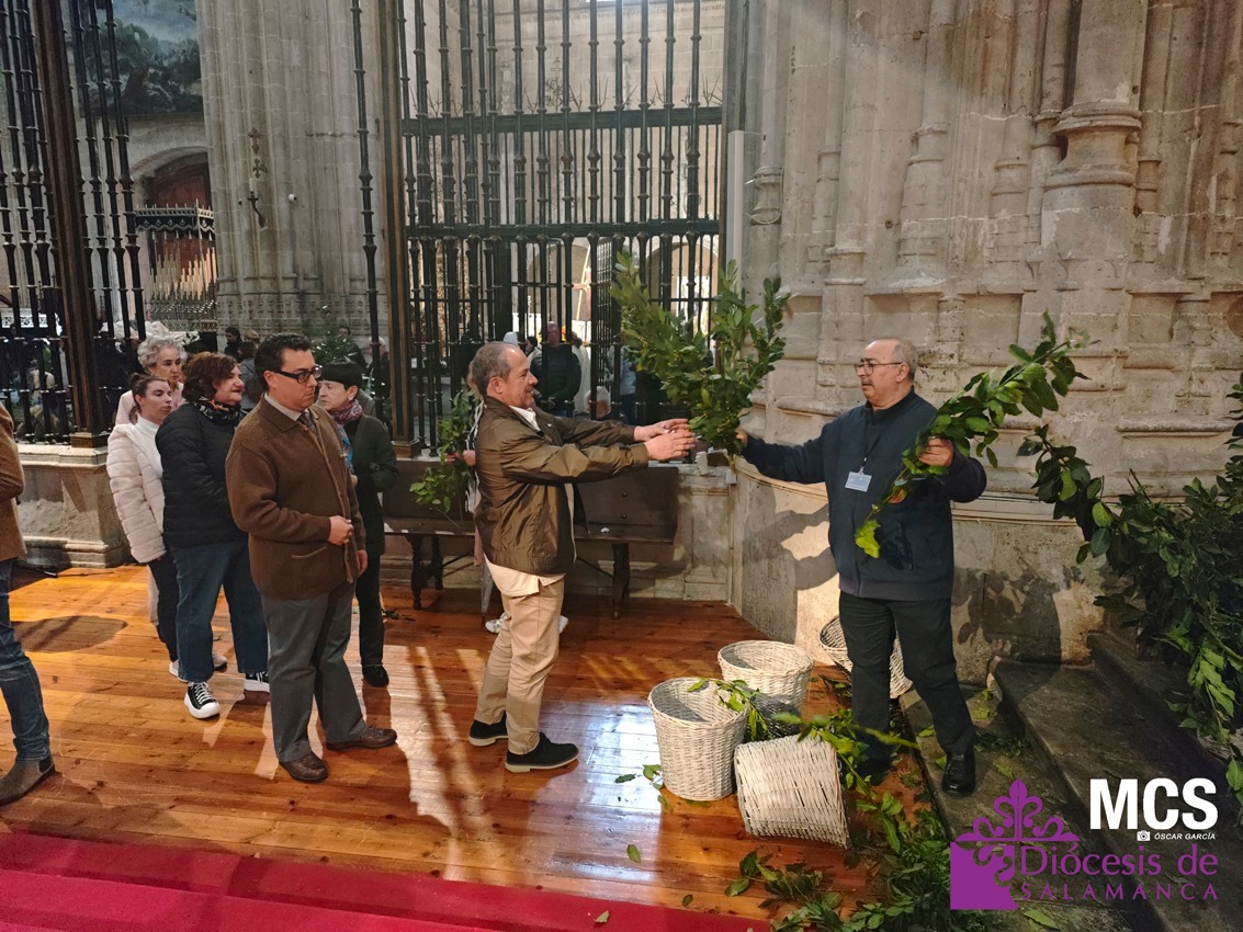 La celebración del Domingo de Ramos comenzó en la Catedral Nueva de Salamanca con la bendición de las palmas por parte del obispo, Mons. José Luis Retana, y tras una sencilla procesión hasta la Catedral Vieja, comenzó la eucaristía.