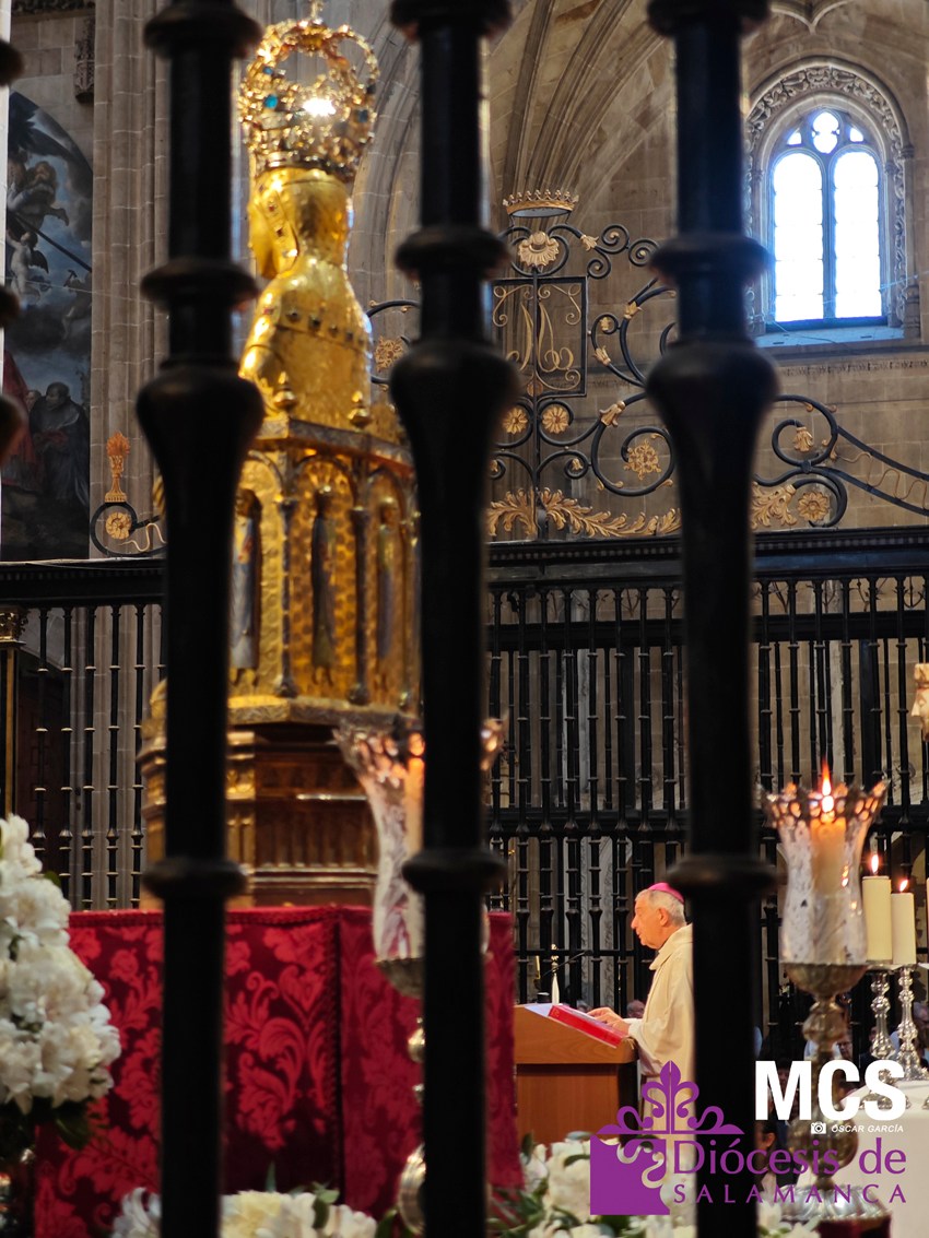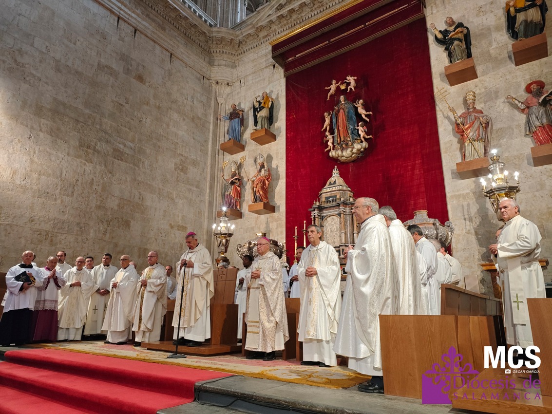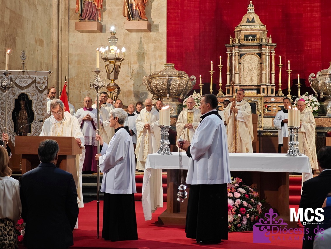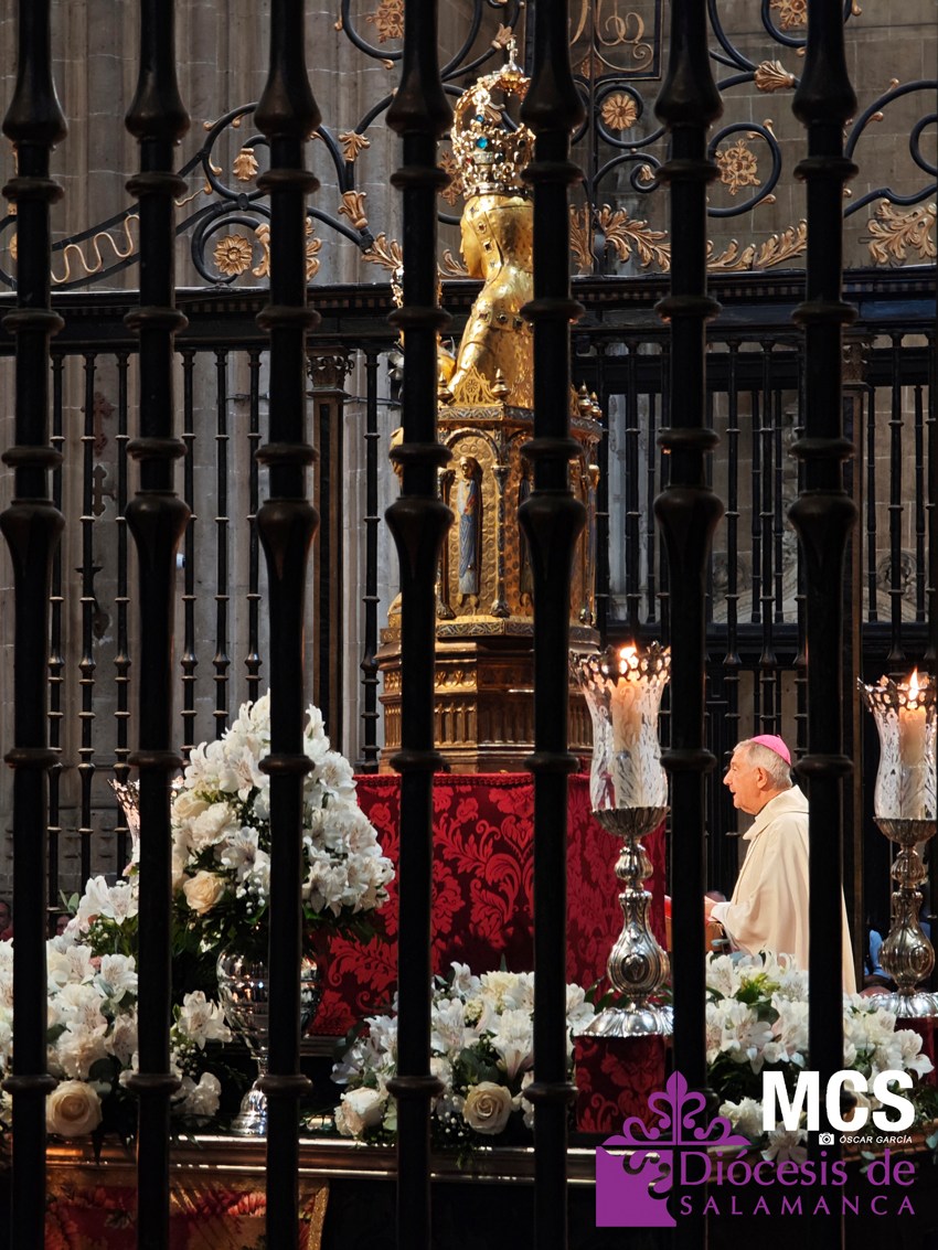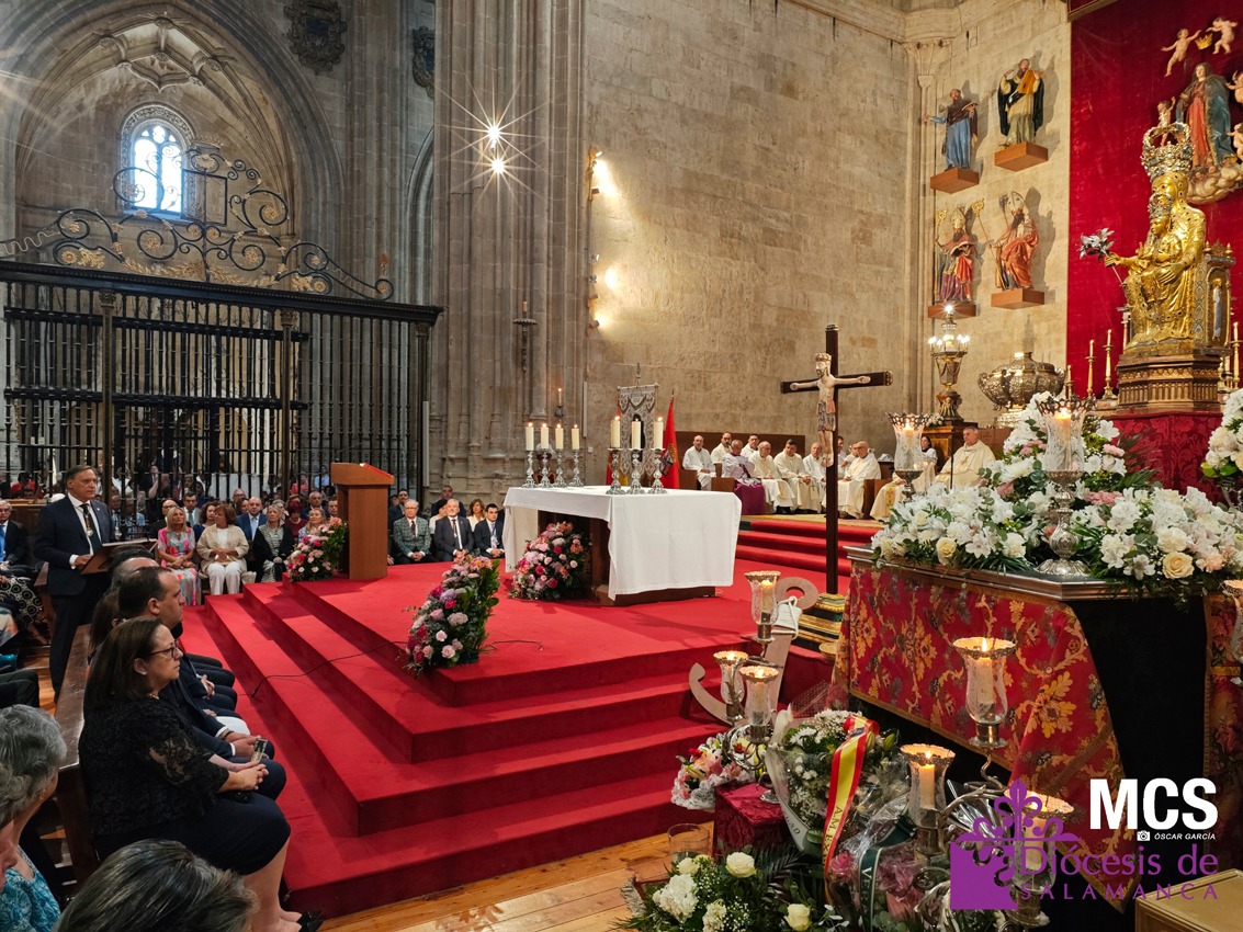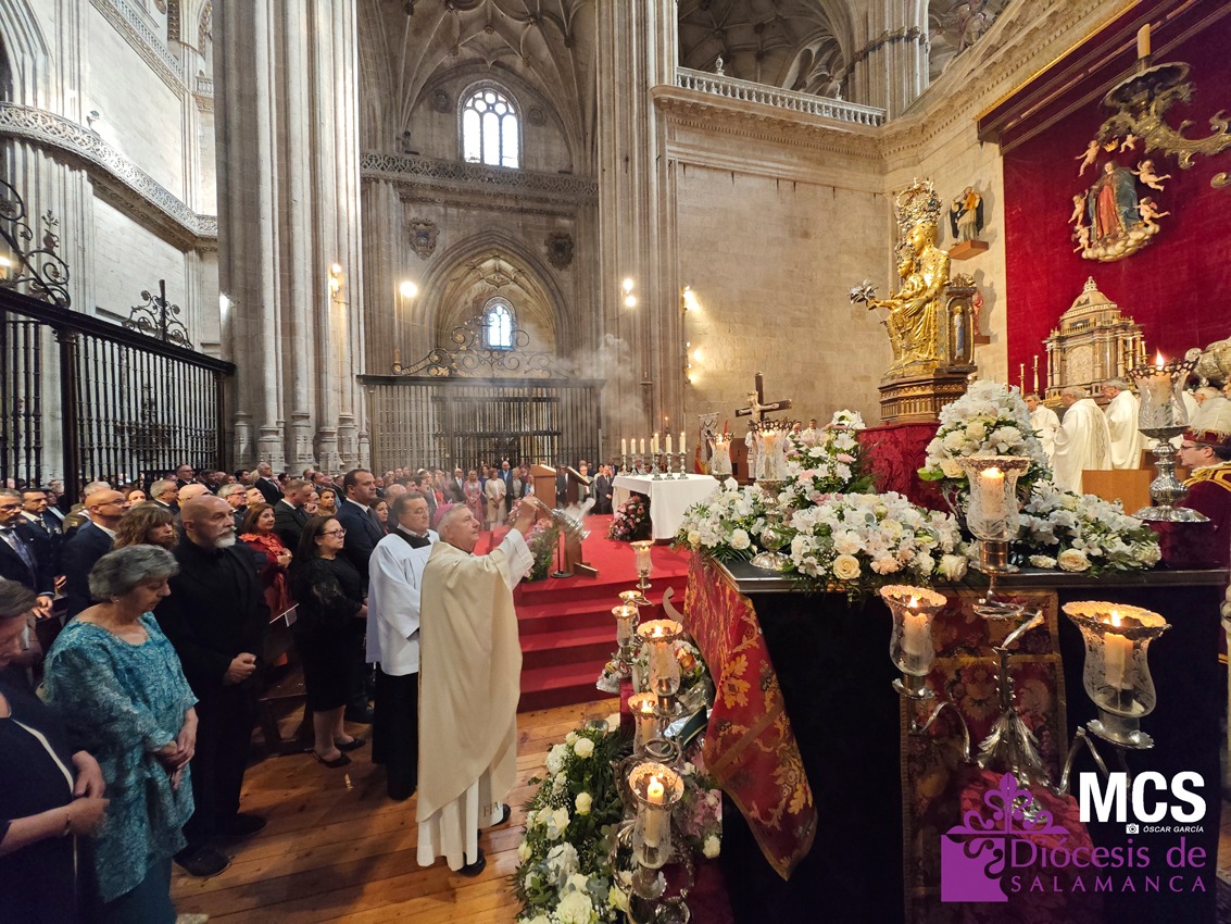 La Catedral Nueva de Salamanca se llenó en la mañana del 8 de septiembre para celebrar la fiesta de la Virgen de la Vega, patrona de la ciudad, en la que numerosos fieles participaron en la eucaristía presidida por el obispo, Mons. José Luis Retana, y concelebrada por sacerdotes diocesanos y religiosos. Junto al altar se colocó la talla de la Virgen, ante la que, al final de la misa, toda la asamblea entonó con emoción su himno. Para facilitar el seguimiento de la celebración, el templo contó con cuatro pantallas. Los prelados eméritos que acompañaron al obispo de Salamanca fueron Mons. Julio Parrilla, que ejerció su ministerio en Ecuador, y Mons. Rutilio del Riego, obispo emérito en Estados Unidos. También estuvieron presentes numerosas autoridades civiles y académicas, entre ellas el alcalde, que realizó la tradicional ofrenda a la patrona en nombre de la ciudad.