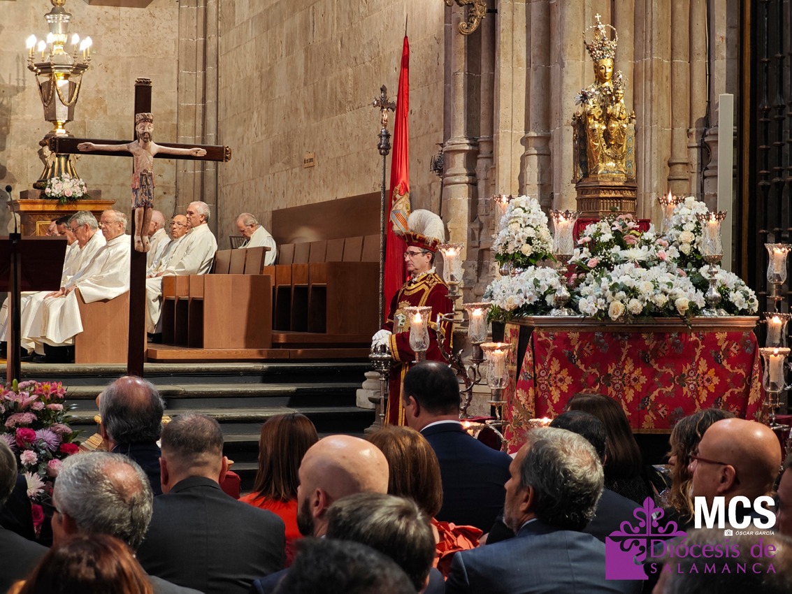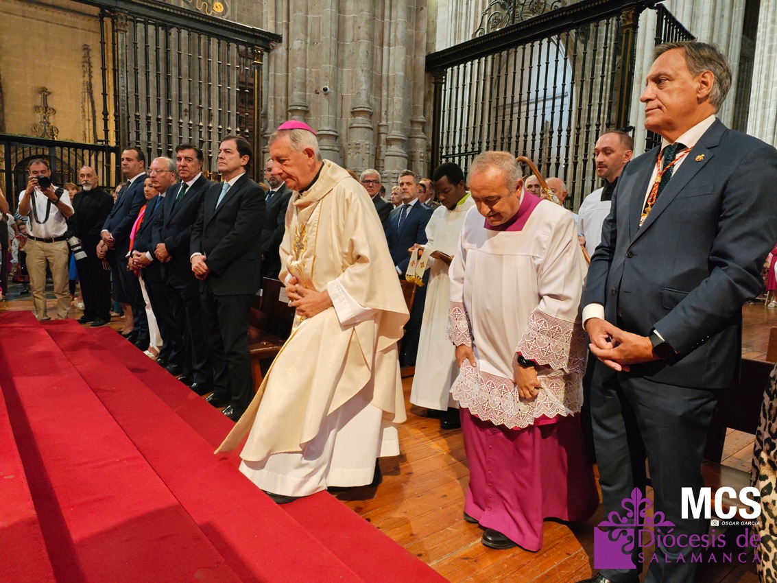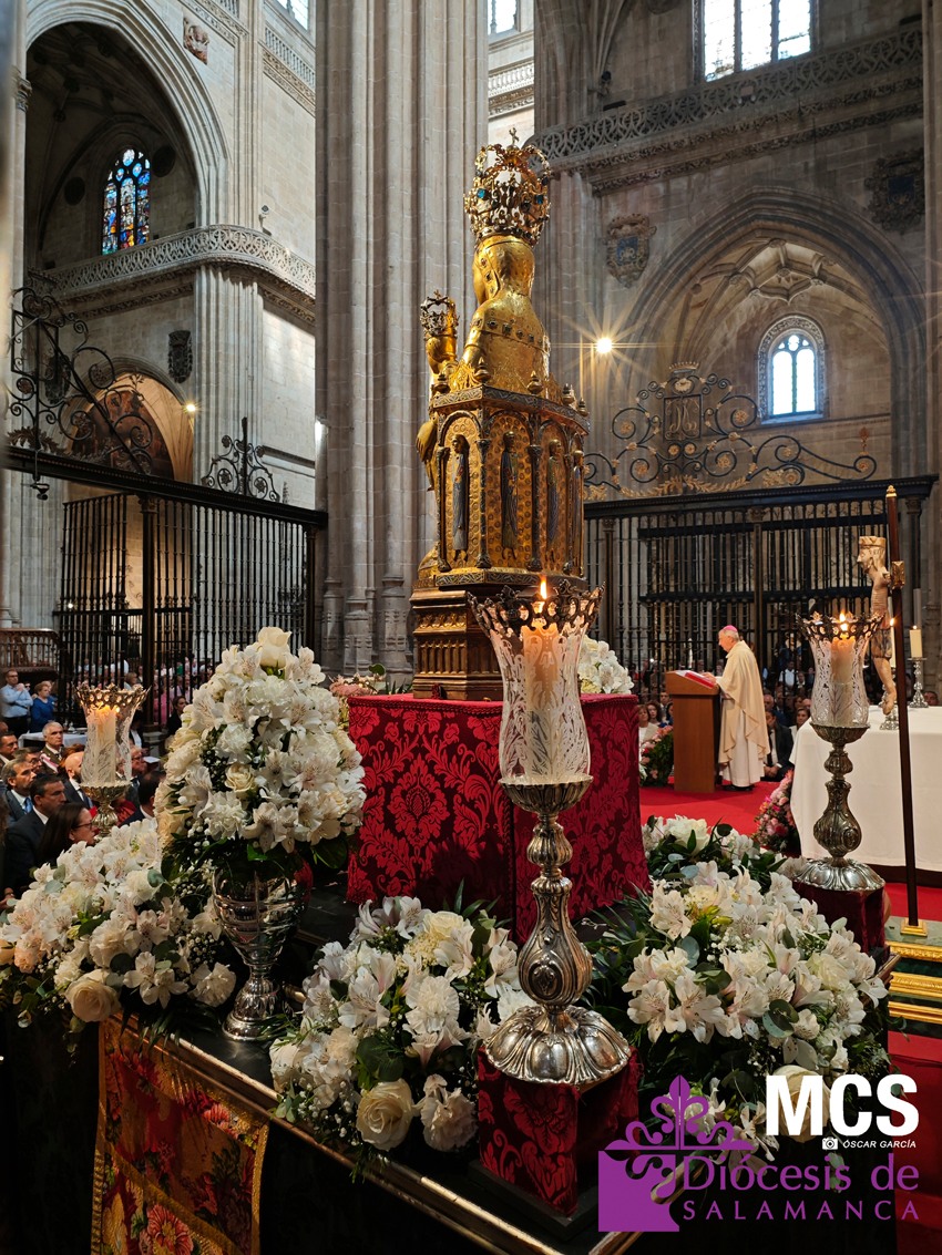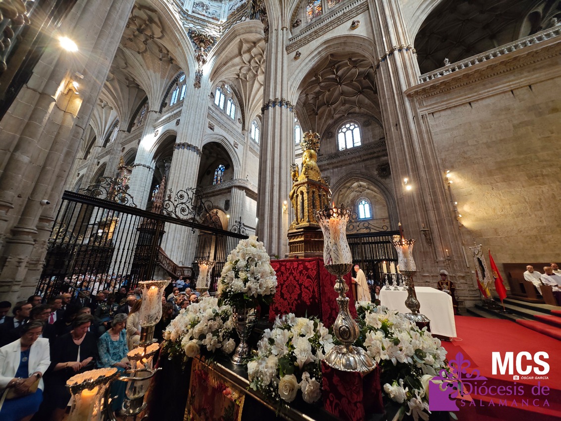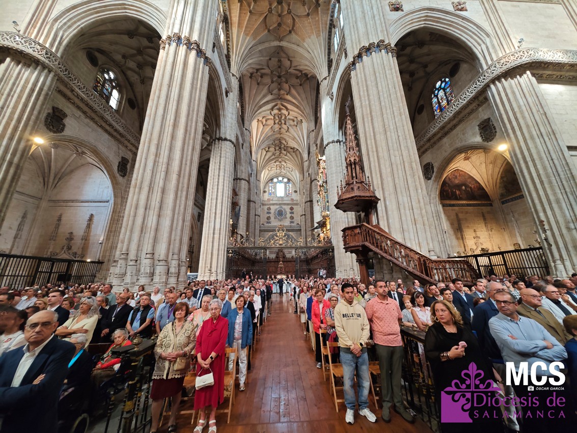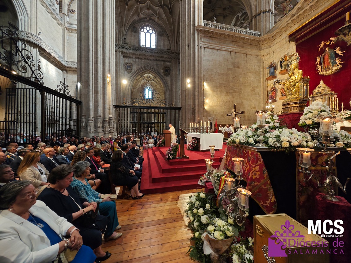La Catedral Nueva de Salamanca se llenó en la mañana del 8 de septiembre para celebrar la fiesta de la Virgen de la Vega, patrona de la ciudad, en la que numerosos fieles participaron en la eucaristía presidida por el obispo, Mons. José Luis Retana, y concelebrada por sacerdotes diocesanos y religiosos. Junto al altar se colocó la talla de la Virgen, ante la que, al final de la misa, toda la asamblea entonó con emoción su himno. Para facilitar el seguimiento de la celebración, el templo contó con cuatro pantallas. Los prelados eméritos que acompañaron al obispo de Salamanca fueron Mons. Julio Parrilla, que ejerció su ministerio en Ecuador, y Mons. Rutilio del Riego, obispo emérito en Estados Unidos. También estuvieron presentes numerosas autoridades civiles y académicas, entre ellas el alcalde, que realizó la tradicional ofrenda a la patrona en nombre de la ciudad.