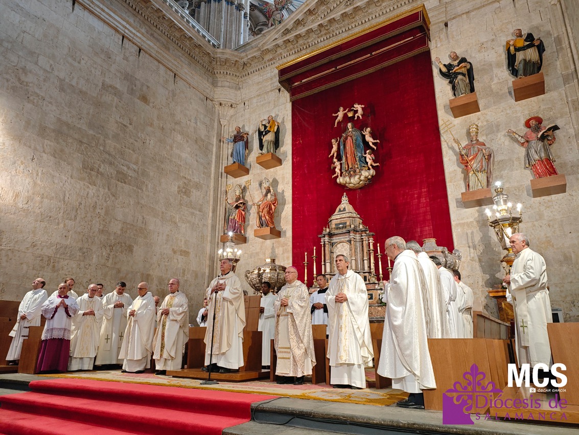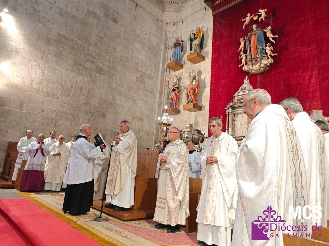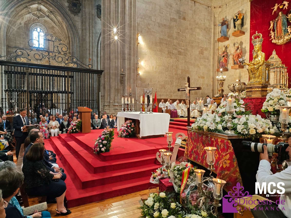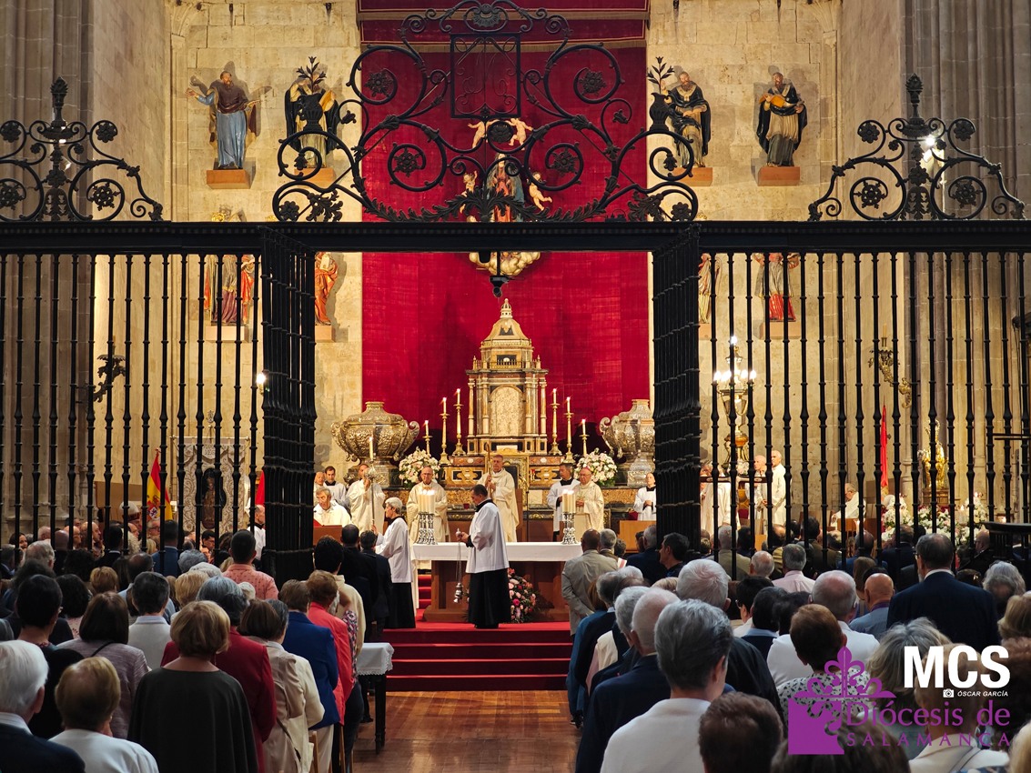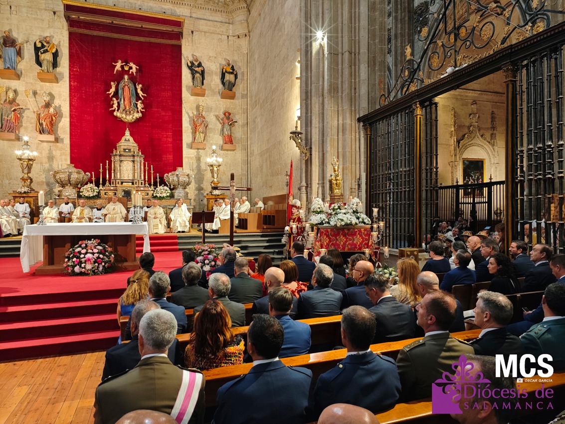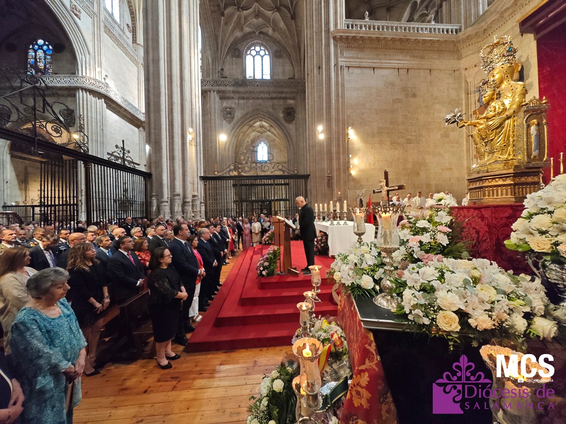La Catedral Nueva de Salamanca se llenó en la mañana del 8 de septiembre para celebrar la fiesta de la Virgen de la Vega, patrona de la ciudad, en la que numerosos fieles participaron en la eucaristía presidida por el obispo, Mons. José Luis Retana, y concelebrada por sacerdotes diocesanos y religiosos. Junto al altar se colocó la talla de la Virgen, ante la que, al final de la misa, toda la asamblea entonó con emoción su himno. Para facilitar el seguimiento de la celebración, el templo contó con cuatro pantallas. Los prelados eméritos que acompañaron al obispo de Salamanca fueron Mons. Julio Parrilla, que ejerció su ministerio en Ecuador, y Mons. Rutilio del Riego, obispo emérito en Estados Unidos. También estuvieron presentes numerosas autoridades civiles y académicas, entre ellas el alcalde, que realizó la tradicional ofrenda a la patrona en nombre de la ciudad.