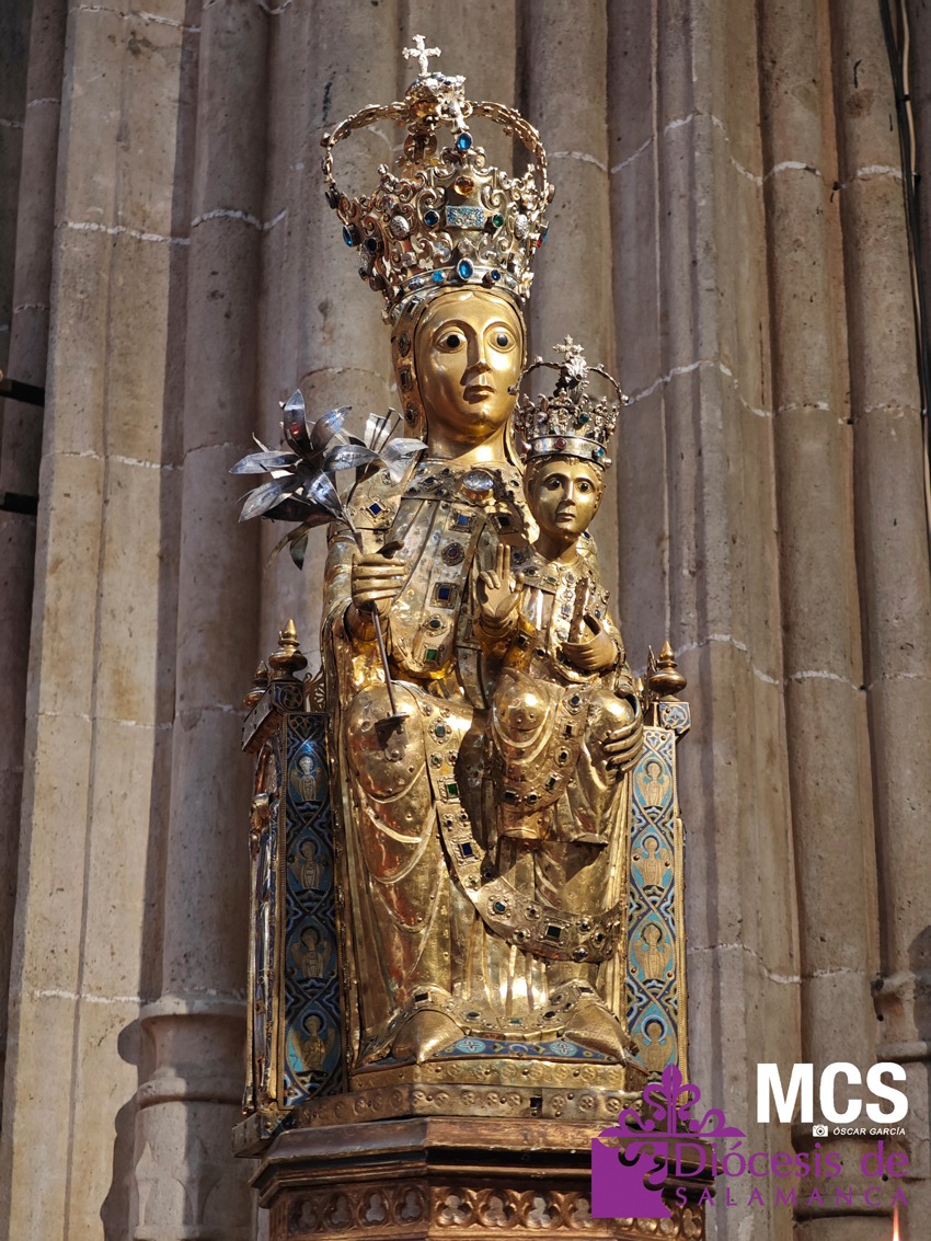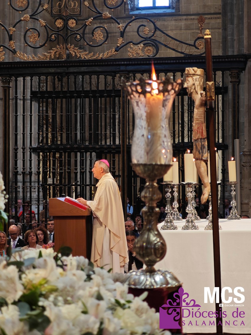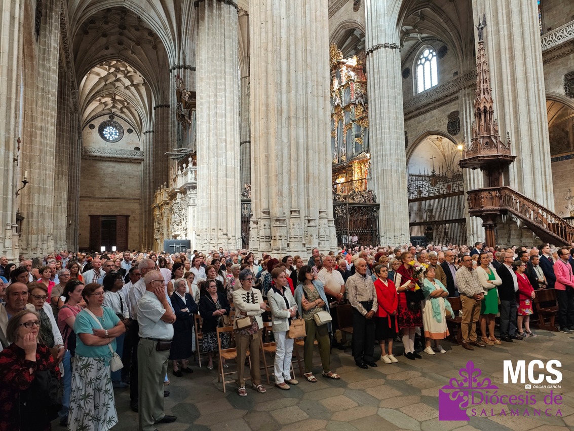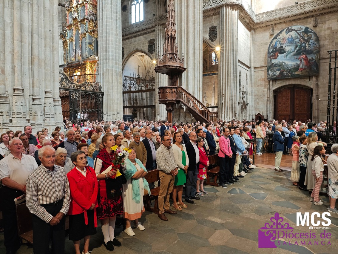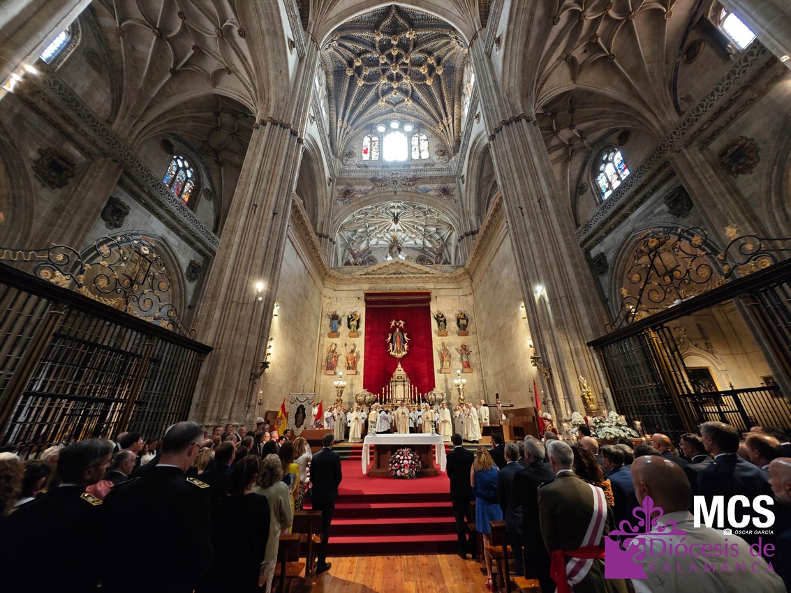 La Catedral Nueva de Salamanca se llenó en la mañana del 8 de septiembre para celebrar la fiesta de la Virgen de la Vega, patrona de la ciudad, en la que numerosos fieles participaron en la eucaristía presidida por el obispo, Mons. José Luis Retana, y concelebrada por sacerdotes diocesanos y religiosos. Junto al altar se colocó la talla de la Virgen, ante la que, al final de la misa, toda la asamblea entonó con emoción su himno. Para facilitar el seguimiento de la celebración, el templo contó con cuatro pantallas. Los prelados eméritos que acompañaron al obispo de Salamanca fueron Mons. Julio Parrilla, que ejerció su ministerio en Ecuador, y Mons. Rutilio del Riego, obispo emérito en Estados Unidos. También estuvieron presentes numerosas autoridades civiles y académicas, entre ellas el alcalde, que realizó la tradicional ofrenda a la patrona en nombre de la ciudad.