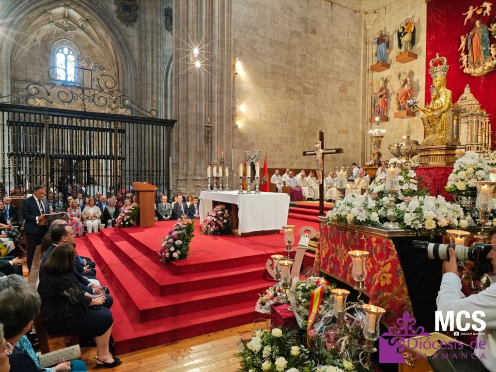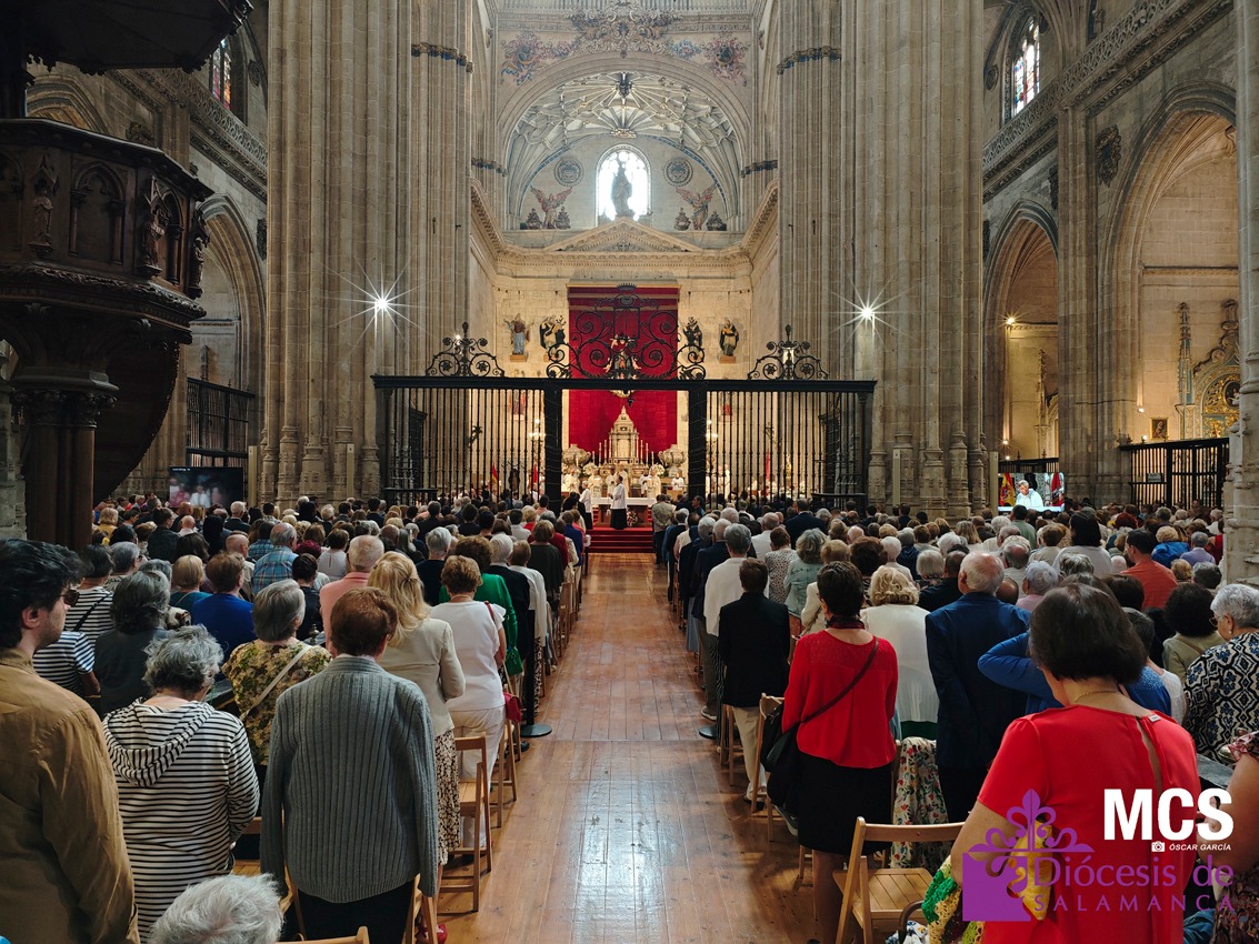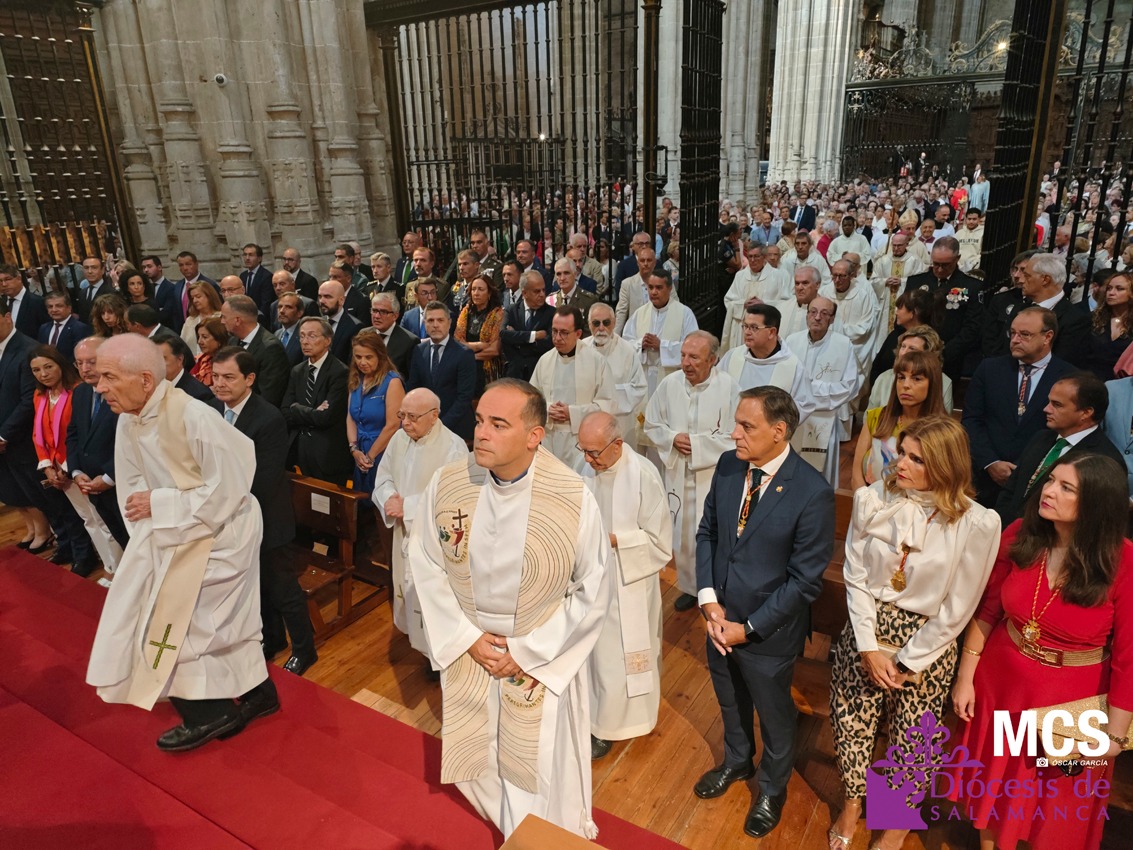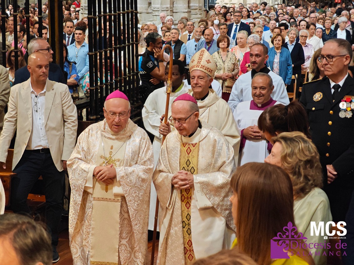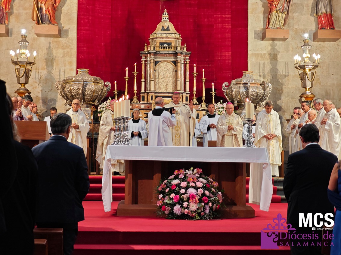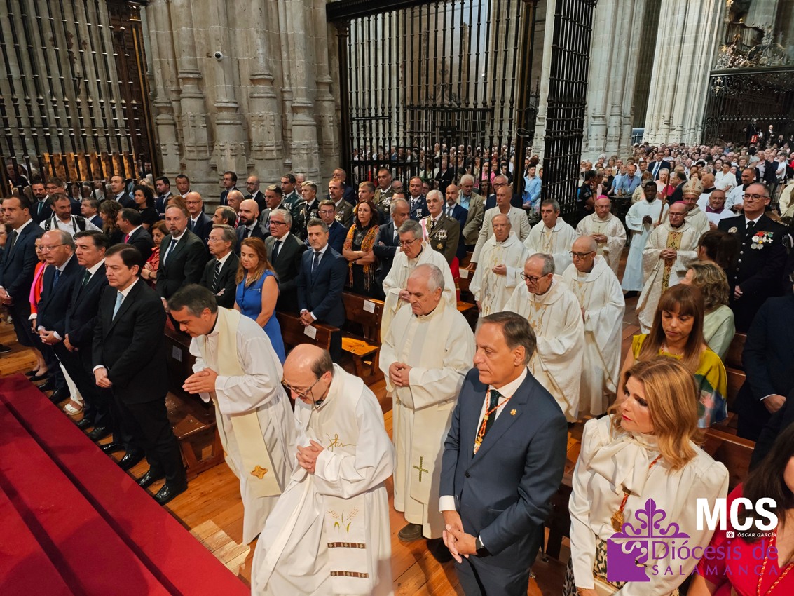 La Catedral Nueva de Salamanca se llenó en la mañana del 8 de septiembre para celebrar la fiesta de la Virgen de la Vega, patrona de la ciudad, en la que numerosos fieles participaron en la eucaristía presidida por el obispo, Mons. José Luis Retana, y concelebrada por sacerdotes diocesanos y religiosos. Junto al altar se colocó la talla de la Virgen, ante la que, al final de la misa, toda la asamblea entonó con emoción su himno. Para facilitar el seguimiento de la celebración, el templo contó con cuatro pantallas. Los prelados eméritos que acompañaron al obispo de Salamanca fueron Mons. Julio Parrilla, que ejerció su ministerio en Ecuador, y Mons. Rutilio del Riego, obispo emérito en Estados Unidos. También estuvieron presentes numerosas autoridades civiles y académicas, entre ellas el alcalde, que realizó la tradicional ofrenda a la patrona en nombre de la ciudad.
