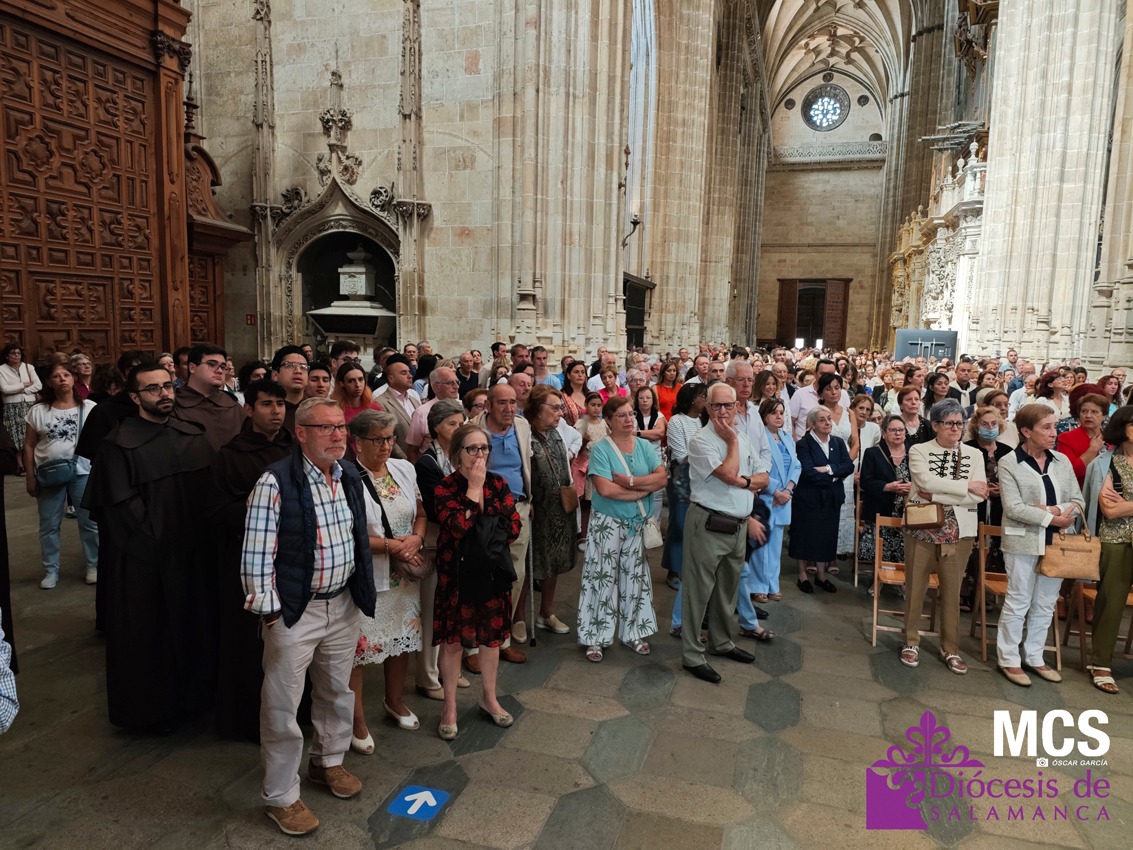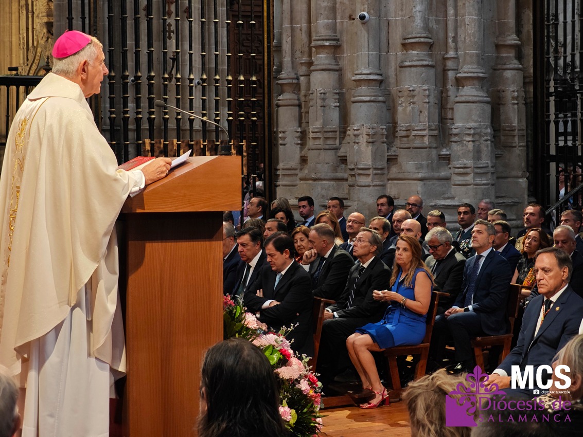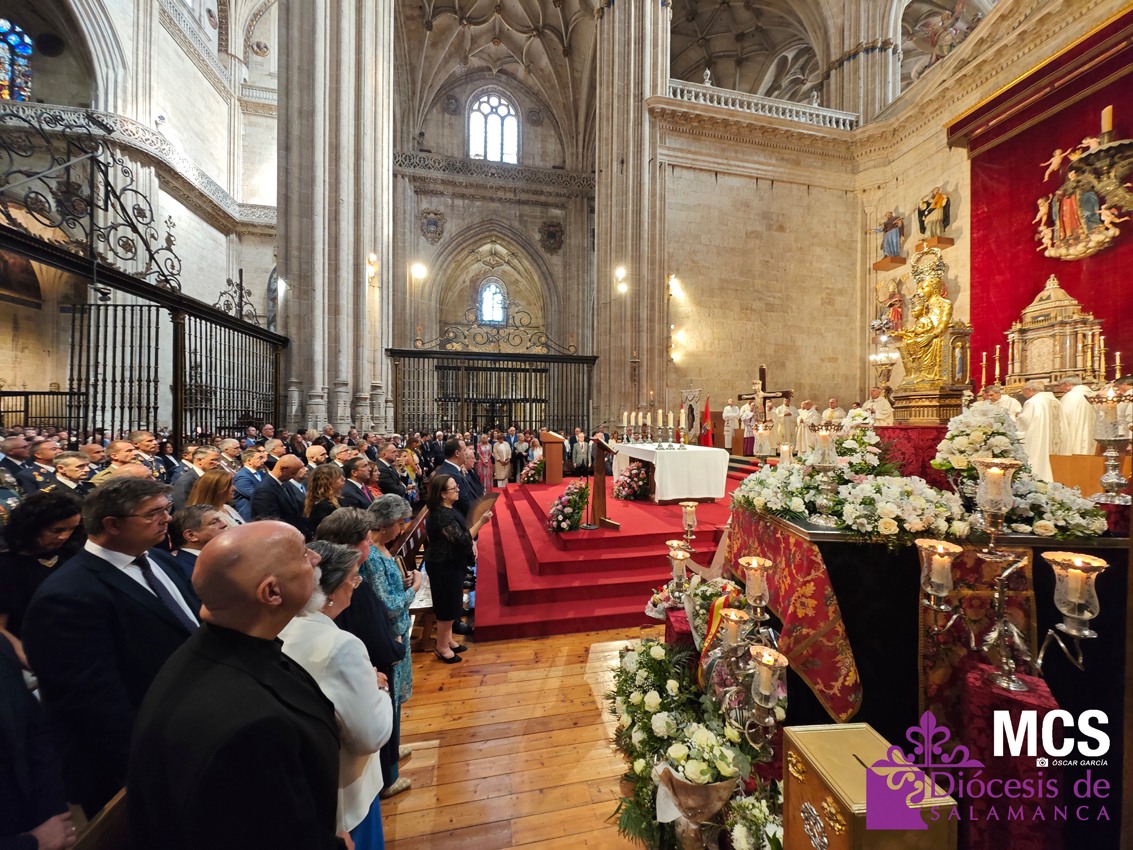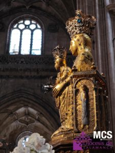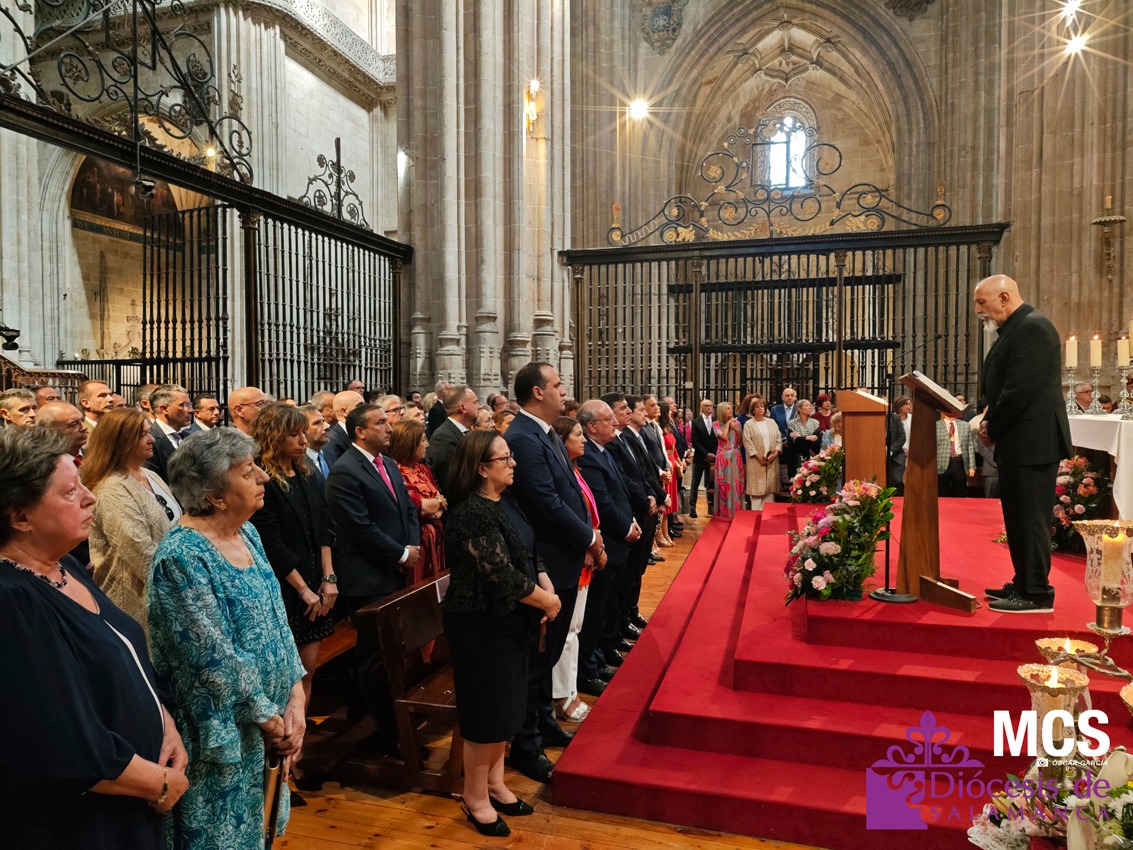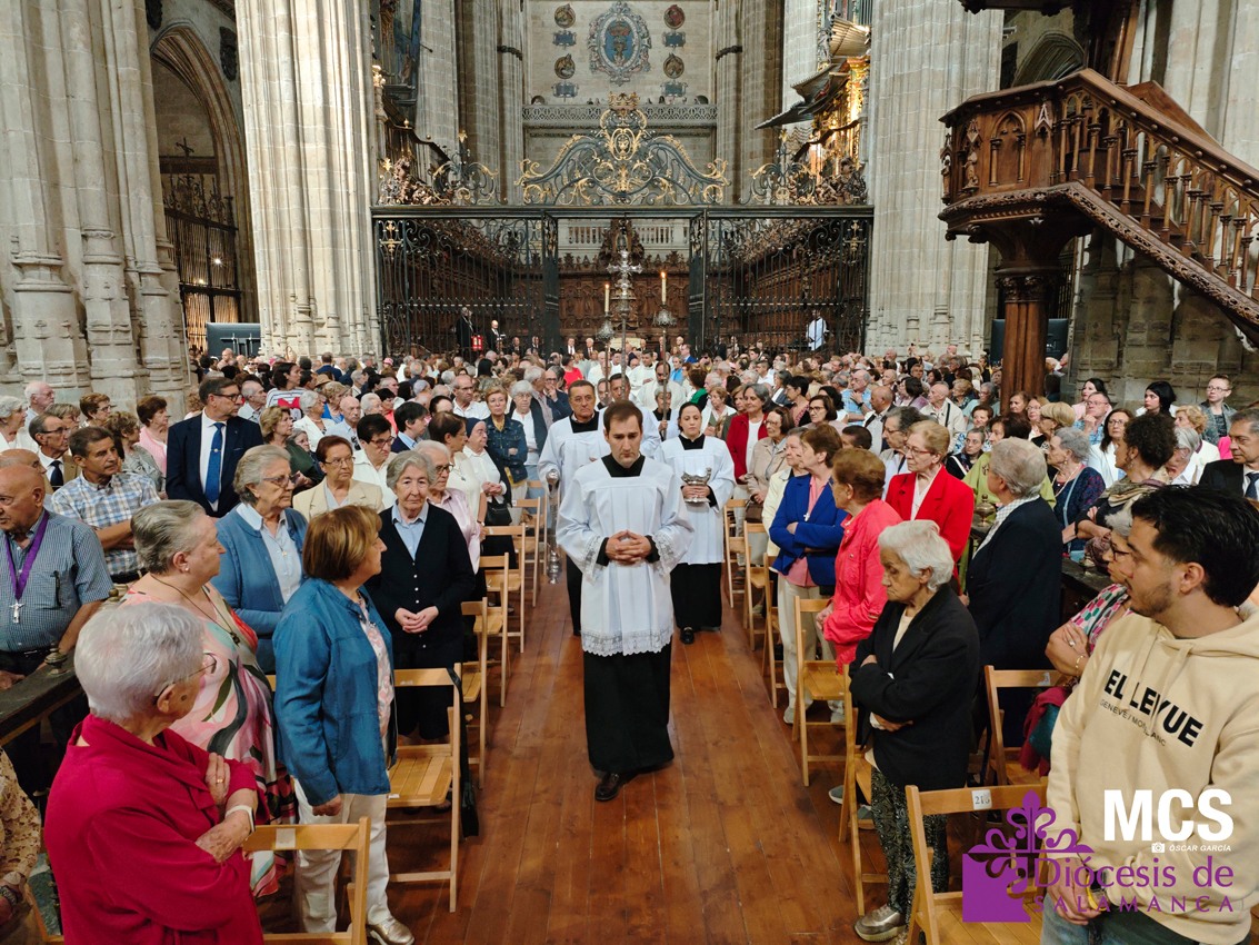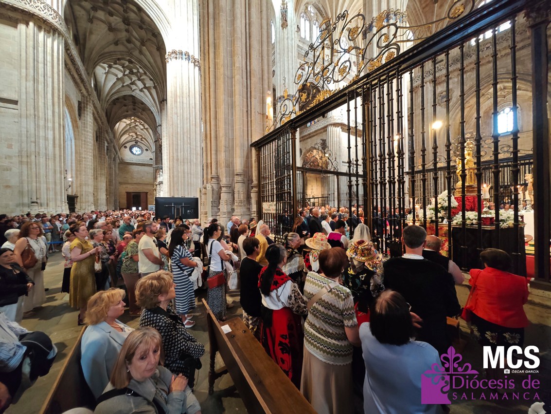 La Catedral Nueva de Salamanca se llenó en la mañana del 8 de septiembre para celebrar la fiesta de la Virgen de la Vega, patrona de la ciudad, en la que numerosos fieles participaron en la eucaristía presidida por el obispo, Mons. José Luis Retana, y concelebrada por sacerdotes diocesanos y religiosos. Junto al altar se colocó la talla de la Virgen, ante la que, al final de la misa, toda la asamblea entonó con emoción su himno. Para facilitar el seguimiento de la celebración, el templo contó con cuatro pantallas. Los prelados eméritos que acompañaron al obispo de Salamanca fueron Mons. Julio Parrilla, que ejerció su ministerio en Ecuador, y Mons. Rutilio del Riego, obispo emérito en Estados Unidos. También estuvieron presentes numerosas autoridades civiles y académicas, entre ellas el alcalde, que realizó la tradicional ofrenda a la patrona en nombre de la ciudad.