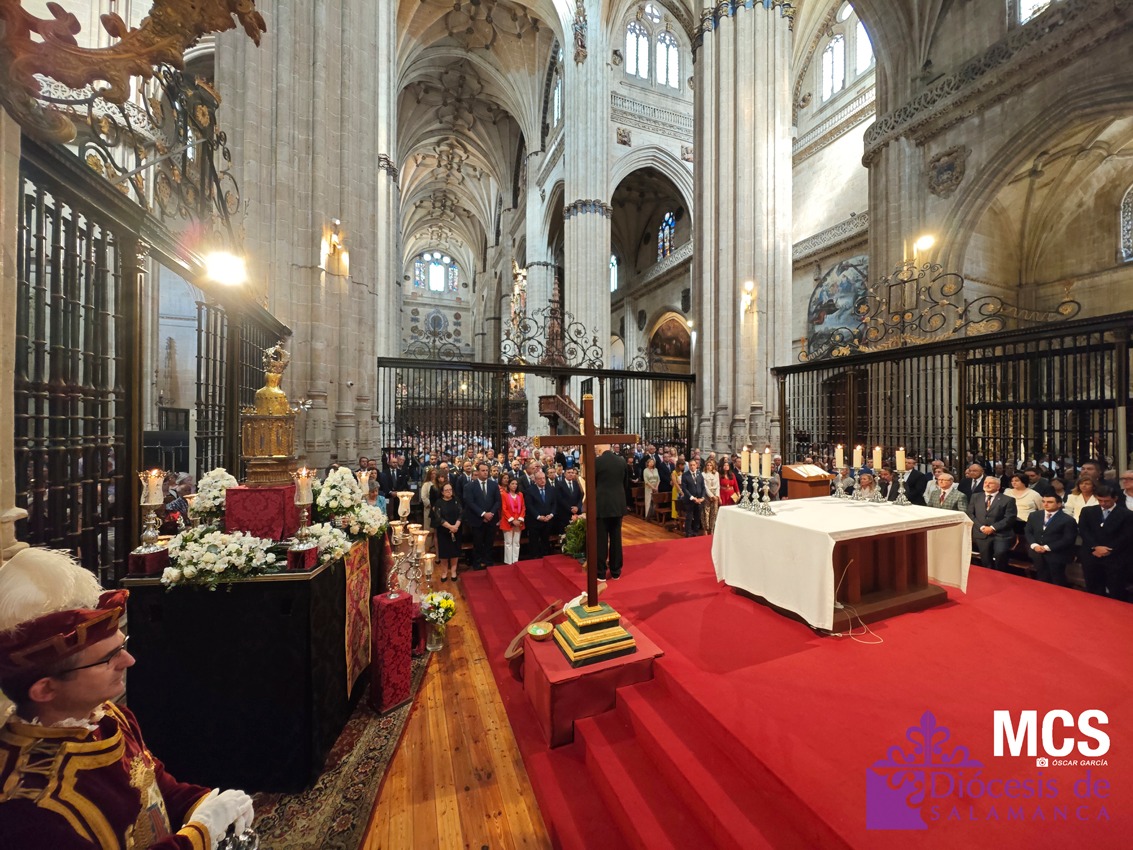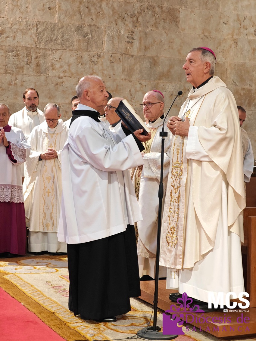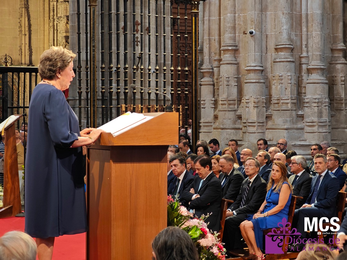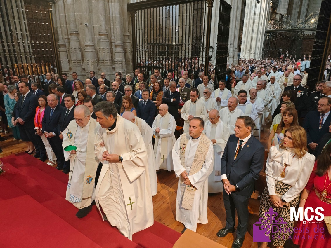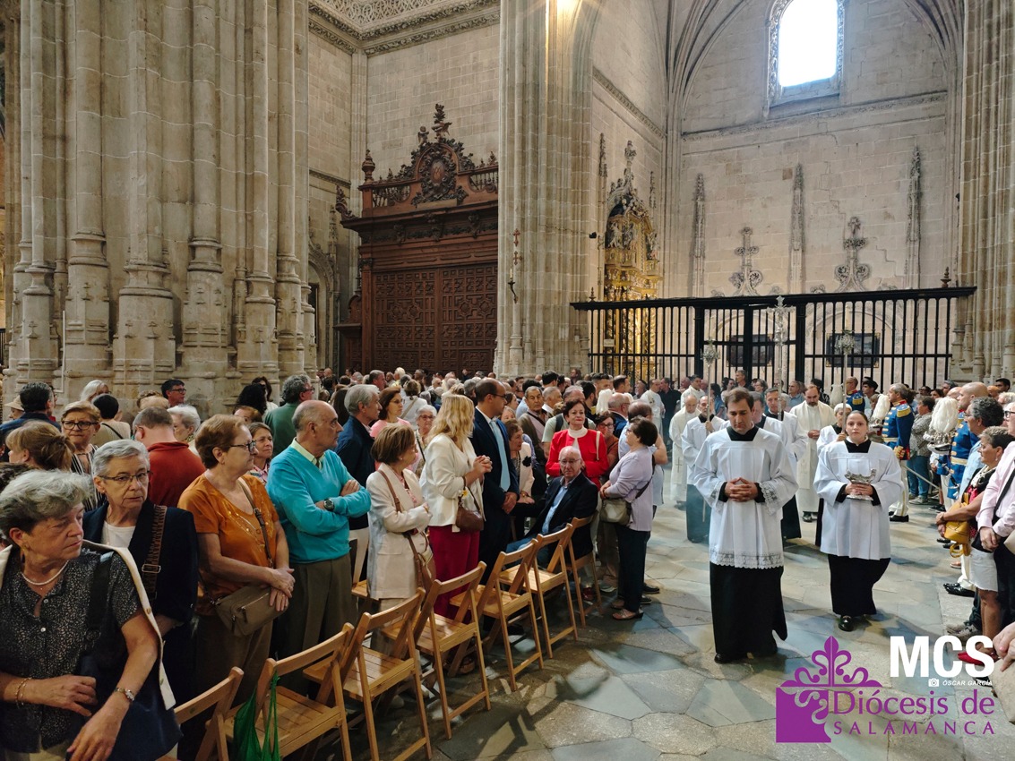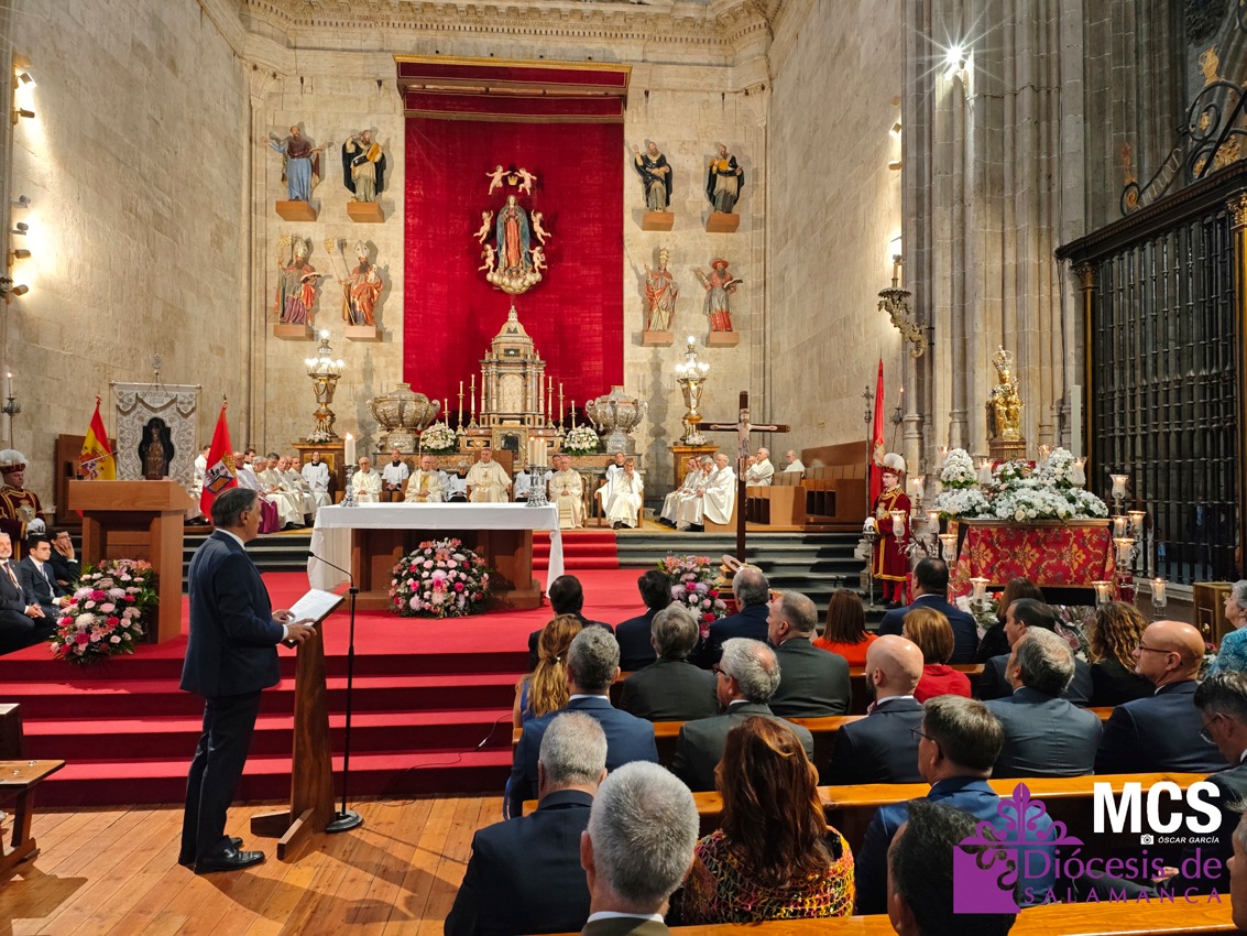 La Catedral Nueva de Salamanca se llenó en la mañana del 8 de septiembre para celebrar la fiesta de la Virgen de la Vega, patrona de la ciudad, en la que numerosos fieles participaron en la eucaristía presidida por el obispo, Mons. José Luis Retana, y concelebrada por sacerdotes diocesanos y religiosos. Junto al altar se colocó la talla de la Virgen, ante la que, al final de la misa, toda la asamblea entonó con emoción su himno. Para facilitar el seguimiento de la celebración, el templo contó con cuatro pantallas. Los prelados eméritos que acompañaron al obispo de Salamanca fueron Mons. Julio Parrilla, que ejerció su ministerio en Ecuador, y Mons. Rutilio del Riego, obispo emérito en Estados Unidos. También estuvieron presentes numerosas autoridades civiles y académicas, entre ellas el alcalde, que realizó la tradicional ofrenda a la patrona en nombre de la ciudad.