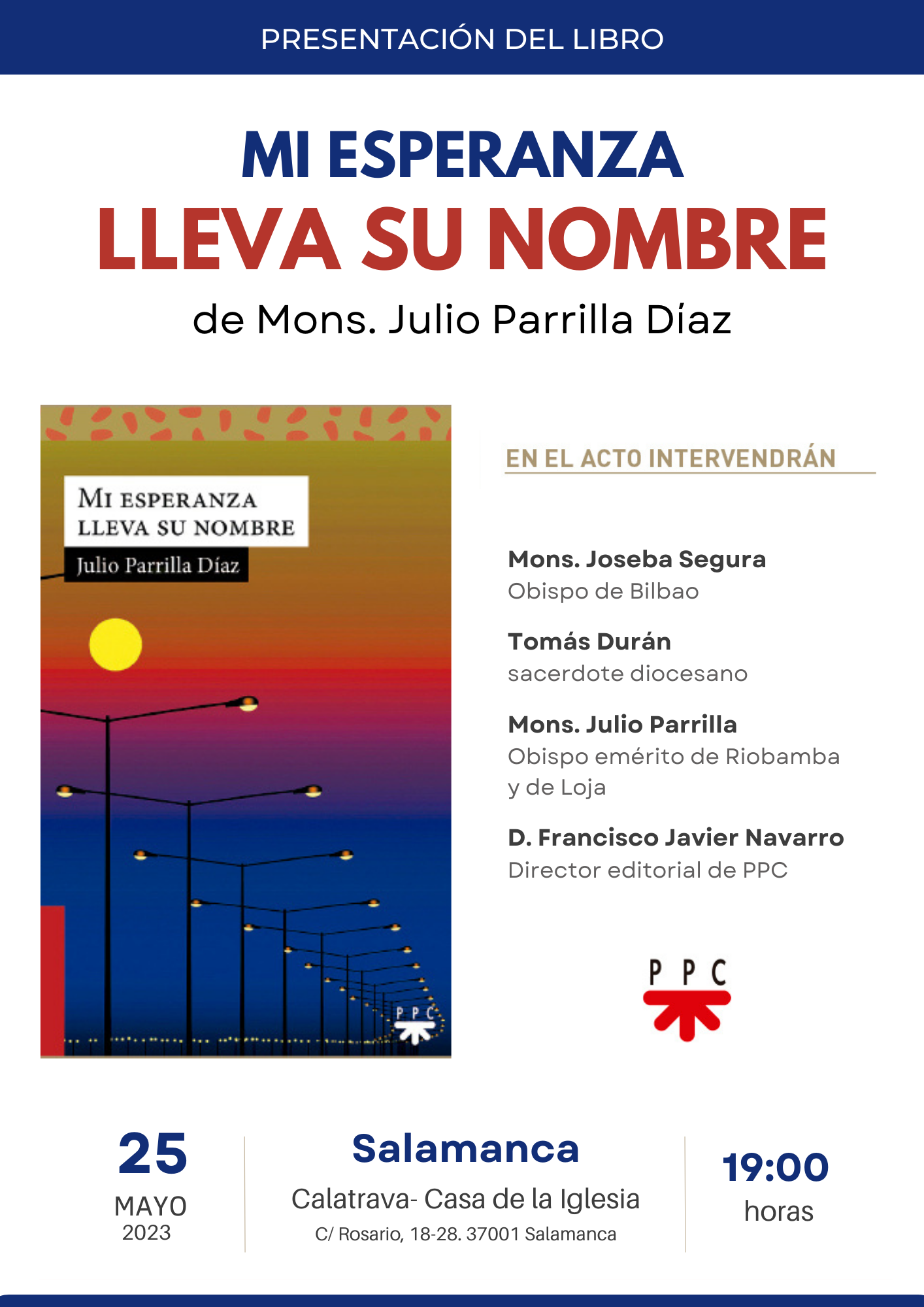 El 25 de mayo presenta su octavo libro, titulado: “Mi esperanza lleva su nombre”, editado por PPC, que en esta ocasión ha escrito en el momento de jubilación, “un tiempo para la memoria”. Mons. Julio Parrilla invita a leer estas páginas, más de 300, y a acudir a la presentación oficial que tendrá lugar el jueves, 25 de mayo, a las 19:00 horas en la Casa de la Iglesia. En ella participarán, además del propio autor, el obispo de Bilbao, Mons. Joseba Segura; el sacerdote, Tomás Durán, que tomará posesión como vicario general el día 26, y el director editorial de PPC, Francisco Javier Navarro.