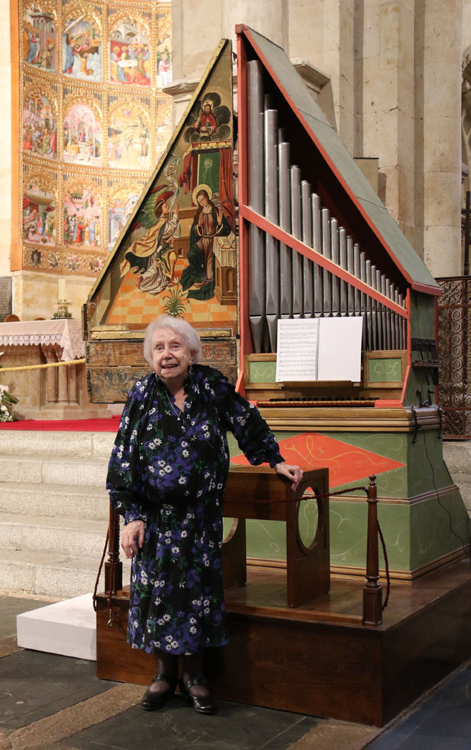 La organista más longeva del mundo, Montserrat Torrent (Barcelona, 1926), maestra de maestros y decana de la música española, a sus 97 años ha presentado este lunes, 10 de julio, en Salamanca el segundo disco del sello Cathedralis: “Los órganos de la Catedral de Salamanca”. Un álbum de referencia sobre estos instrumentos que reúne en un mismo CD “la grabación de los cuatro órganos de la Catedral”, como ha destacado en su presentación el catedrático de órgano en el Conservatorio Superior de Música de Castilla y León, Luis Dalda.