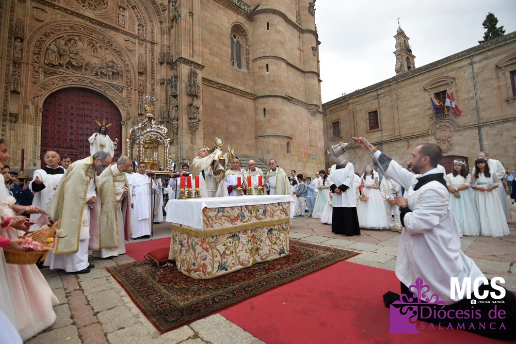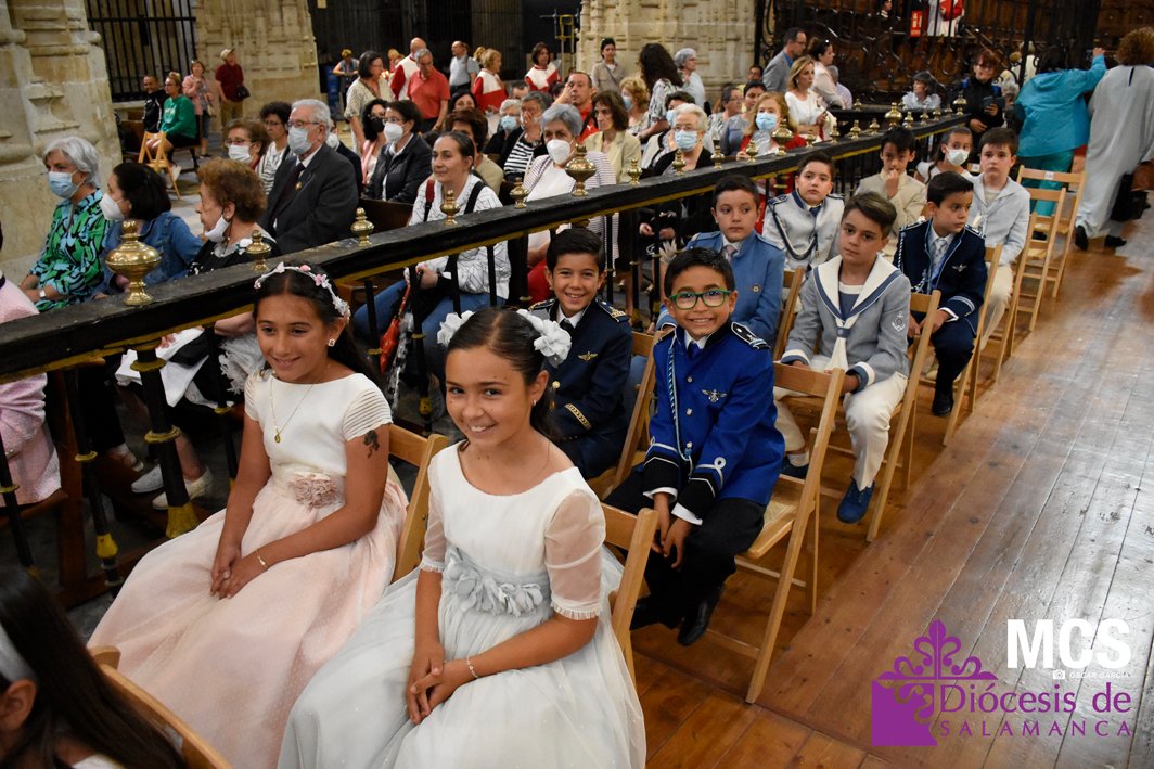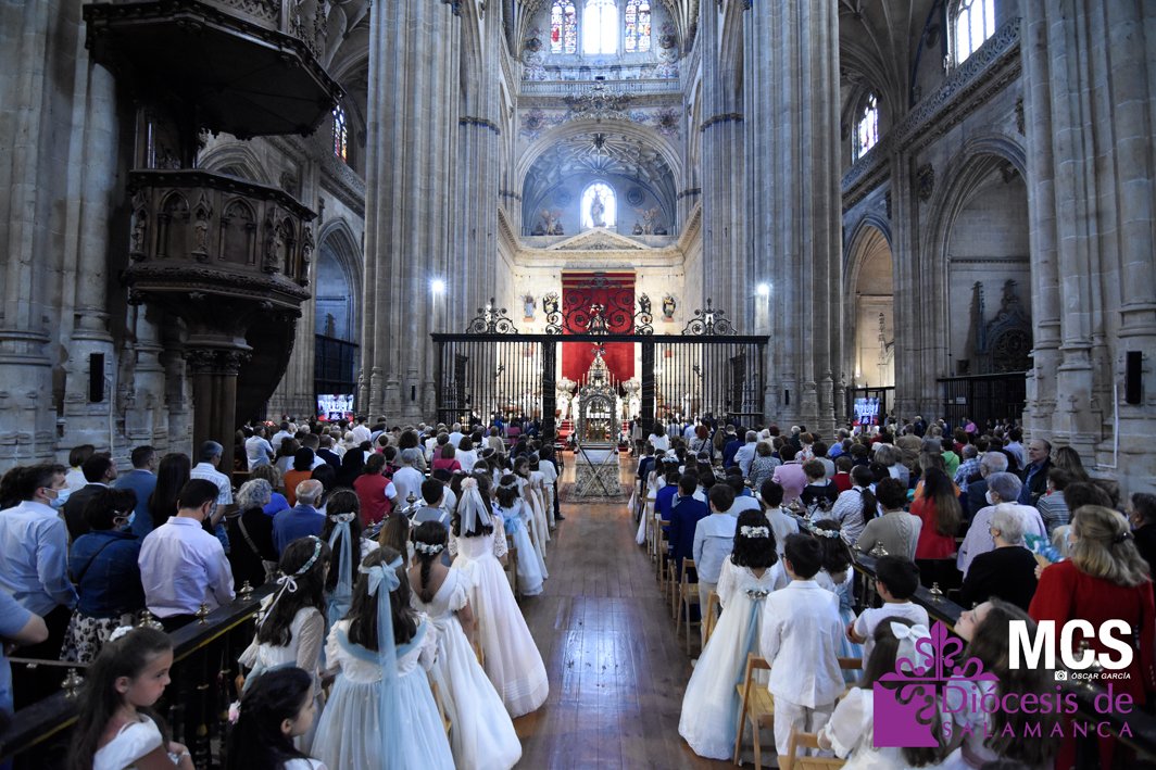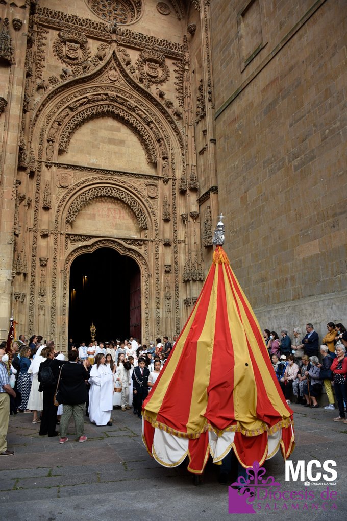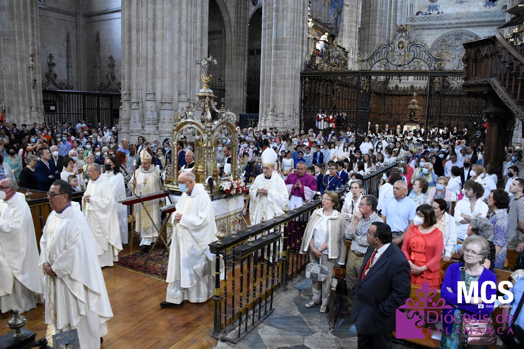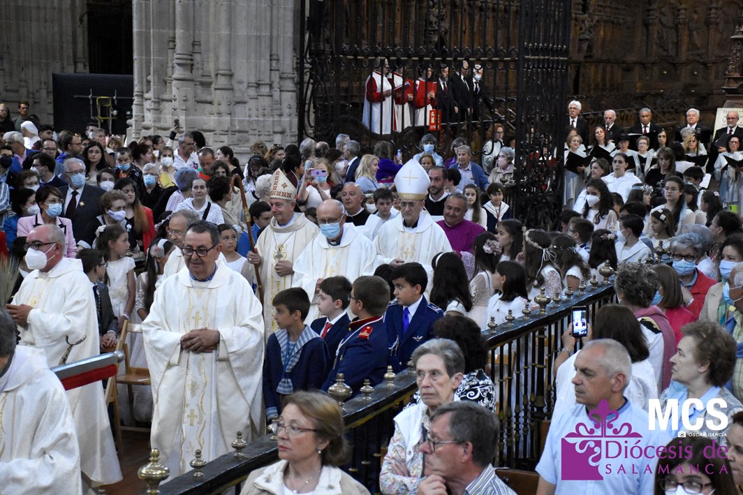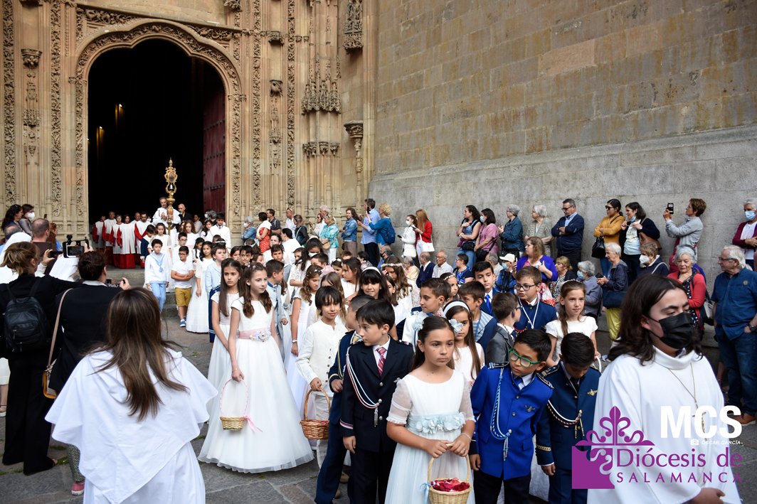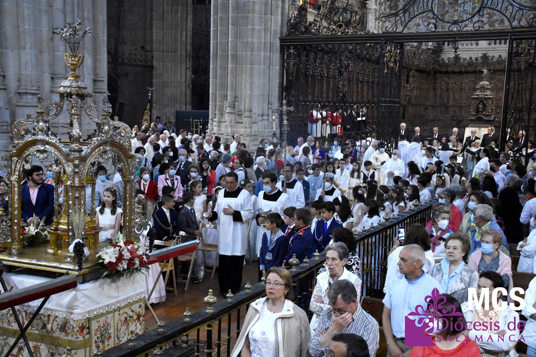 El Corpus Christi volvió a celebrarse en Salamanca con la misma afluencia anterior a la pandemia, con una Catedral Nueva llena de fieles y cerca de un centenar de niños de primera comunión que también participaron en la posterior procesión por las calles del centro de la ciudad.