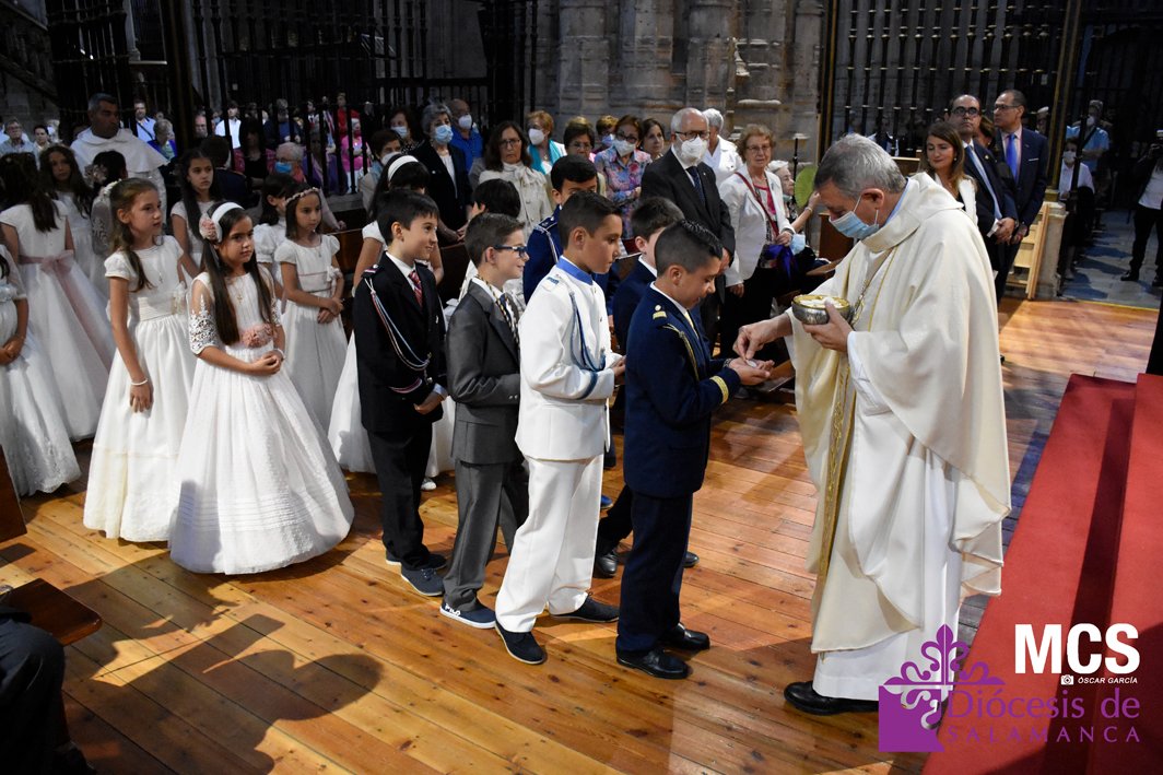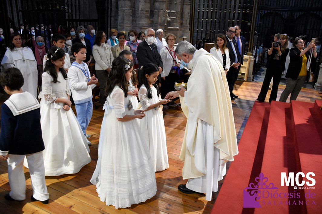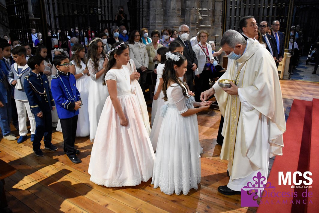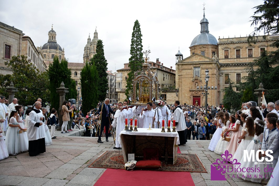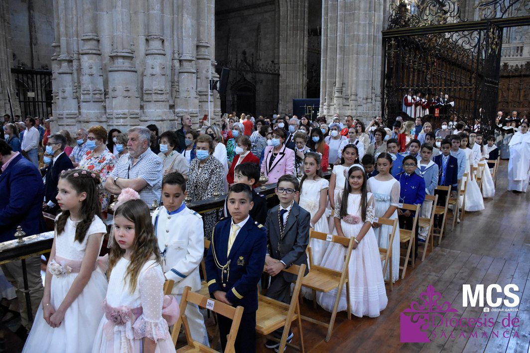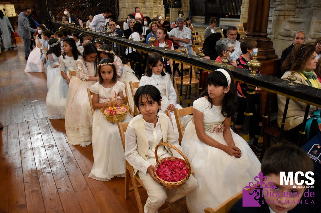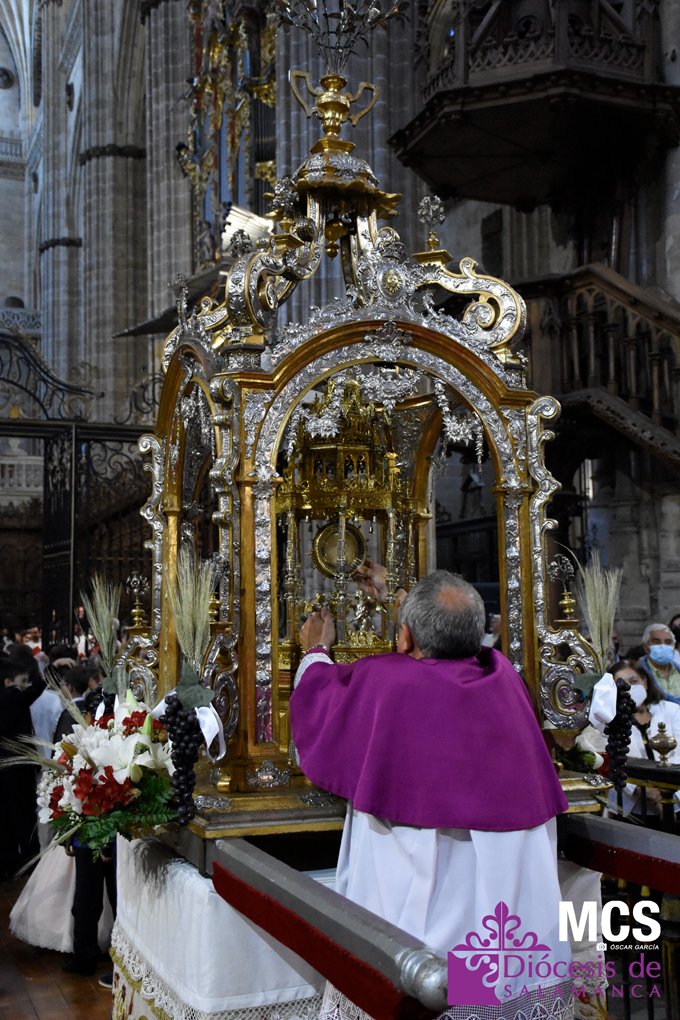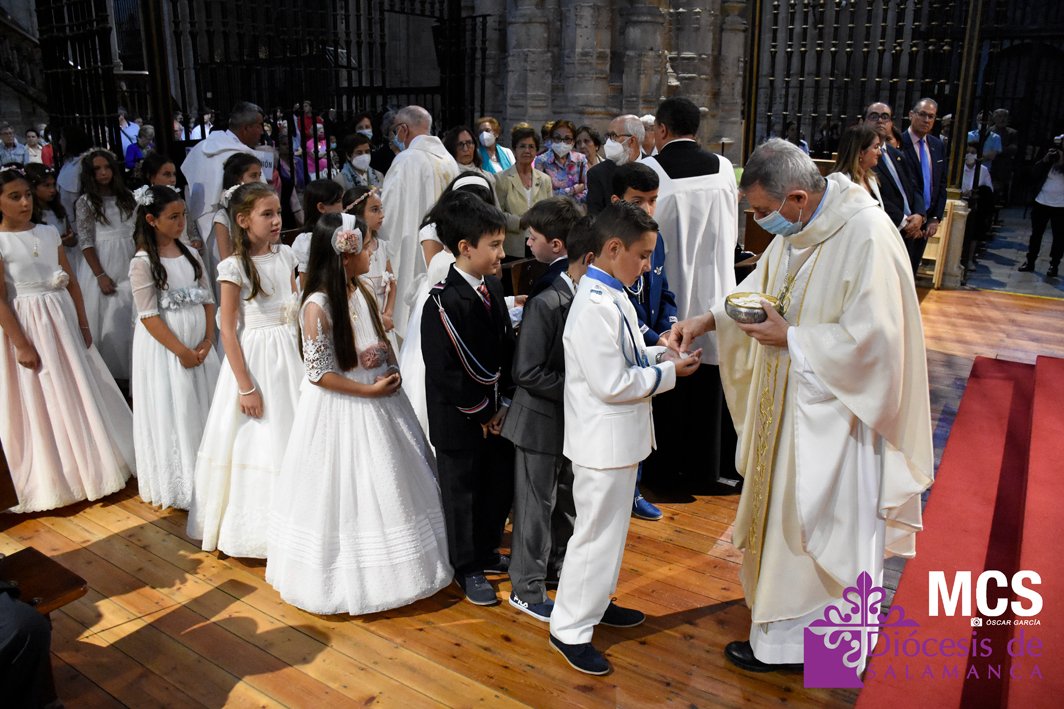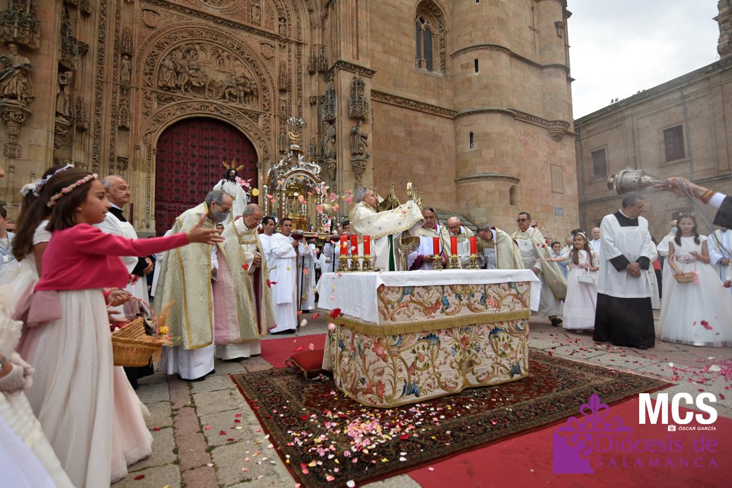 El Corpus Christi volvió a celebrarse en Salamanca con la misma afluencia anterior a la pandemia, con una Catedral Nueva llena de fieles y cerca de un centenar de niños de primera comunión que también participaron en la posterior procesión por las calles del centro de la ciudad.