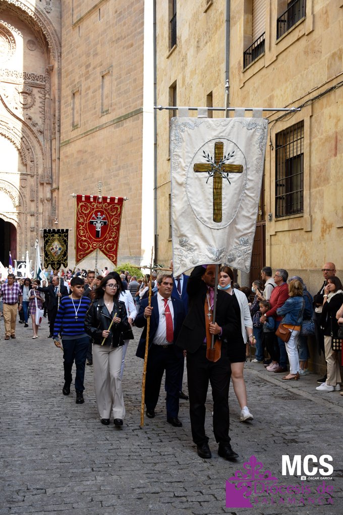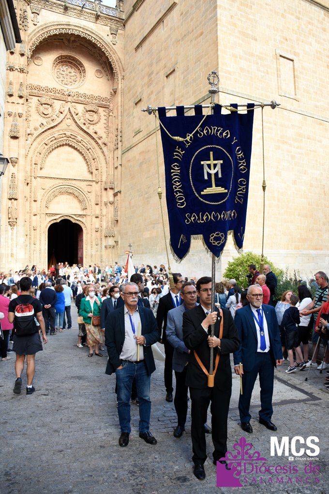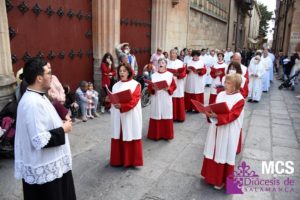 Una vez finalizada la eucaristía, comenzó a salir el cortejo hacia la puerta del obispo. La cruz guía abría la procesión, y tras ella, la asamblea y los primeros estandartes de las cofradías que participaron en el Corpus Christi. También estaban presentes un grupo de niños que ha tomado este año la primera comunión y los sacerdotes diocesanos. Delante de ellos se encontraba la basílica, y detrás, el tintinábulo y el bajo palio.