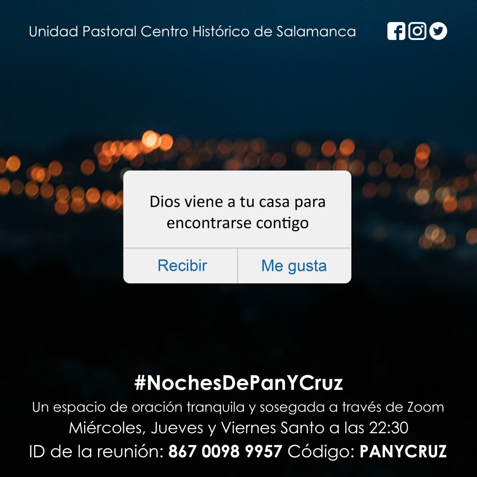 “Dios viene a tu casa para encontrarse contigo”, es el lema de la nueva iniciativa de oración propuesta por las parroquias que integran la Unidad Pastoral Centro Histórico de Salamanca (La Purísima, San Sebastián, San Martín y San Julián), que pretende “unirnos de una manera especial en la oración en este tiempo de Semana Santa. Tres días, miércoles, jueves y viernes”, como señala su párroco, Policarpo Díaz.