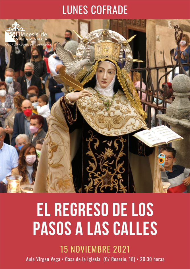 El primer encuentro, con título: “El regreso de los pasos a las calles”, tendrá lugar el 15 de noviembre y en la mesa de diálogo van a intervenir Francisco Hernández Mateo, presidente de la Junta de Semana Santa de Salamanca y Beatriz Dudes Manzano, hermana mayor de la Hermandad de Jesús Despojado, así como representantes de la Hermandad de Santa Teresa de Jesús de Alba de Tormes.