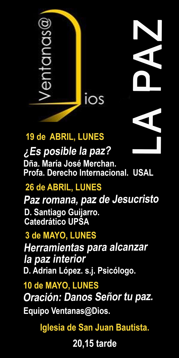 “¿Es posible la paz?”, es la pregunta a la que tratará de responder María José Merchán, profesora de Derecho internacional de la Universidad de Salamanca en la primera sesión del nuevo ciclo de Ventanas a Dios, que tendrá lugar el 19 de abril. El ciclo consta de cuatro sesiones que se llevarán a cabo en la iglesia de San Juan Bautista, en la calle Perdones en Salamanca, a las 20.15 horas.