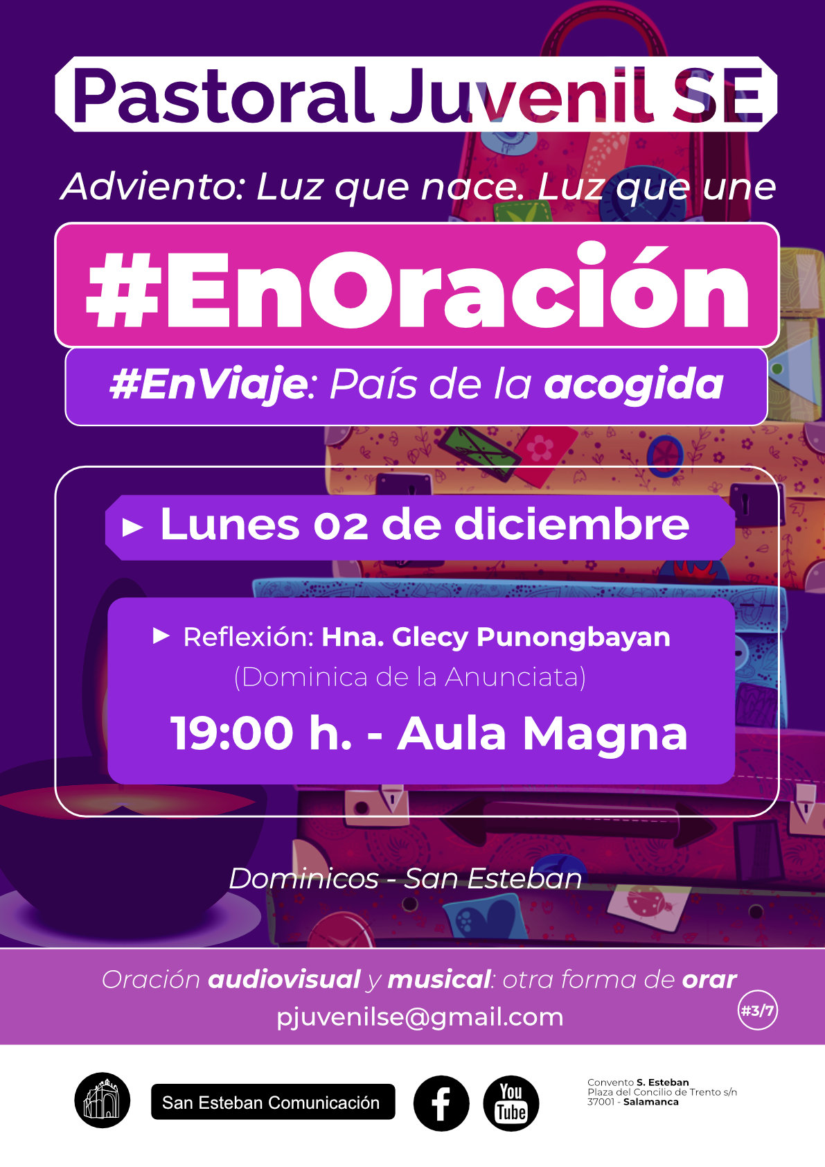 “Adviento: Luz que nace. Luz que une”, es el tema de reflexión del próximo encuentro #EnOración, “En el país de la acogida”, que organiza Pastoral Juvenil San Esteban. Tendrá lugar el lunes 2 de diciembre, a las 19.00 horas en el aula magna del Convento de los Dominicos y en esta ocasión será dirigido por la hna. Glecy Punongbayan, de las Dominicas de la Anunciata.