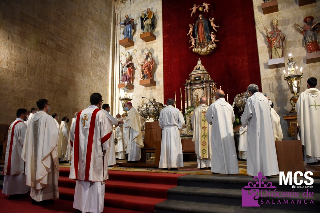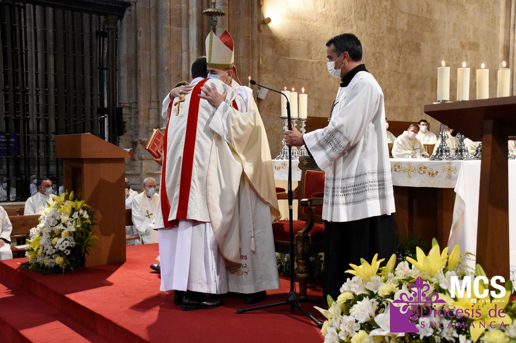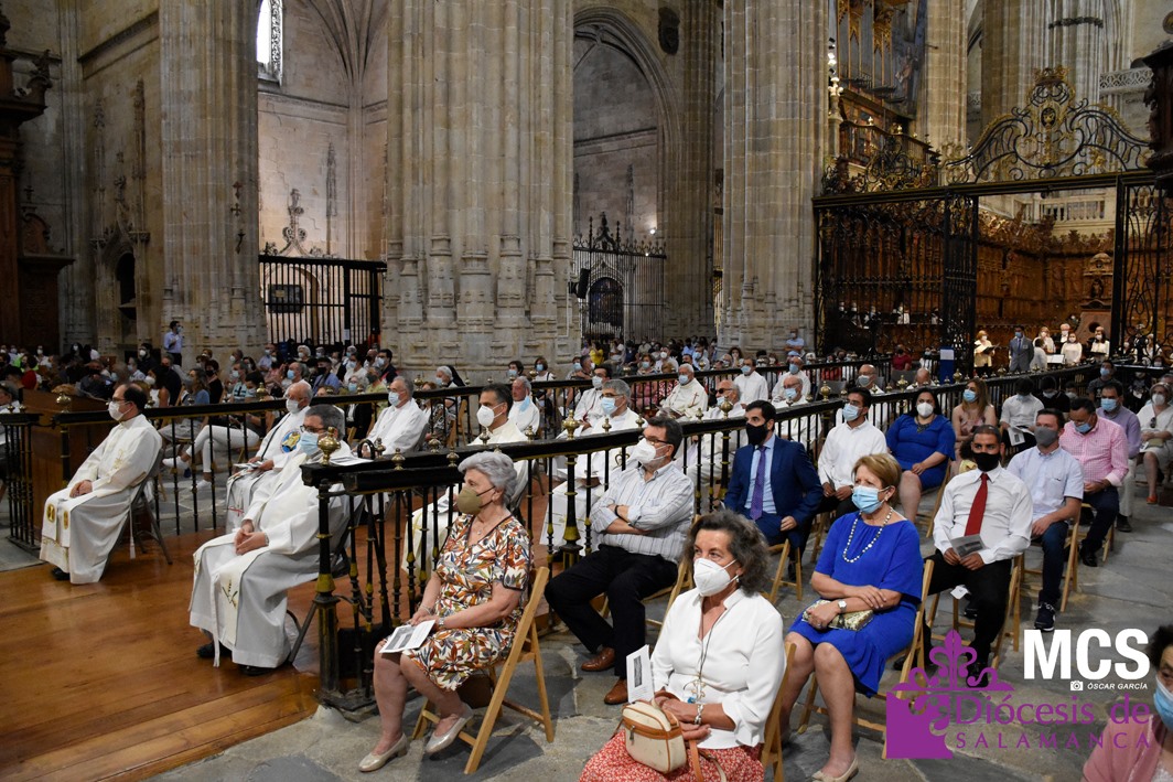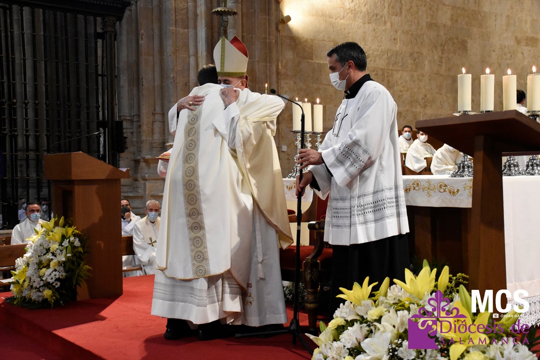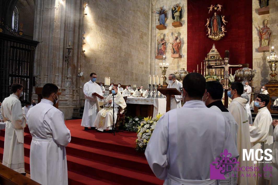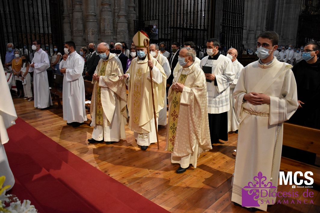 Antes de concluir la celebración, el obispo impartió su bendición solemne a los nuevos diáconos y al presbítero, así como al pueblo de Dios. La Santa Misa concluyó entonando el himno a la patrona de la Diócesis y ciudad de Salamanca, la Virgen de la Vega.