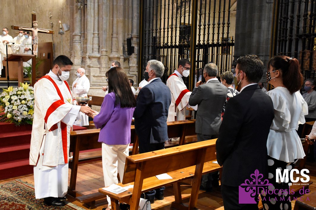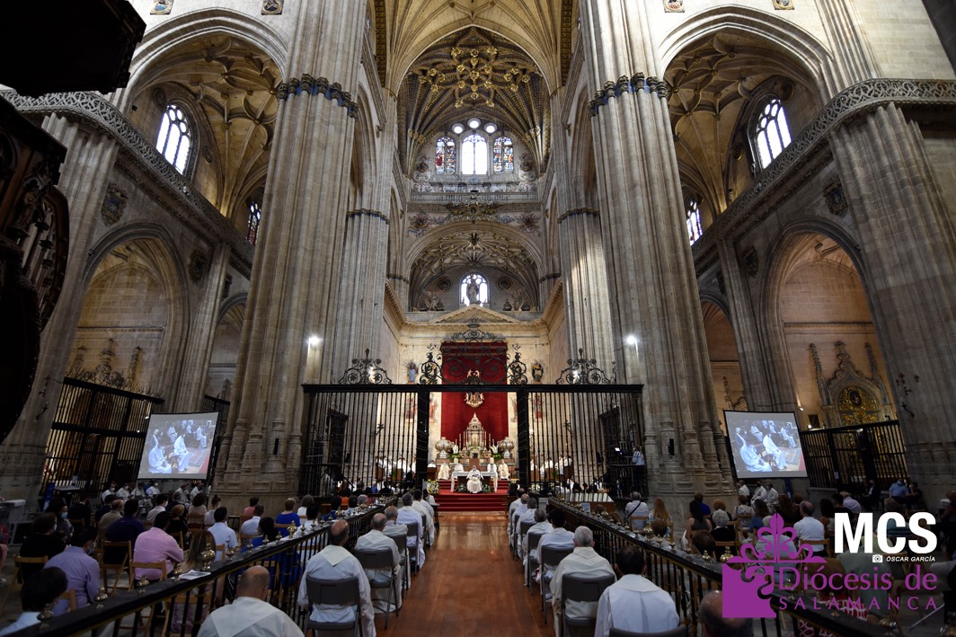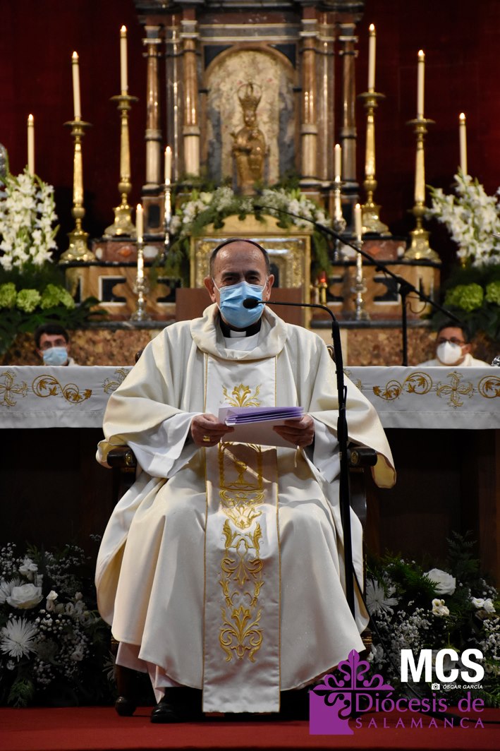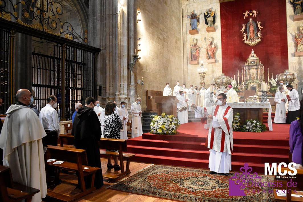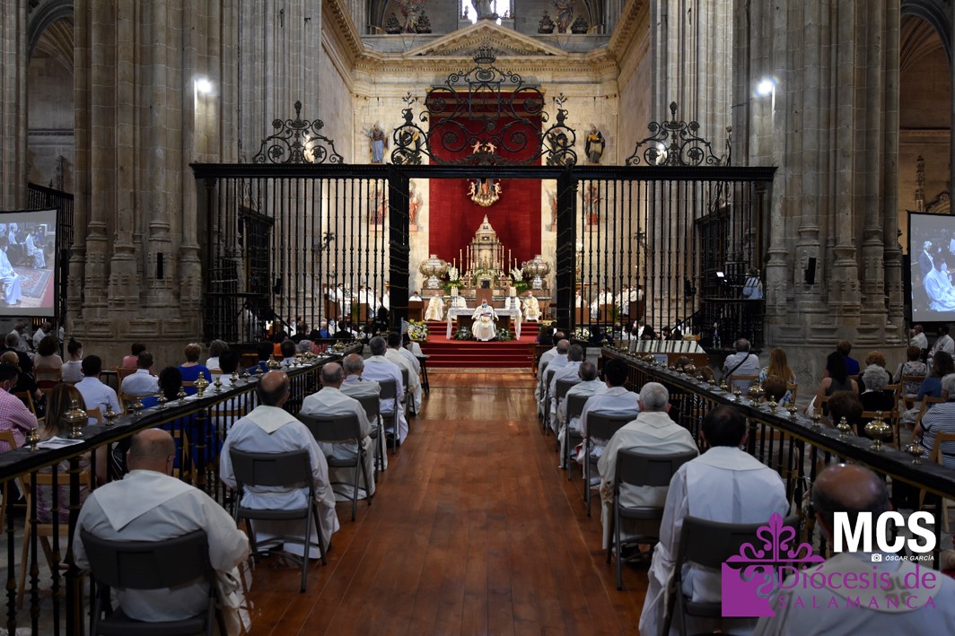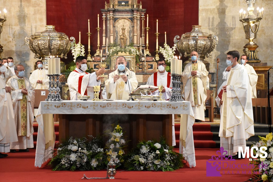 Antes de concluir la celebración, el obispo impartió su bendición solemne a los nuevos diáconos y al presbítero, así como al pueblo de Dios. La Santa Misa concluyó entonando el himno a la patrona de la Diócesis y ciudad de Salamanca, la Virgen de la Vega.