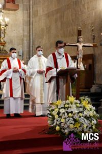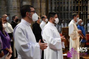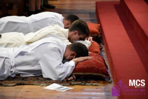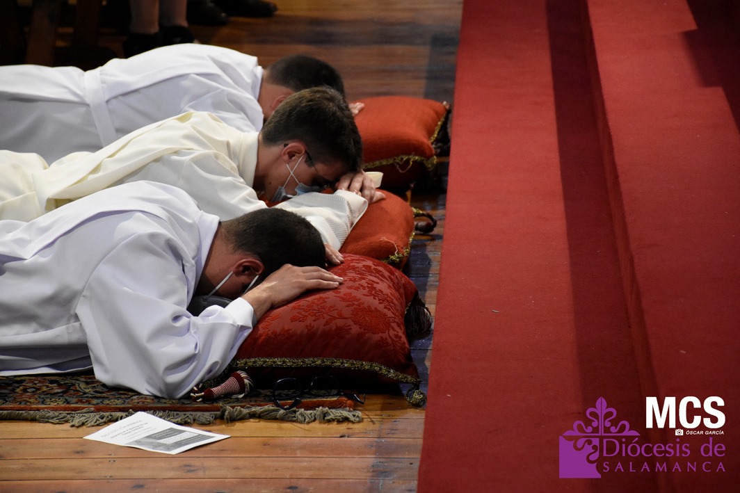 A continuación, se entonaron las letanías ante una Catedral llena de fieles que quisieron acompañar a los nuevos diáconos y al presbítero. En ese momento, los tres se postraron en el suelo como signo de humildad, súplica y disponibilidad para recibir el ministerio que se les ha confiado. Una vez finalizadas las letanías, el obispo se levantó y realizó una oración ante ellos, postrados en el suelo.