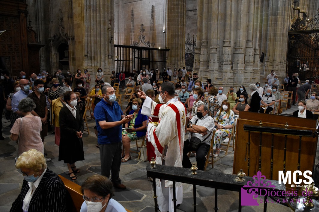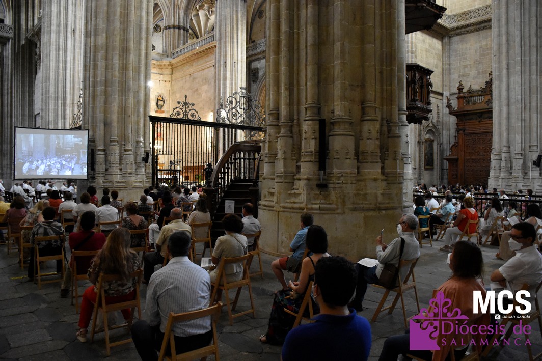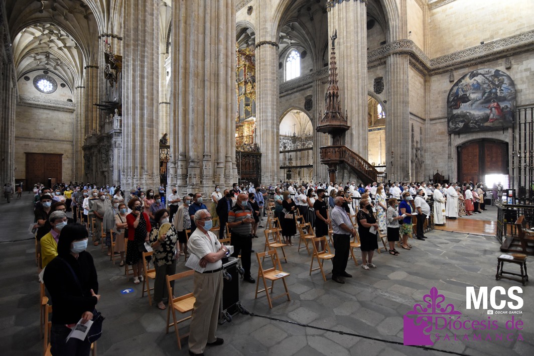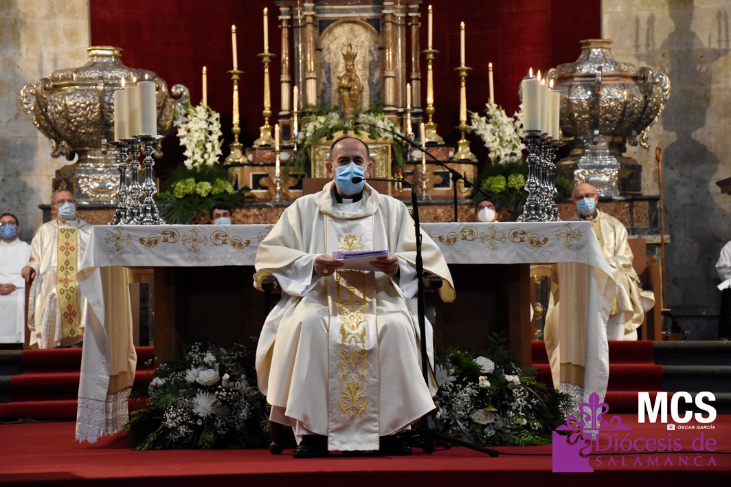 La celebración, presidida por el obispo de la Diócesis de Salamanca, Carlos López Hernández, comenzó con la procesión desde la sacristía y hasta el presbiterio. Durante el recorrido, el coro de Sancti Spíritus, entonó el canto de entrada Pueblo de Reyes.