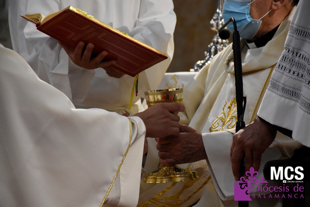 cruzada, y la dalmática, de color blanco y rojo. Por último, el obispo les hizo entrega del libro de los evangelios, con el encargo de predicar la Palabra de Dios. En primer lugar, a Alfonso, y después a Ciriaco.