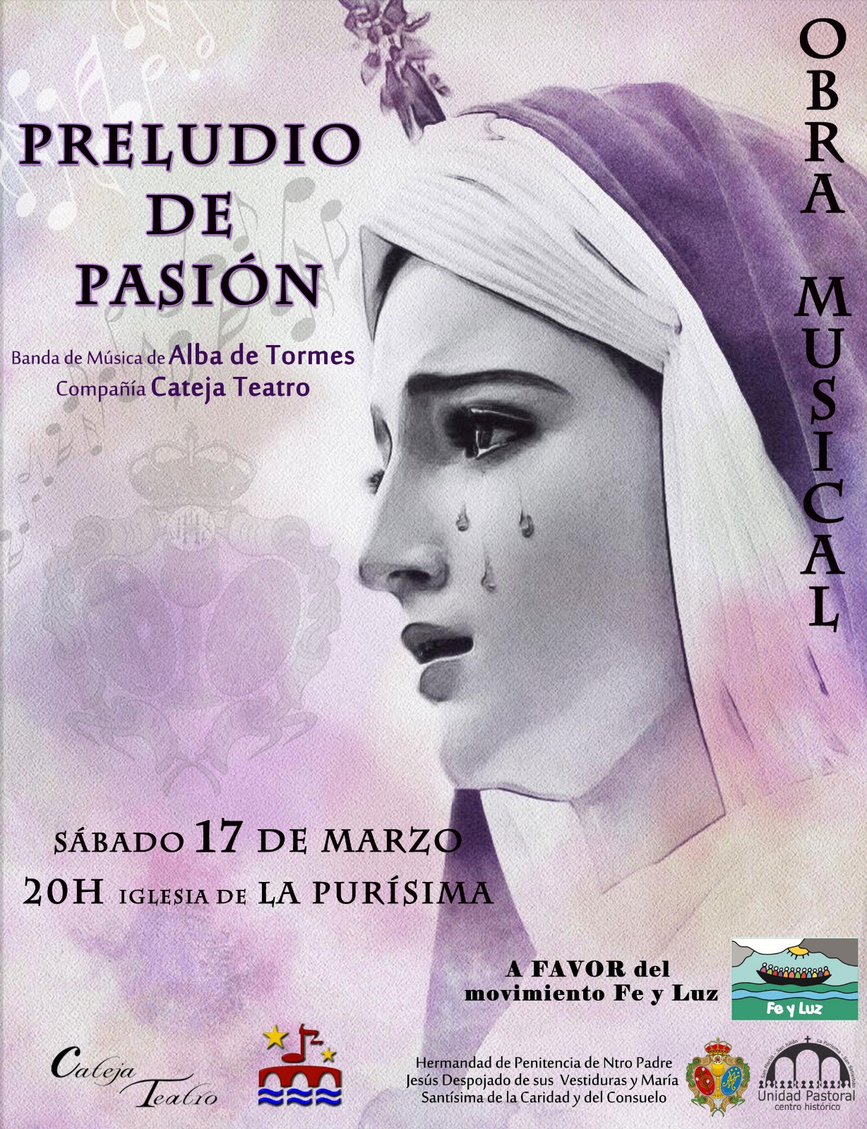 El próximo sábado 17 de Marzo, tendrá lugar una obra musical “Preludio de Pasión” a favor del movimiento FE Y LUZ que se va a celebrar a las 20:00h . en la Parroquia de la Purísima organizada por la Hermandad Jesús Despojado.