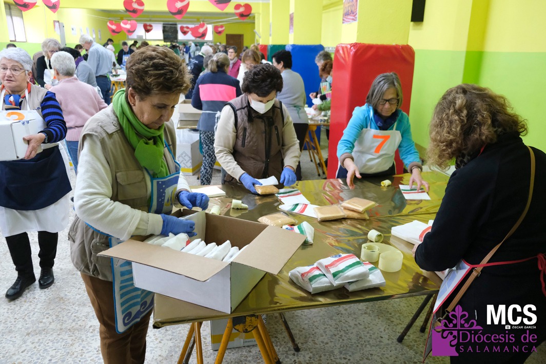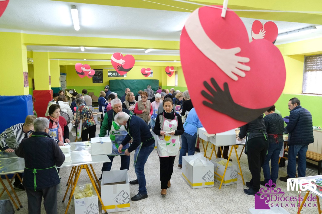 Desde hace 20 años, la logística de este día se centra en el Colegio de los Trinitarios, donde preparan el reparto desde las seis de la mañana. En esta ocasión, para la preparación de 16.000 pedidos han contado con la colaboración de 72 voluntarios de diferentes edades: universitarios, jubilados, socios y simpatizantes de Manos Unidas, entre otros.