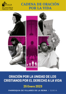 La Delegación diocesana de Familia y Vida continúa promoviendo su cadena una cadena mensual de oración por la vida. Esta cadena se celebra el día 25 de cada mes, por una intención concreta de oración. En este primer mes del año, en el que también se celebra la Semana de Oración por la Unidad de los Cristianos, desde la Delegación de Familia y Vida invitan a orar el 25 de enero por la unidad de los cristianos por el derecho a la vida.