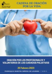 En esta ocasión, la intención de oración propuesta por esta Delegación es orar por los profesionales y voluntarios de los cuidados paliativos y tendrá lugar el sábado, 25 de febrero, a las 12:00 horas en la parroquia de Lourdes. El encuentro comenzará con la celebración de la eucaristía, al finalizar todos los asistentes rezarán juntos una oración por la vida que difunde cada mes Familia y Vida.