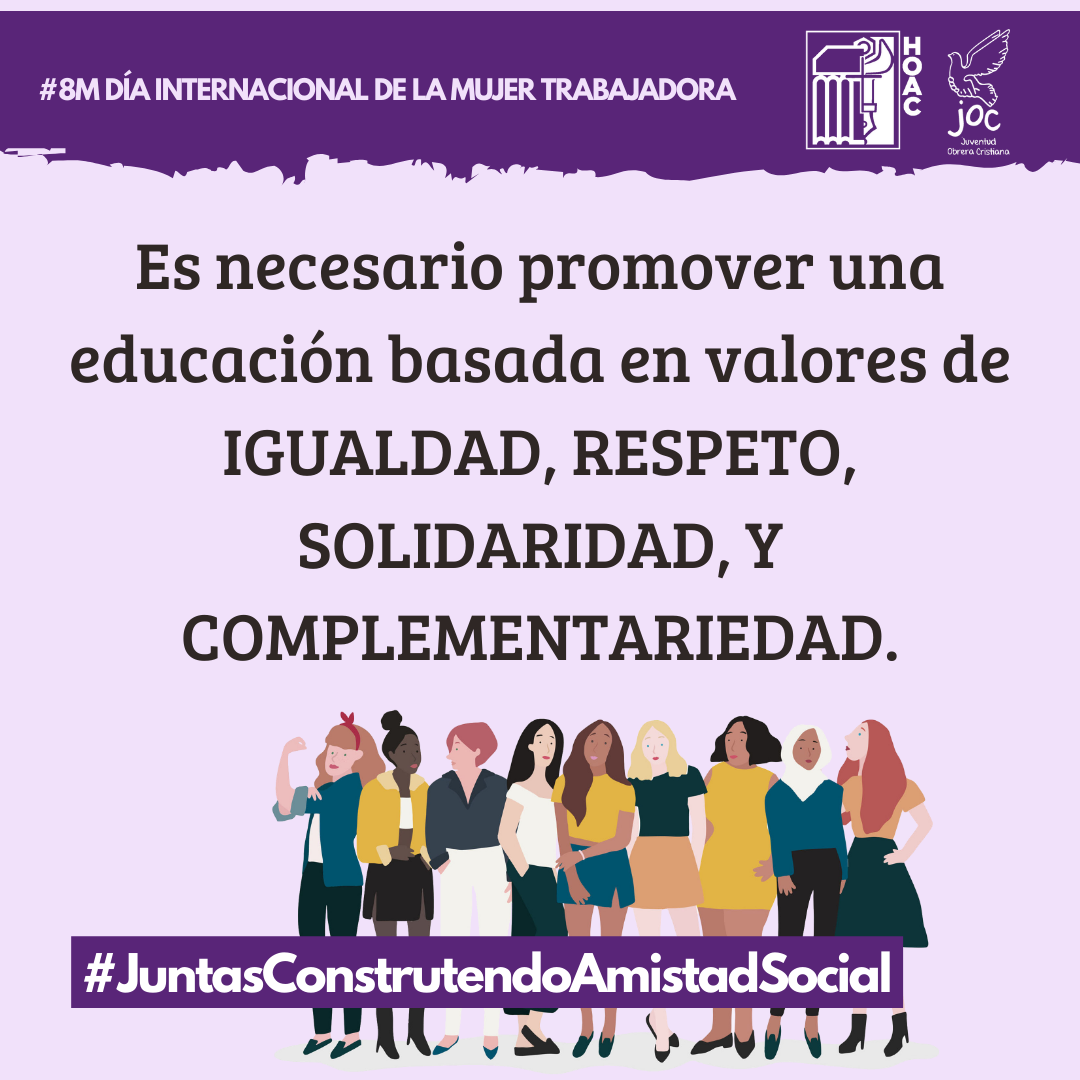 Entienden que para que se extienda la corresponsabilidad, es necesario “promover una educación basada en valores de igualdad, respeto, solidaridad y complementariedad”. Además, apuestan por un profundo cambio del modelo económico y cultural que posibilite que todas las mujeres tengan derecho a un trabajo digno.