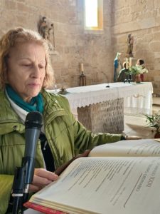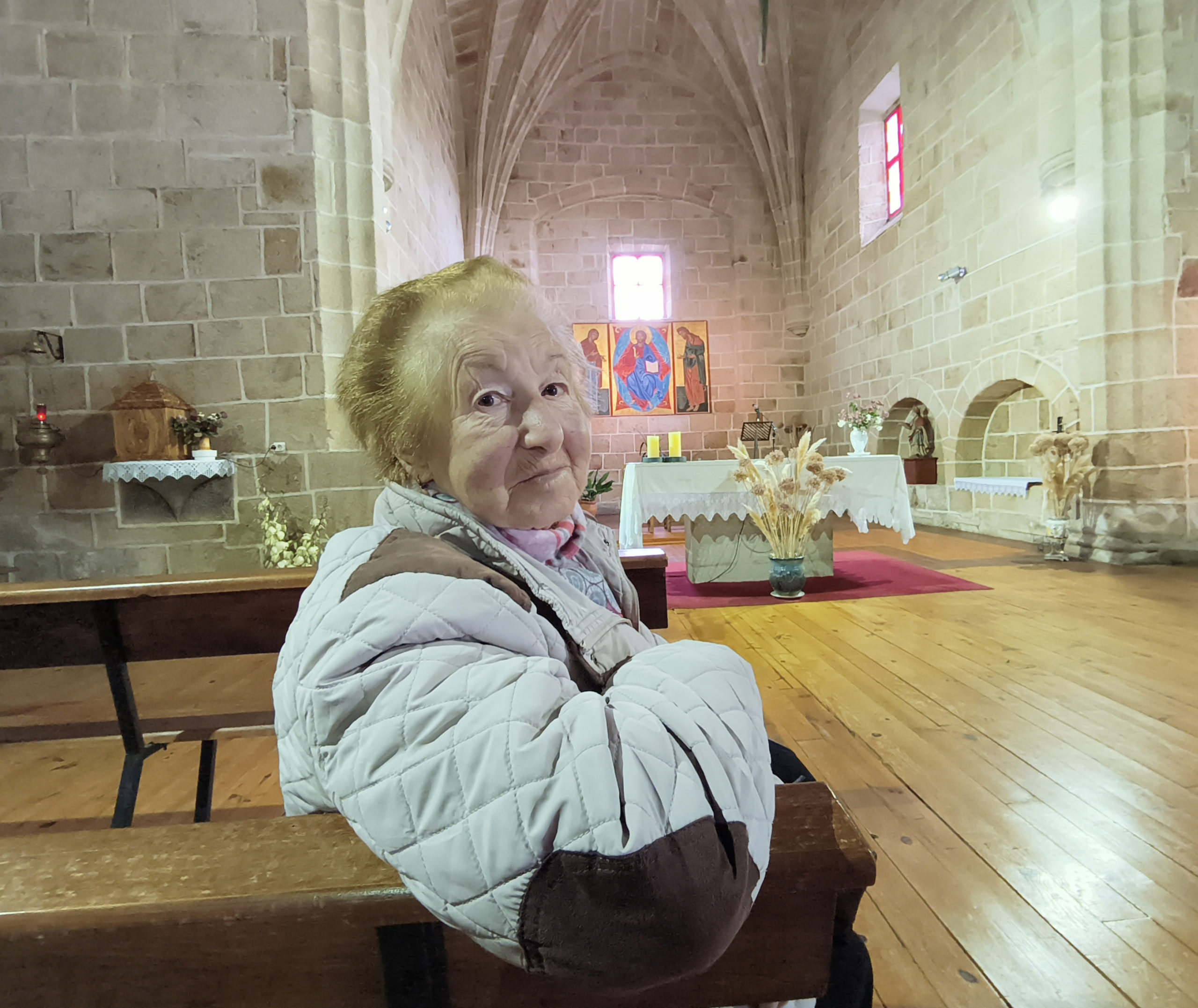 Angelines Martín también es de Pereña, donde vive todo el año, y una de sus tareas es la de celebrante de la Palabra. Además, es ministra extraordinaria de la comunión y la lleva a los mayores de la residencia y a los que no pueden salir de sus casas. “También he sido catequista de los niños de comunión y confirmación”, relata. Ella siente que sigue “el camino de Jesús“, y que siempre ha estado en la Iglesia”. A Angelines la fe le ayudó a salir adelante cuando se quedó viuda a los 36 años con sus dos hijos pequeños. Ella es feliz en su tarea pastoral, ayudando a su párroco, José Ramón Mateos.