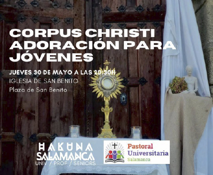 El domingo, 2 de junio, solemnidad del Corpus Christi, Pastoral Universitaria convoca a los jóvenes estudiantes a participar en la solemne eucaristía que presidirá el obispo diocesano, Mons. José Luis Retana, a las 18:00 horas en la Catedral Nueva. Y, posteriormente, se unirán como grupo al cortejo procesional del Corpus que partirá desde la Catedral y recorrerá el casco histórico de Salamanca.
