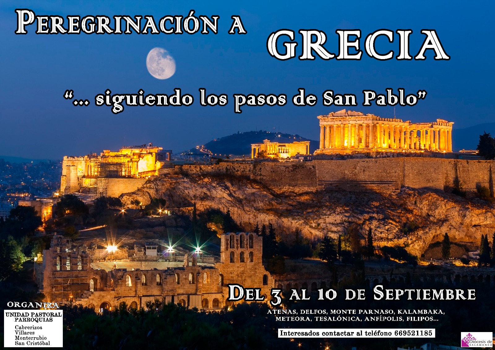 El Servicio diocesano de Peregrinaciones junto con la Unidad pastoral de Cabrerizos, Villares de la Reina, San Cristóbal y Monterrubio organizan una Peregrinación a Grecia tras las huellas del apóstol San Pablo y los orígenes del cristianismo. El viaje tendrá lugar del 3 al 10 de septiembre y está previsto visitar Atenas, Delgos, Monte Parnasos, Meteora, Tesalónica, Corintio,…