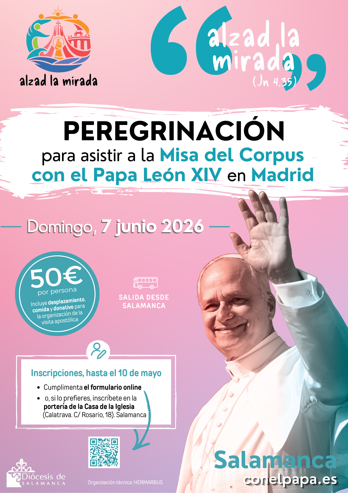 La peregrinación para asistir a la Misa del Corpus que presidirá el Papa León XIV en Madrid está abierta a toda la comunidad diocesana: laicos, familias, sacerdotes y personas consagradas, movimientos, asociaciones,… Se realizará en autobús, con salida desde Salamanca en la madrugada del domingo 7 de junio, con la antelación necesaria para llegar a tiempo a la celebración. El regreso está previsto para esa misma tarde.