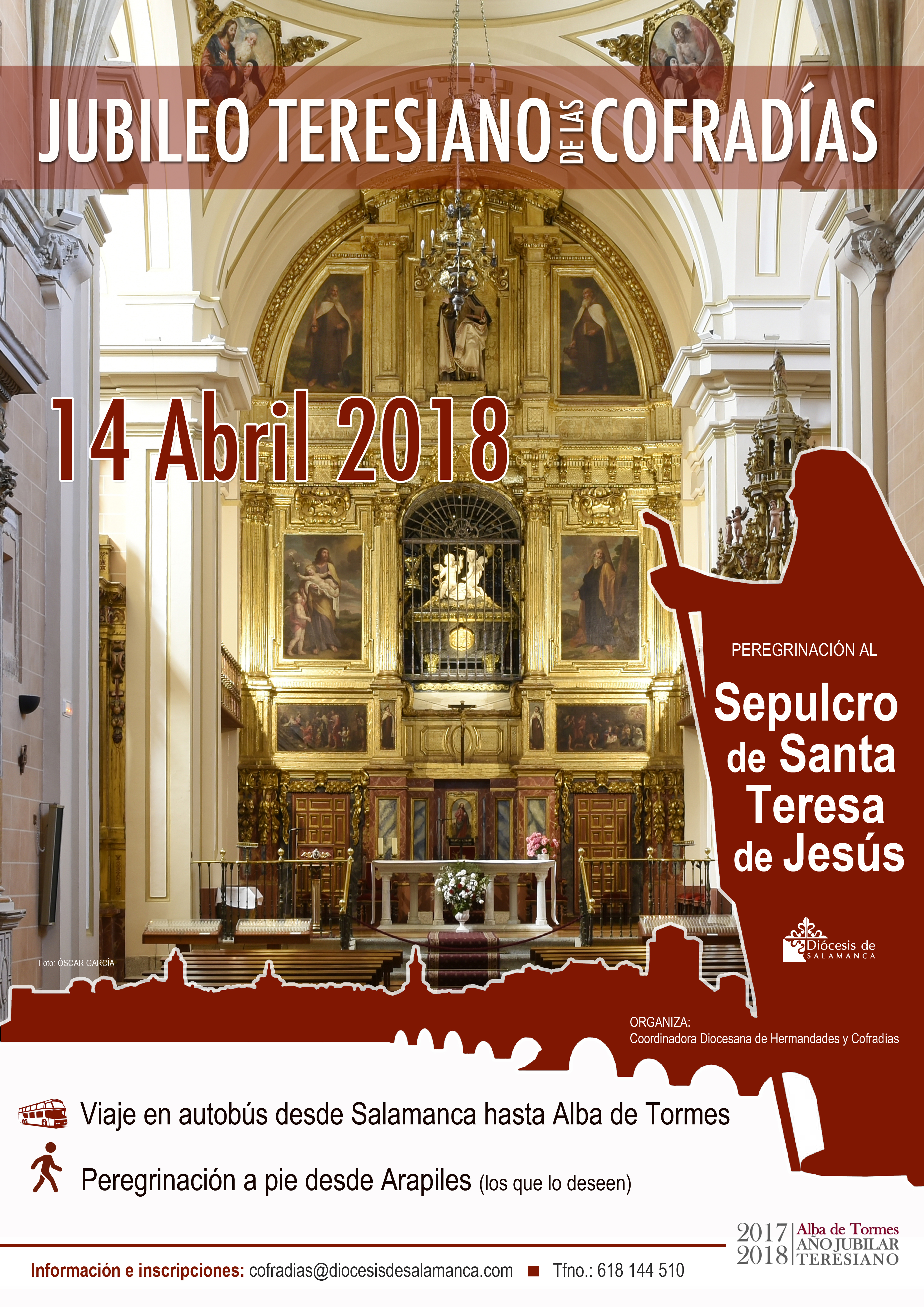 Con ocasión del Año Jubilar Teresiano la Coordinadora diocesana de Hermandades y Cofradías de Salamanca organiza para el 14 de abril una peregrinación al Santo Sepulcro de Santa Teresa de Jesús que se encuentra en la iglesia de La Anunciación de las Madres Carmelitas de Alba de Tormes. Una jornada de oración, fraternidad y acción de gracias para obtener la gracia jubilar.