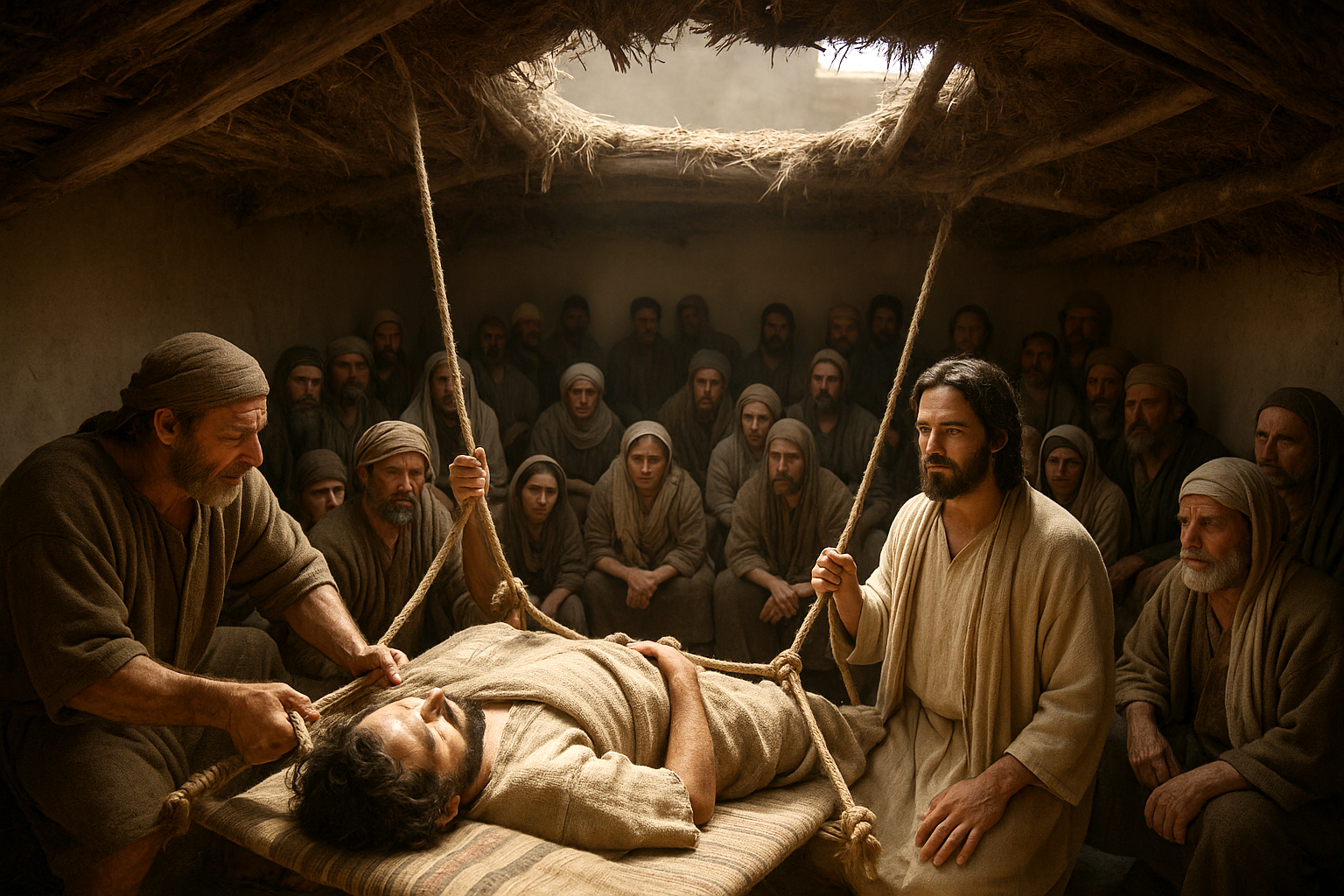En segundo lugar, aparece un paralítico llevado en camilla por cuatro amigos, o en todo caso, cuatro hombres a los que les tocaba, o lo habían elegido ellos, ayudar y cuidar al paralítico. Dice el texto: “viendo la fe que tenían”. Y es que Jesús era capaz de saber lo que había dentro de cada hombre; Jesús se centra en adivinar las malas intenciones de los malos, pero Marcos en este episodio, da cuenta de la fe de los cuatro en plan práctico y concreto: transportaban al paralítico, intentaron meterle por la puerta, subieron al techo de la casa, rompieron la techumbre, descolgaron al enfermo, camilla incluida… y una vez que el amigo enfermo carga con la camilla y se va a su casa, los cuatro dejan de ser protagonistas y desaparecen de la escena… o tal vez no, como más adelante intentaremos adivinar. Sea como fuere, los cuatro representan a la comunidad eclesial que, con sus defectos, actuando expeditivamente, o sea, a lo bruto, sí o sí, consiguen acercar al enfermo hasta Jesús, cosa que parecía imposible. Lo que Jesús constató, el buen corazón de los cuatro, es que los cuatro demostraron con los hechos tener fe. Imagino que no les hizo gracia tener que romper la techumbre, pero el objetivo, acercar al enfermo a Jesús, lo cumplieron. Supieron priorizar lo importante, asumiendo los efectos colaterales, o sea, el estropicio de la techumbre y la sorpresa, incluso el enfado de los que tuvieron que dejar de escuchar a Jesús por el barullo que se armó.