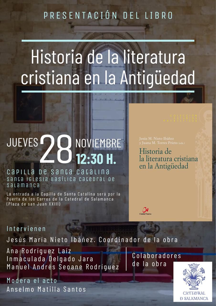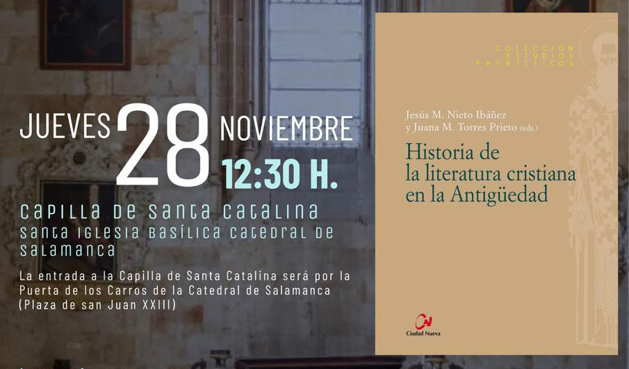 Este jueves, 28 de noviembre, se presentará en Salamanca el libro Historia de la literatura cristiana en la Antigüedad, editado por Ciudad Nueva, una obra pionera por ser el primer manual sobre esta temática escrito íntegramente por autores españoles. La presentación tendrá lugar a las 12:30 horas en la capilla Santa Catalina de la Catedral Vieja y contará con la intervención de Jesús María Nieto Ibáñez, uno de los coordinadores del libro, y de los profesores Ana Rodríguez Laíz, Inmaculada Delgado Jara y Manuel Andrés Seoane Rodríguez, quienes han participado como colaboradores. El acto será moderado por Anselmo Matilla Santos.