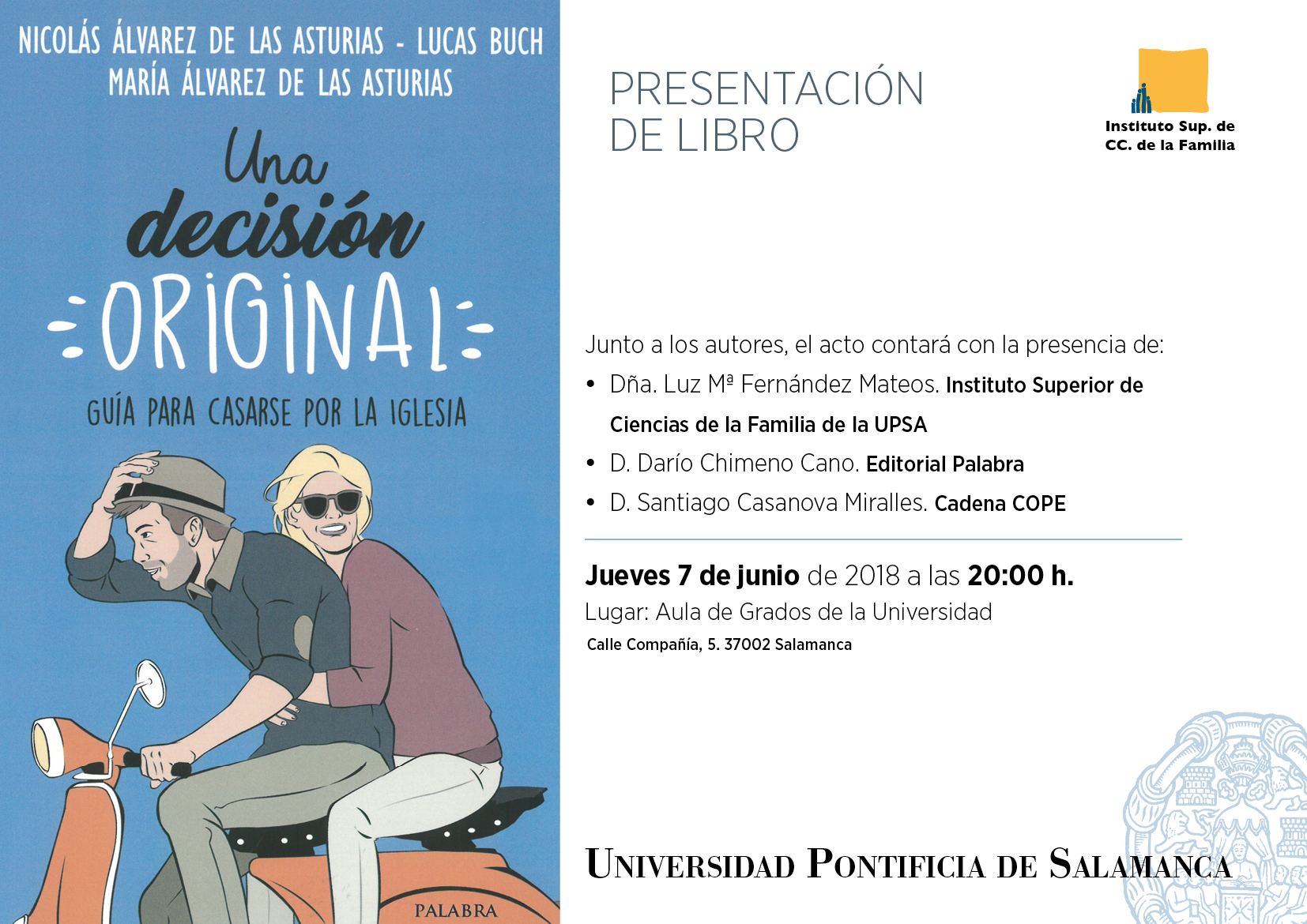 El jueves 7 de junio, a las 20.00 horas, se presenta en el Aula de Grados de la Universidad Pontificia de Salamanca el libro: “Una decisión original. Guía para casarse por la Iglesia”, editado por Palabra. En el acto, organizado por el Instituto Superior de Ciencias de la Familia de la UPSA, van a intervenir dos de sus autores: el sacerdote Nicolás Álvarez de las Asturias y la abogada y canonista María Álvarez de las Asturias, directora del Instituto de orientación personal y familiar “Coincidir”, que se dedica a la formación de matrimonios, padres, profesores y sacerdotes. Además contará con la presencia de Luz Mª Fernández, directora del Instituto Superior de la Familia de la UPSA; Darío Chimeno Cano, de la editorial Palabra y Santiago Casanova, colaborador en el Servicio diocesano de MCS.