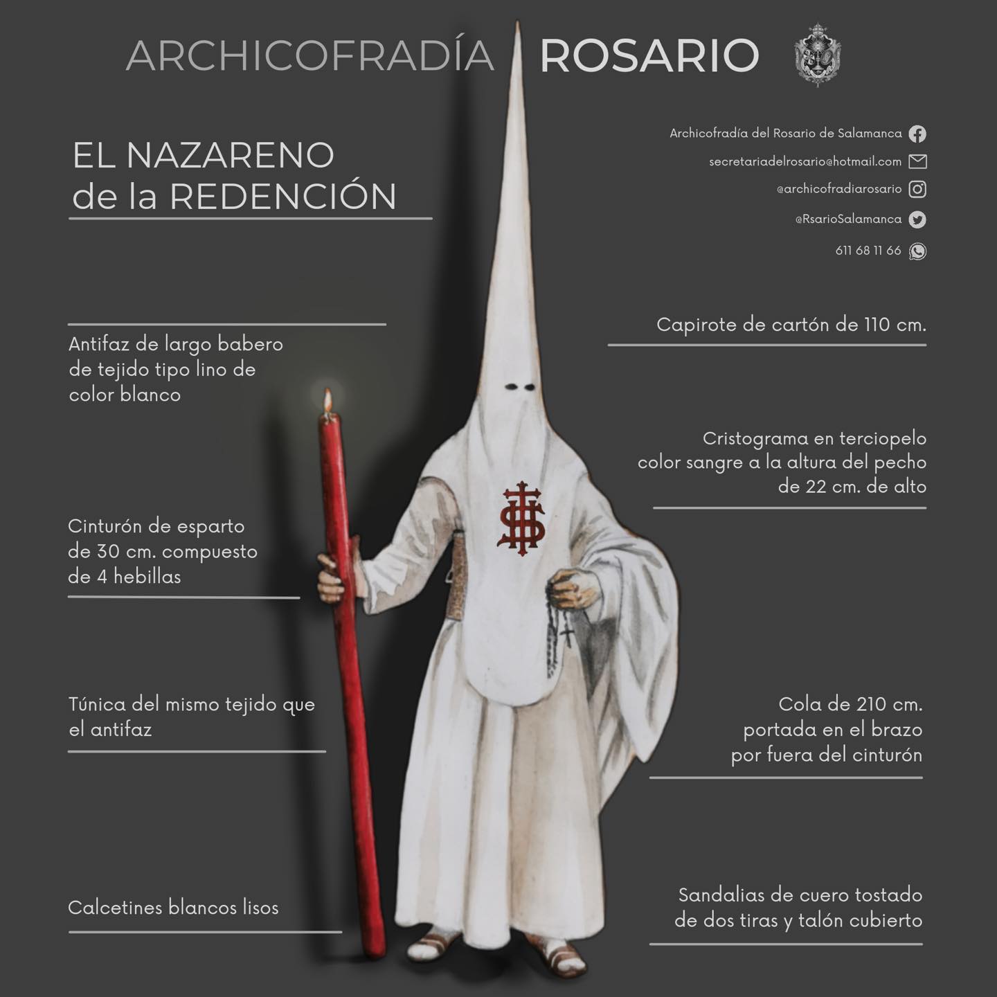 Además, en el centro del pecho llevan un cristograma, “representando el nombre de Jesús, es mi Salvador, Jesús Salvador de los hombres, en color granate, y se eligió ese símbolo por ser sencillo y reconocible”, asegura.  El hábito lo completa un capirote de 110 centímetros, el cinturón de esparto y las sandalias.