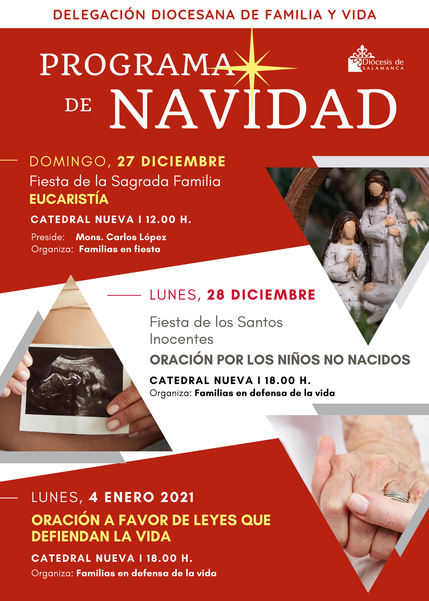 El último domingo del año, el 27 de diciembre, en el marco de las fiestas de Navidad, se celebra la Jornada de la Sagrada Familia con una invitación especial a poner nuestra mirada en la familia de Nazaret, Jesús, María y José, modelo y luz para todas las familias. En este día la Delegación diocesana de Familia invita a las familias salmantinas a participar en la eucaristía que dará comienzo, a las 12.00 del mediodía, en la Catedral nueva y en la que el obispo de Salamanca, Carlos López Hernández, impartirá la bendición a todas las familias que allí se congreguen.