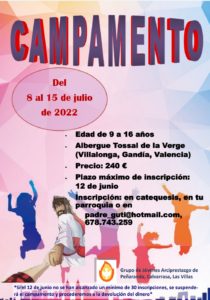 CAMPAMENTO DEL ARCIPRESTAZGO DE PEÑARANDA-CALVARRASA-LAS VILLAS. Un año más, el grupo de jóvenes de este arciprestazgo promueve un campamento dirigido a niños y adolescentes, de 9 a 16 años. Tendrá lugar del 8 al 15 de julio en el alberge Tossal de la Verge, en Villalonga (Valencia). El precio de esta actividad es de 240 euros y los interesados deben inscribirse antes del 12 de junio, comunicándolo en las parroquias del arciprestazgo o bien remitiendo un e-mail a padre_guti@hotmail.com, o llamando al teléfono 678 743 259.