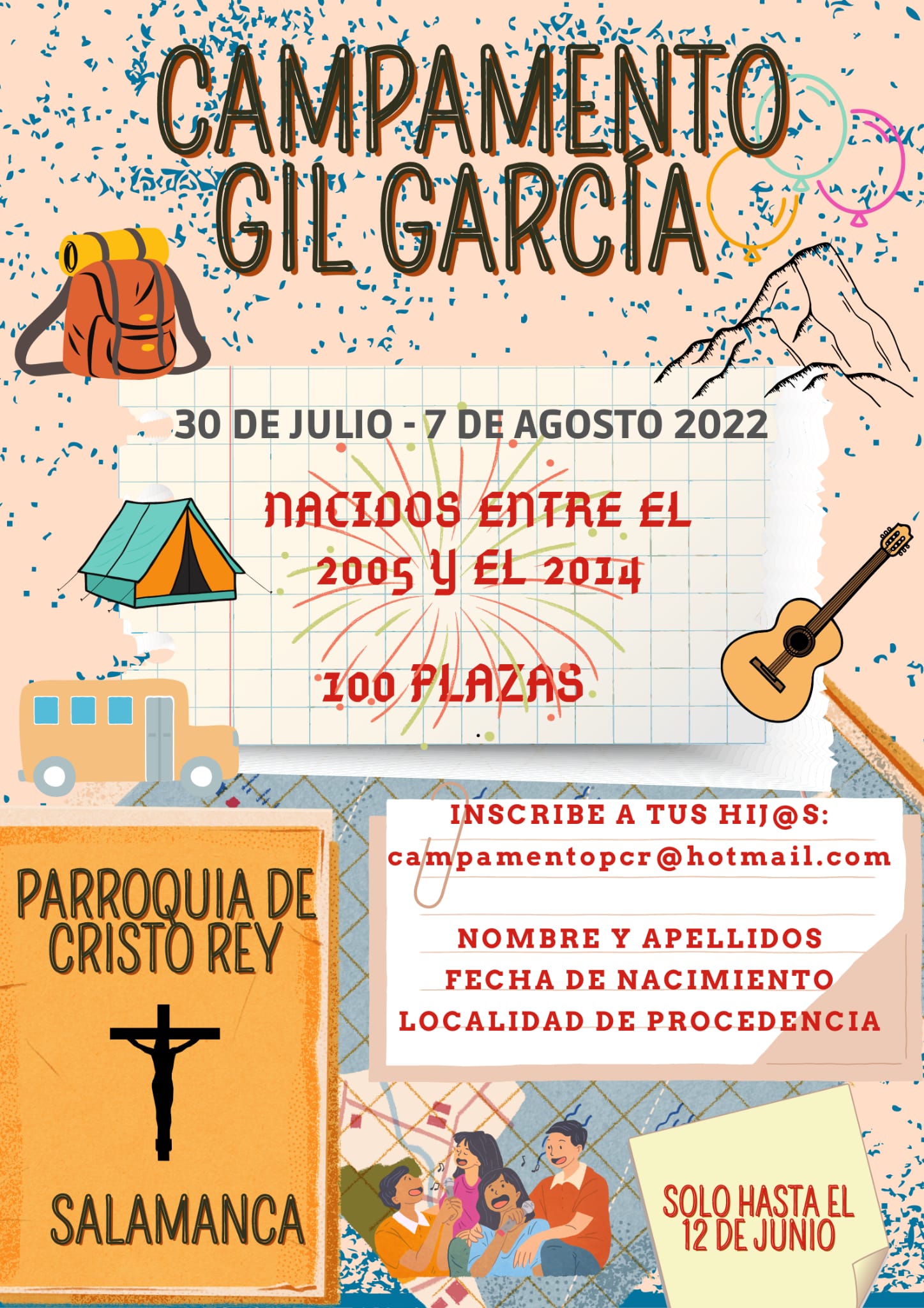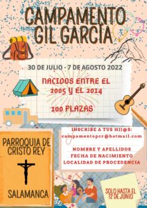 CAMPAMENTO EN GIL GARCÍA. Desde hace años la parroquia de Cristo Rey, de Salamanca, organiza un campamento de verano para chicos y chicas, de 8 a 17 años, en la Sierra de Gredos, concretamente en la localidad de Gil García (Ávila). En esta ocasión, se celebrará del 30 de julio al 7 de agosto y disponen de 100 plazas. Para participar es necesario inscribirse, antes del 12 de junio, remitiendo un e-mail a: campamentopcr@hotmail.com, con los datos personales del niño o niña, junto con su fecha de nacimiento y la localidad de procedencia.