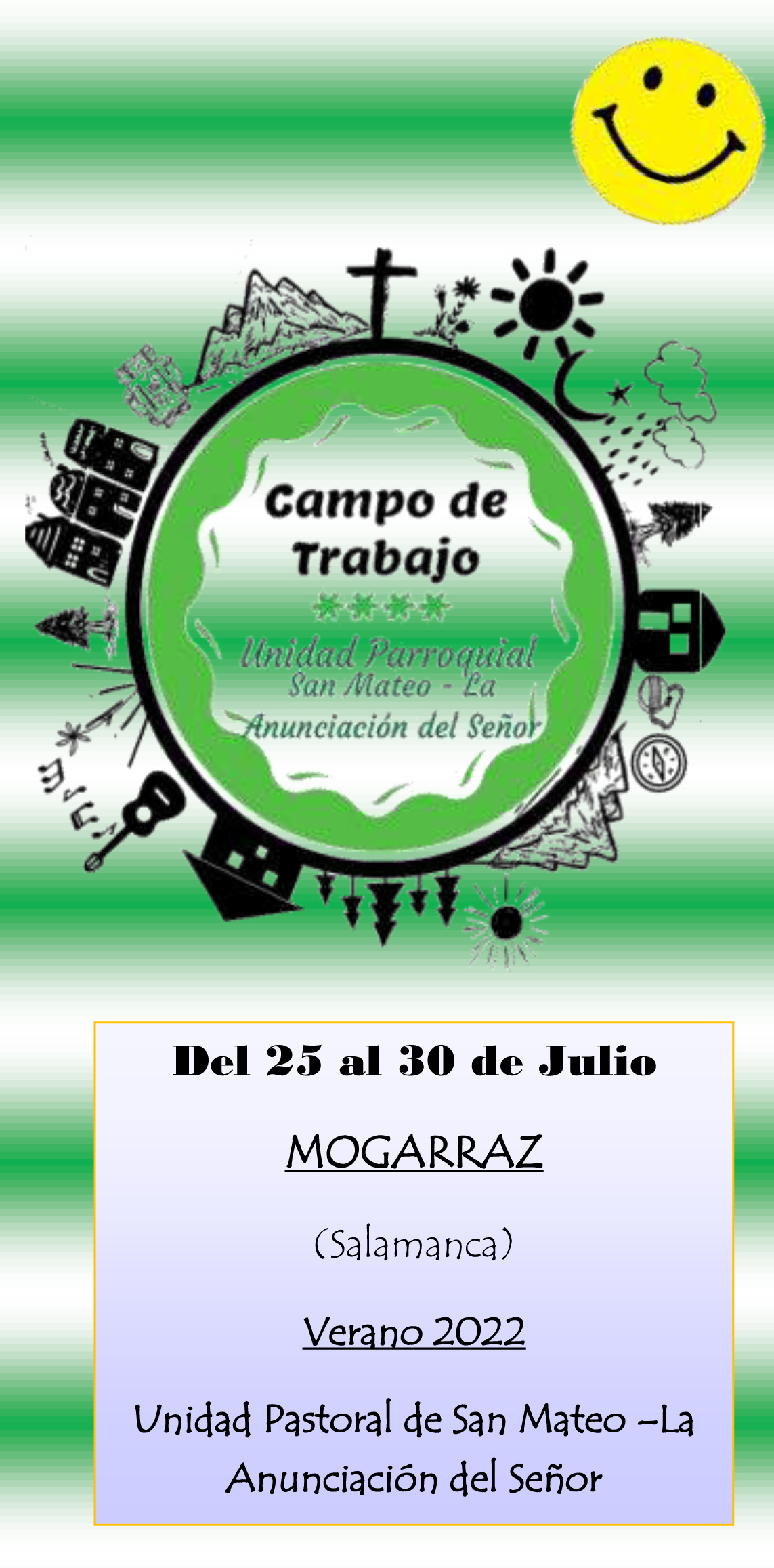 El precio de los campos de trabajo es de 60€. Información e inscripciones en el despacho parroquial (C/ Begonias, 15), de lunes a viernes, de 18:00 a 19:30 horas; en el teléfono: 615 285 665 o bien en el e-mail: nachosanmateo@gmail.com