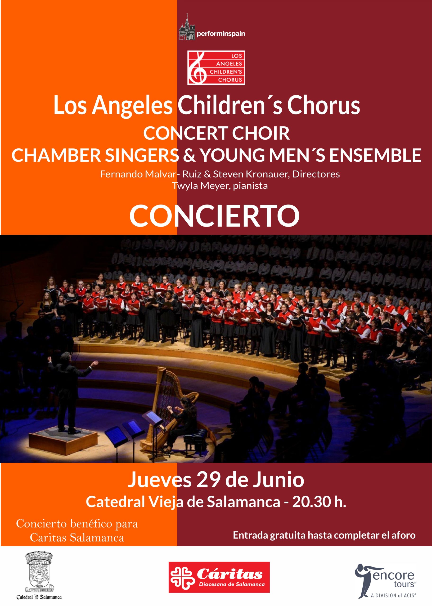 El segundo concierto, de carácter benéfico, tendrá lugar el jueves, 29 de junio, y será ofrecido por la coral Ángeles Children’s Chrorus, dirigida por Fernando Mavar-Riz y Steven Kronauer, y al piano Rwyla Meyer. Éste será el sexto concierto de su gira por España. Al finalizar se recogerán donativos que se destinarán a Cáritas diocesana de Salamanca.