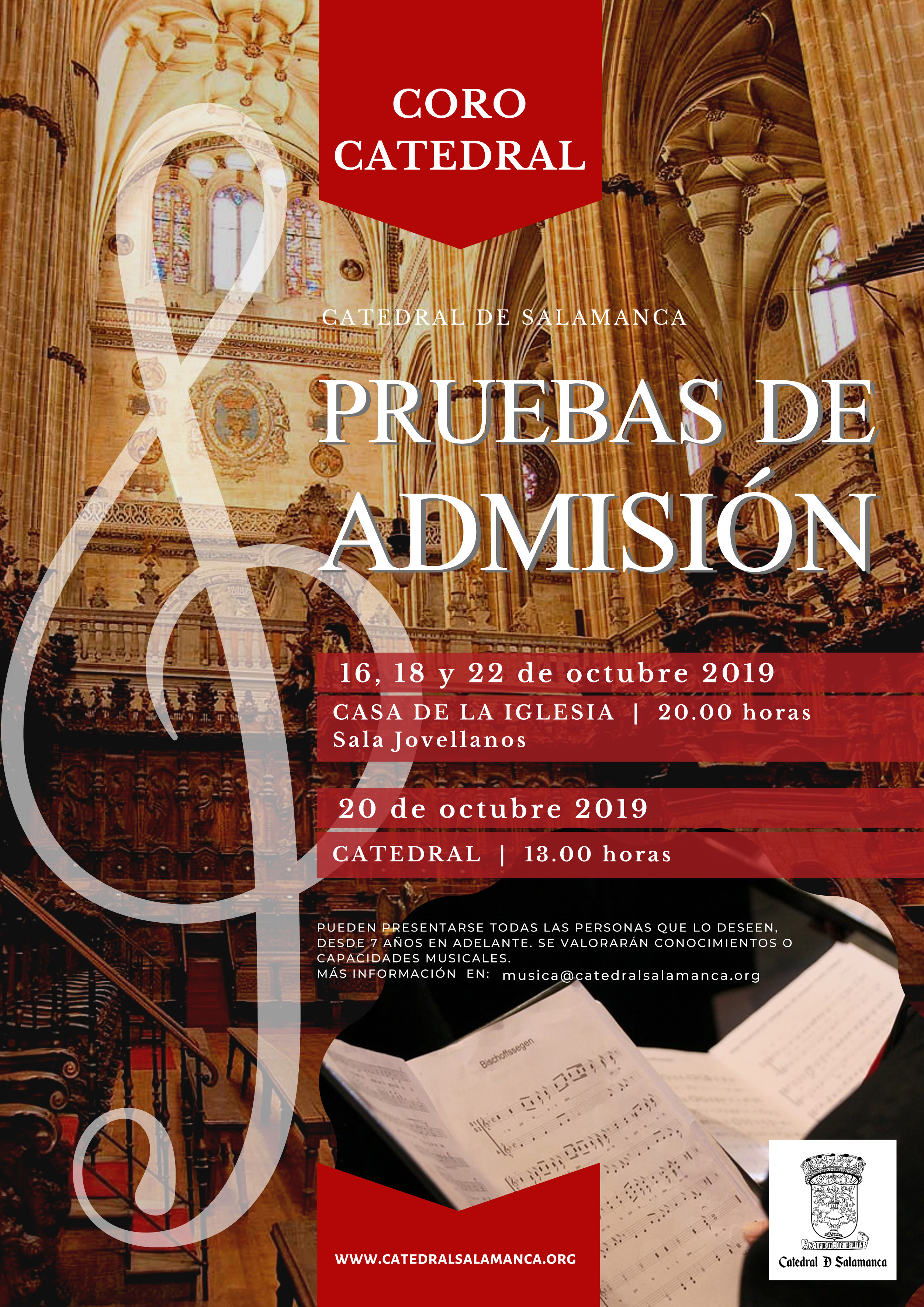 El Cabildo Catedral de Salamanca tiene intención de crear un coro que participe en las celebraciones dominicales del templo, así como en las fiestas y actos solemnes. Por este motivo, los responsables de la música en la Catedral van a llevar a cabo unas pruebas de admisión a las que se pueden presentar todas las personas que lo deseen, desde los 7 años en adelante, con el compromiso de participar en las celebraciones y ensayos. Se valorarán conocimientos o capacidades musicales.